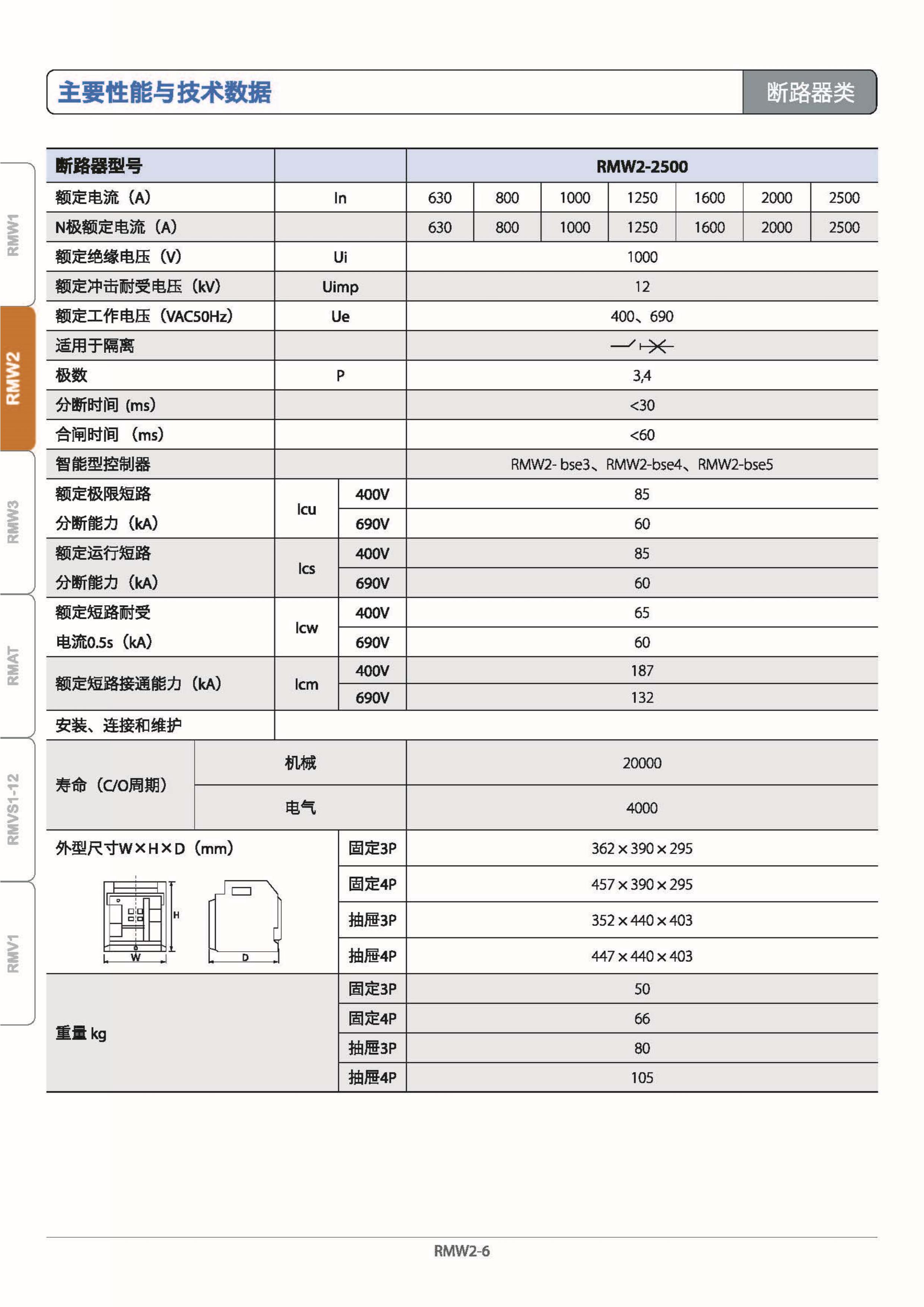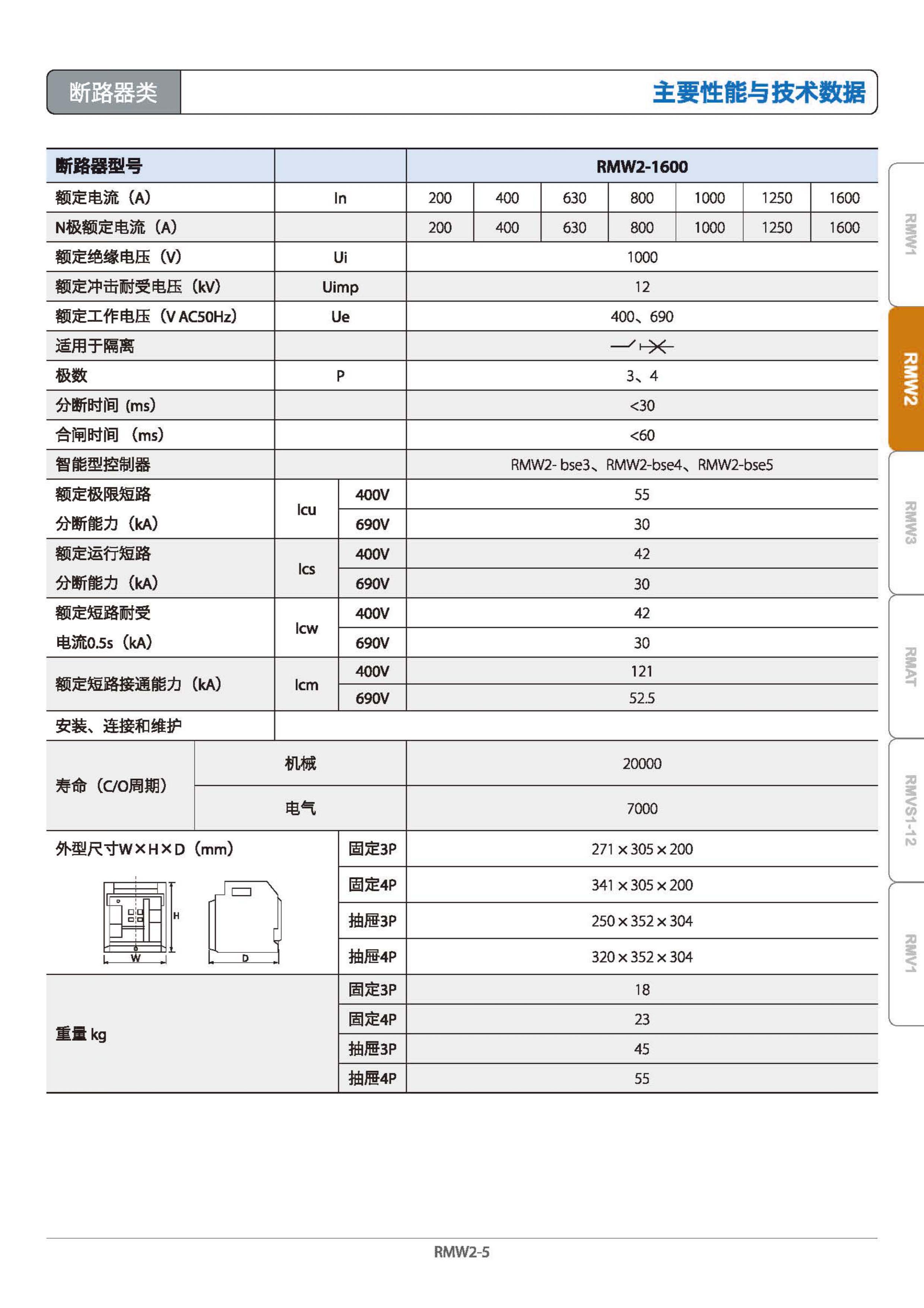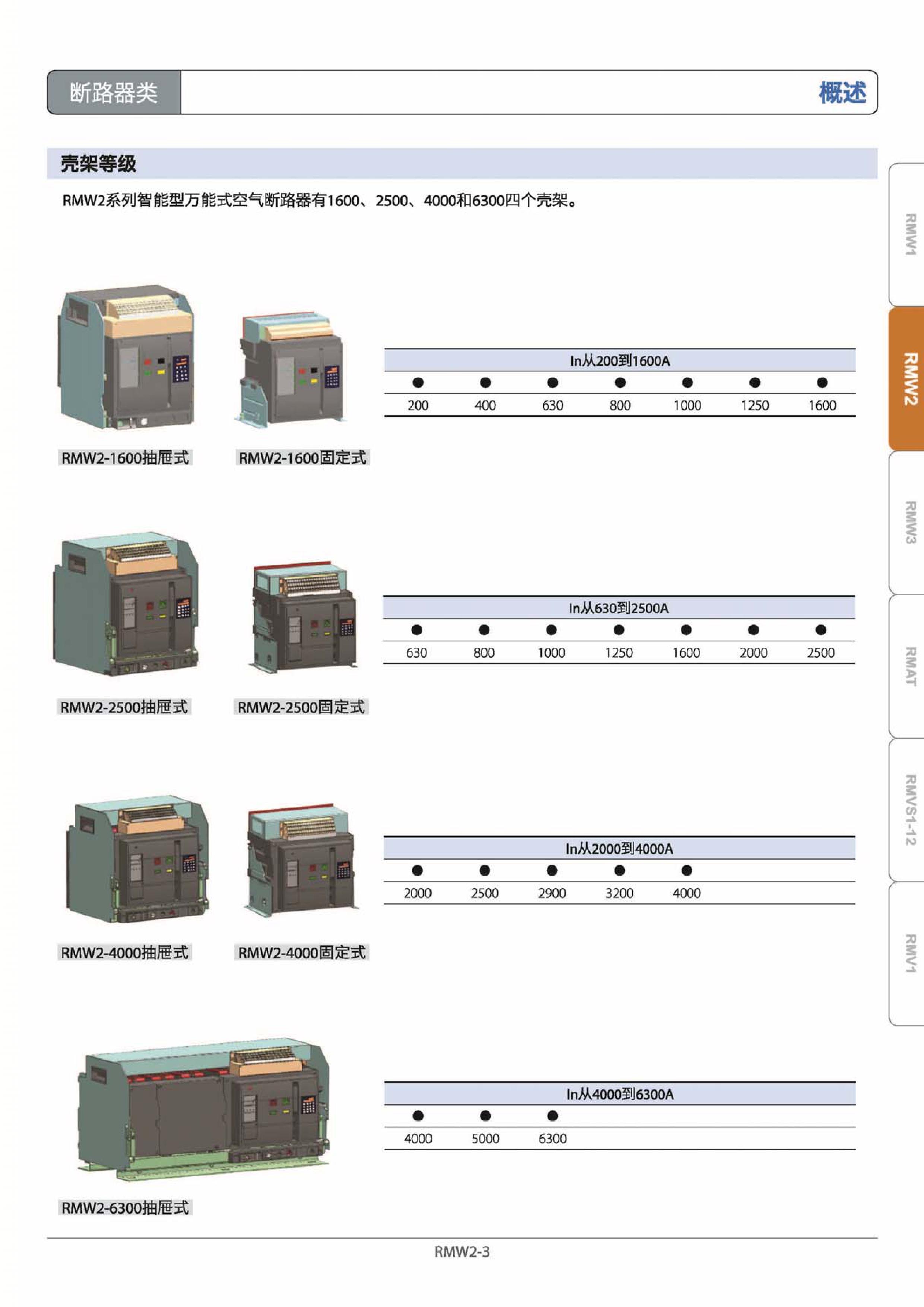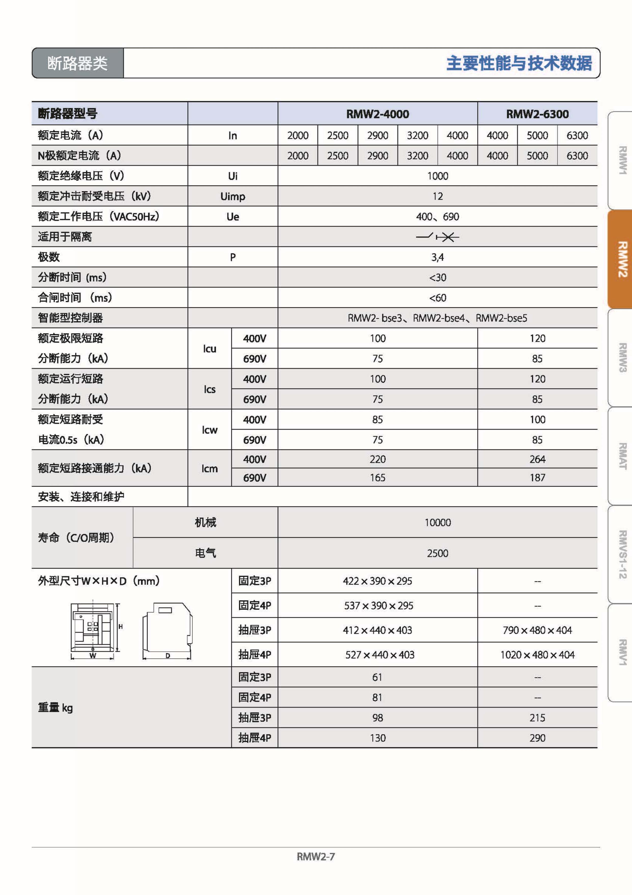 RMW2系列智能型万能式空气断路器是上海人民电器厂的新一代产品。该系列产品设计采用了新技术,进一步增强了产品的性能和安全性。RMW2系列智能型万能式空气断路器适用于额定电压为交流50Hz,400V、690V,额定电流200~6300A,用于分配电能和保护线路、电源及用电设备免受过载、欠电压、短路、漏电、接地等故障的危害;具有较高精度的选择性保护,提高了供电可靠性。额定电流为630A及以下断路器,可以用作在交流50Hz,400V网络中直接操作电动机,作为控制电动机的偶然启动、停止之用。