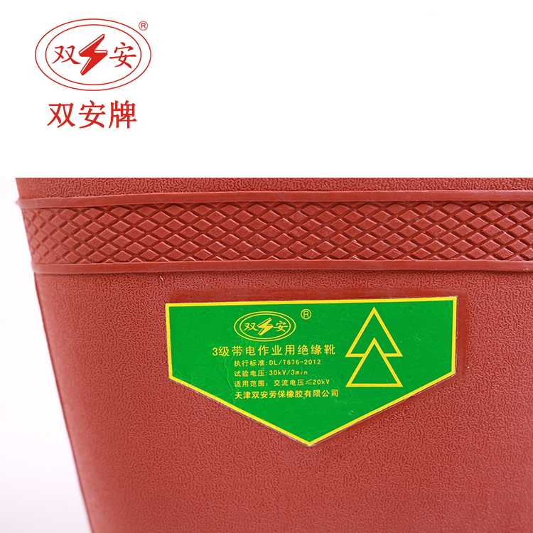 双安牌3级带电作业用绝缘靴,采用天然橡胶,应用注胶工艺,为使用者提供绝缘性能, 柔软轻便,穿着舒适,安全可靠,每件产品出厂前觉经过严格的测试,鞋码为240-280,只有偶码,6双/箱。