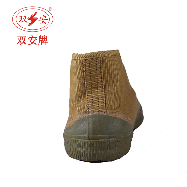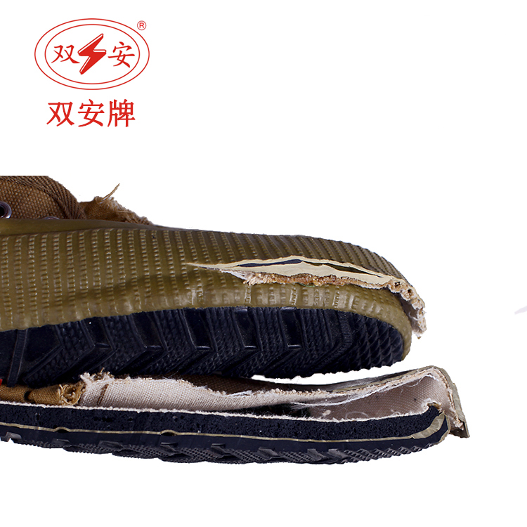 双安牌电绝缘布面胶鞋。鞋帮、鞋里布均以棉布为基材加工而成,围条、包头、大底均用进口3#天然橡胶加工而成。分别为5kV、10kV、15kV等级别,主要适用于工频电压1kV~15kV之间高低压、电器设备作业时为足部防触电辅助安全用具。