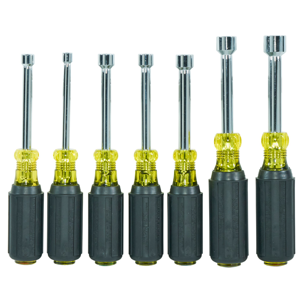 The Klein Tools 7-Piece Magnetic Nut Driver Set features the most popular nut driver sizes and is perfect for a wide variety of applications. These nut drivers have magnetic tips and full hollow shafts that slide easily over long bolts or studs. Klein’s Tip-Ident helps quickly identify the nut driver and size in a tool bag or pouch.