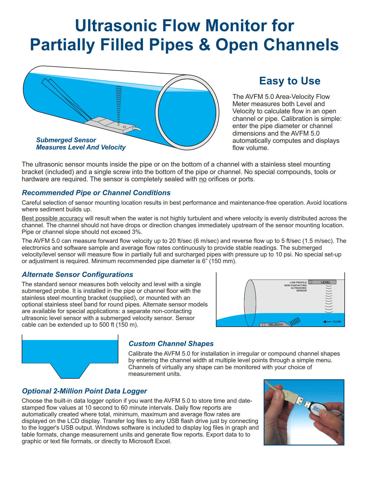 Monitor flow through open channels, partially full sewer pipes and surcharged pipes without a flume or weir. Ideal for stormwater, combined effluent, raw sewage, irrigation water and streams. Calibration is simple: enter the pipe diameter or channel shape and the AVFM 5.0 computes the flow volume and displays the flow rate. Measure forward and reverse flow and calibrate to channels of any shape.
