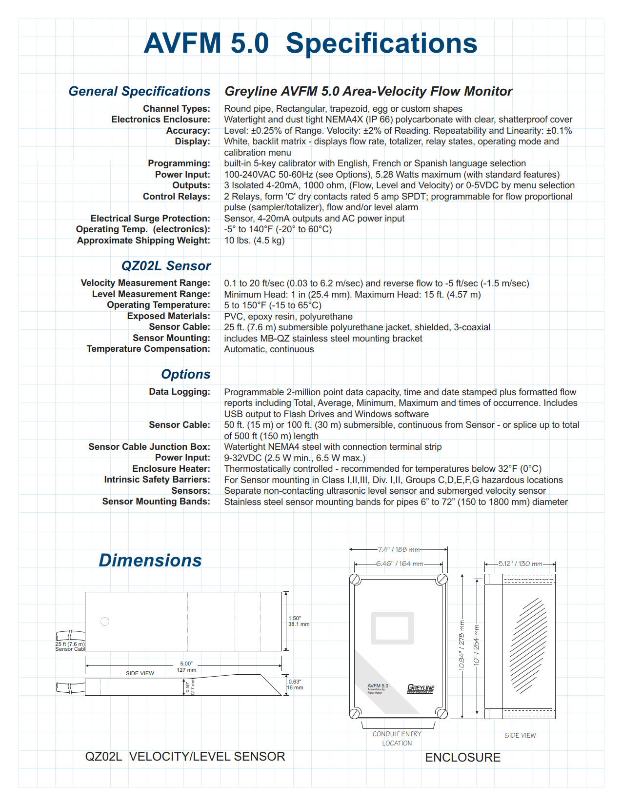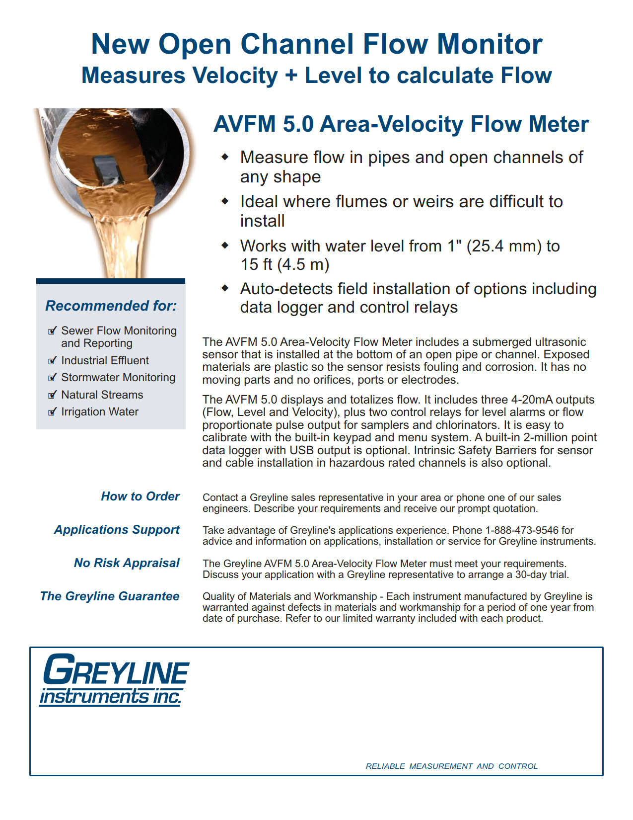Area-Velocity Flow Monitor shall be Greyline Model AVFM 5.0 and warranted against defects in materials and workmanship for one year.