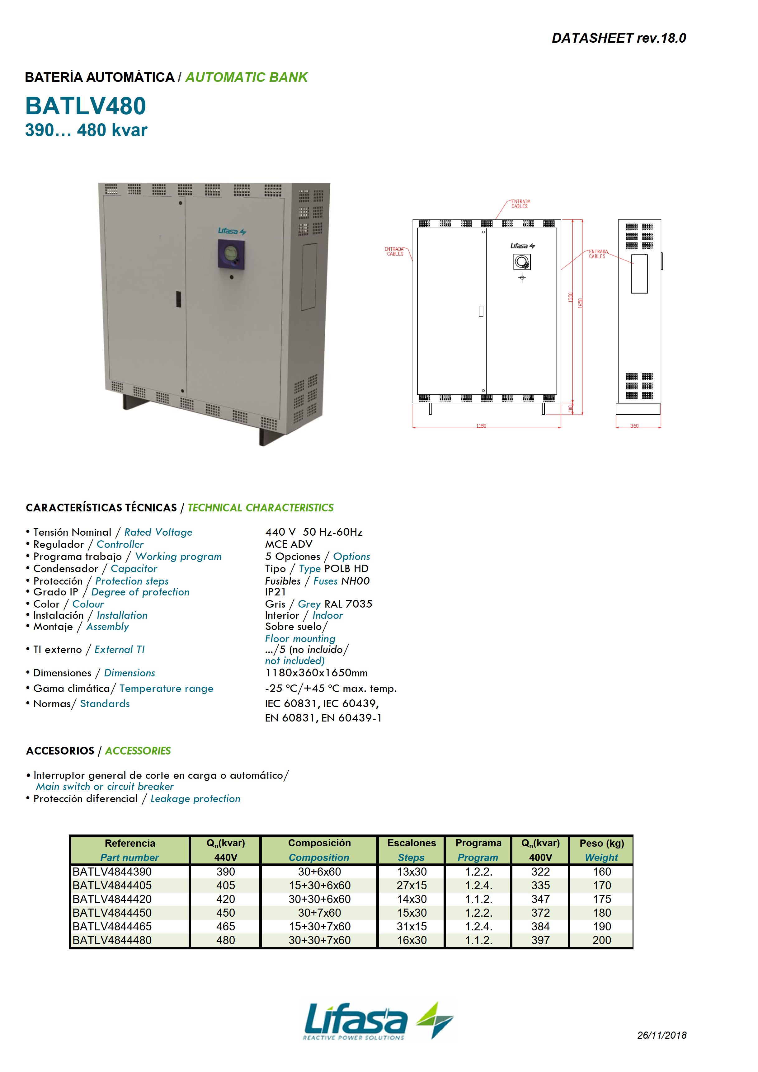 | Part number | Qn(kvar)440V | Composition | Steps | Program | Qn(kvar)400V | Weight(kg) |