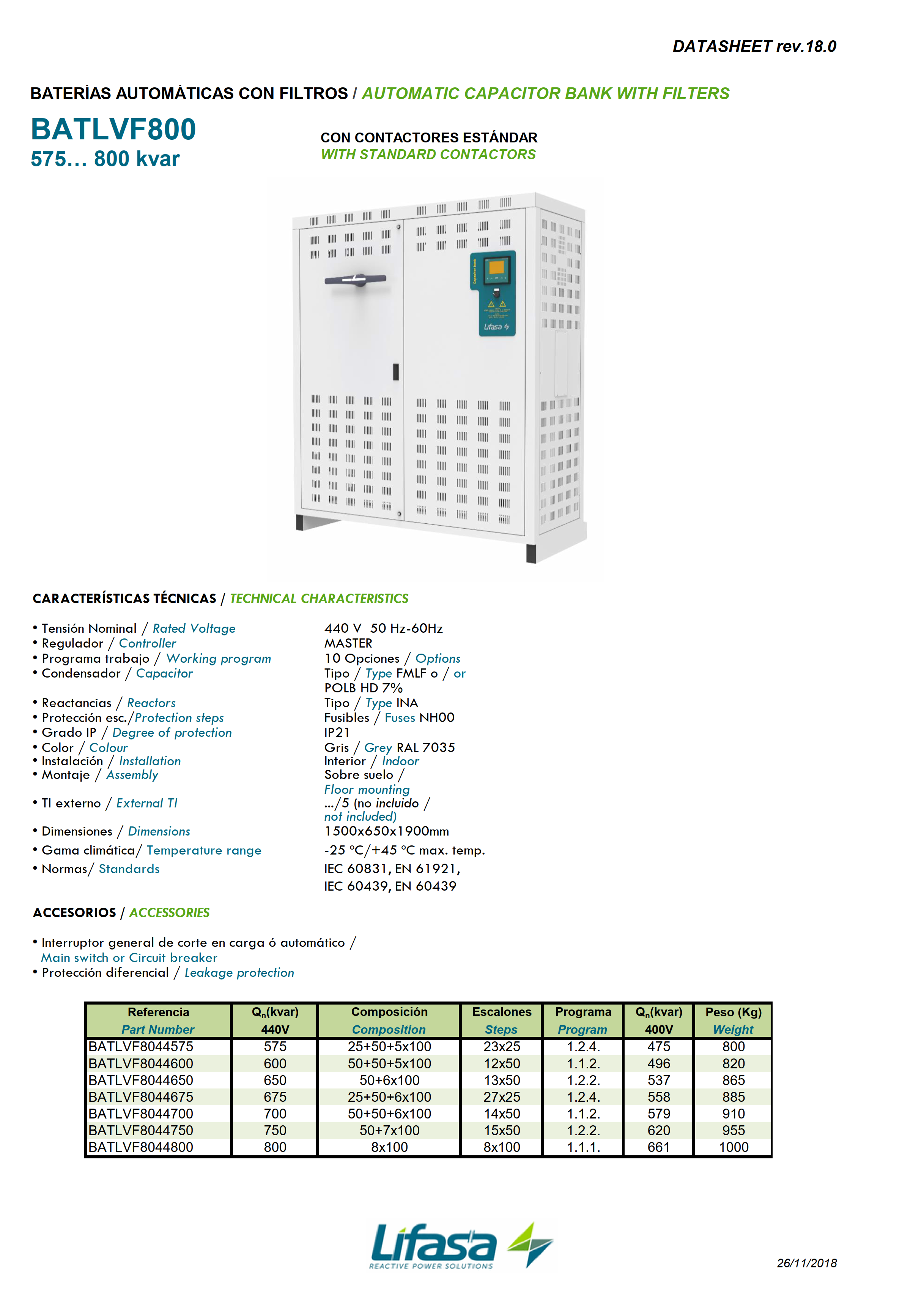 Automatic capacitor banks with filters with standard contactors BATLVF800