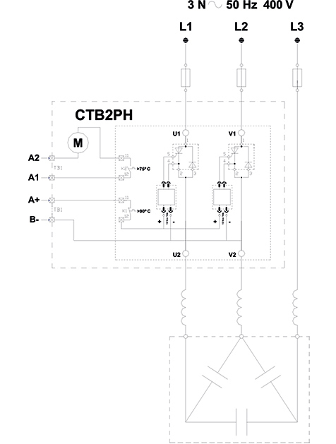 该静态开关模块CTB2PH包括,在一个紧凑的尺寸中,所有必要的部件实现的三相电容器的切换。CTB2PH模块使用晶闸管代替机电接触器。在负载电流大而快速波动的情况下(负载变化持续几毫秒到几秒),静态系统是很方便的。