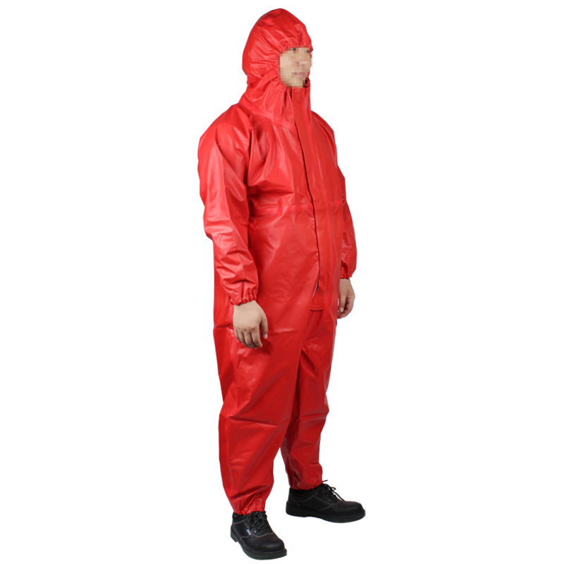 聚酯连体服,双面涂层为 防火面料,270 克/平方米。带有弹性兜帽,袖口和裤脚弹性收紧。标准内层式拉链,外覆有粘边。袖口和裤脚有弹性,接缝处已硫化,可防止渗透。本产品适用于石油化工、公共工程、制药、采矿、食品行业(腐蚀性清洗)。多种厚度选择可根据现场环境污染程度不同来选择不同的克重,420g/m为红色款,180g/m和270g/m为白色款。