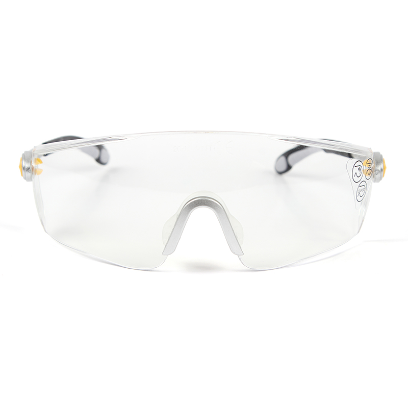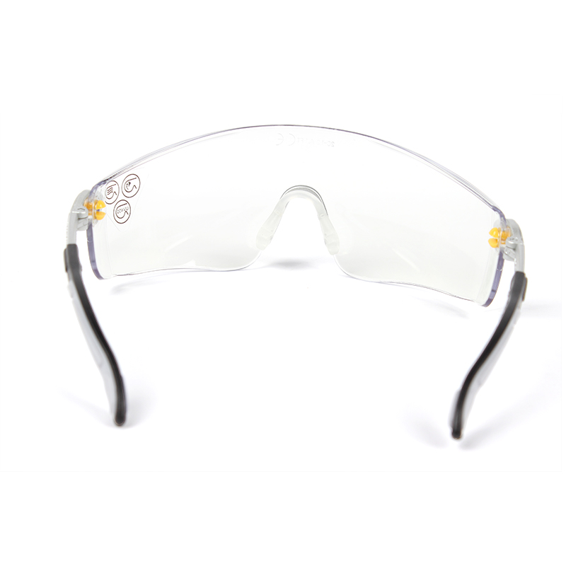 - 舒适型整片式侧边防护眼镜,PC镜片,可旋转及调节镜脚,软制PVC鼻梁架;