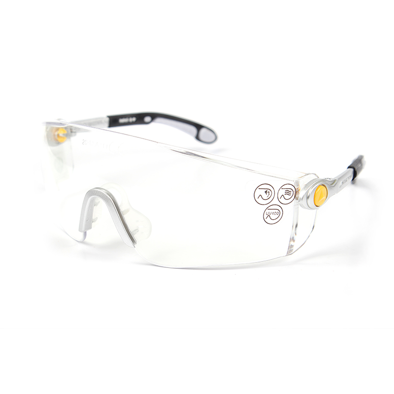产品介绍:”舒适型整片式侧边防护眼镜,PC镜片,可旋转及调节镜脚,软制PVC鼻梁架,防雾、防冲击、防刮擦、防紫外线,为亚洲人脸型设计。”