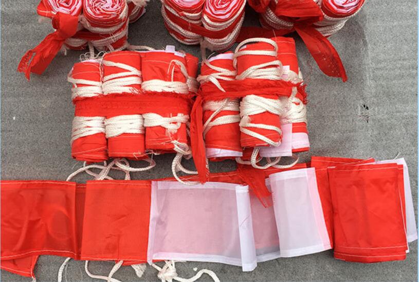 其他说明:纯涤纶(亮布),尼龙绳红白串旗,包边,颜色鲜艳,适合于施工、电力检修、路政、环保、危险、交通事故、突发事件地段的隔离。圈定事故现场或警示规范特殊区域。装卸货物,忙碌区域,酒店,运动场所,商场等临时通道的隔离。可与路锥、交通警示柱一起配合使用。