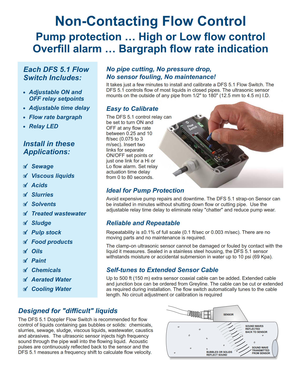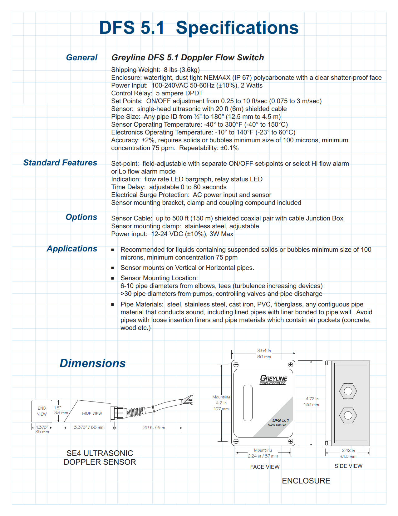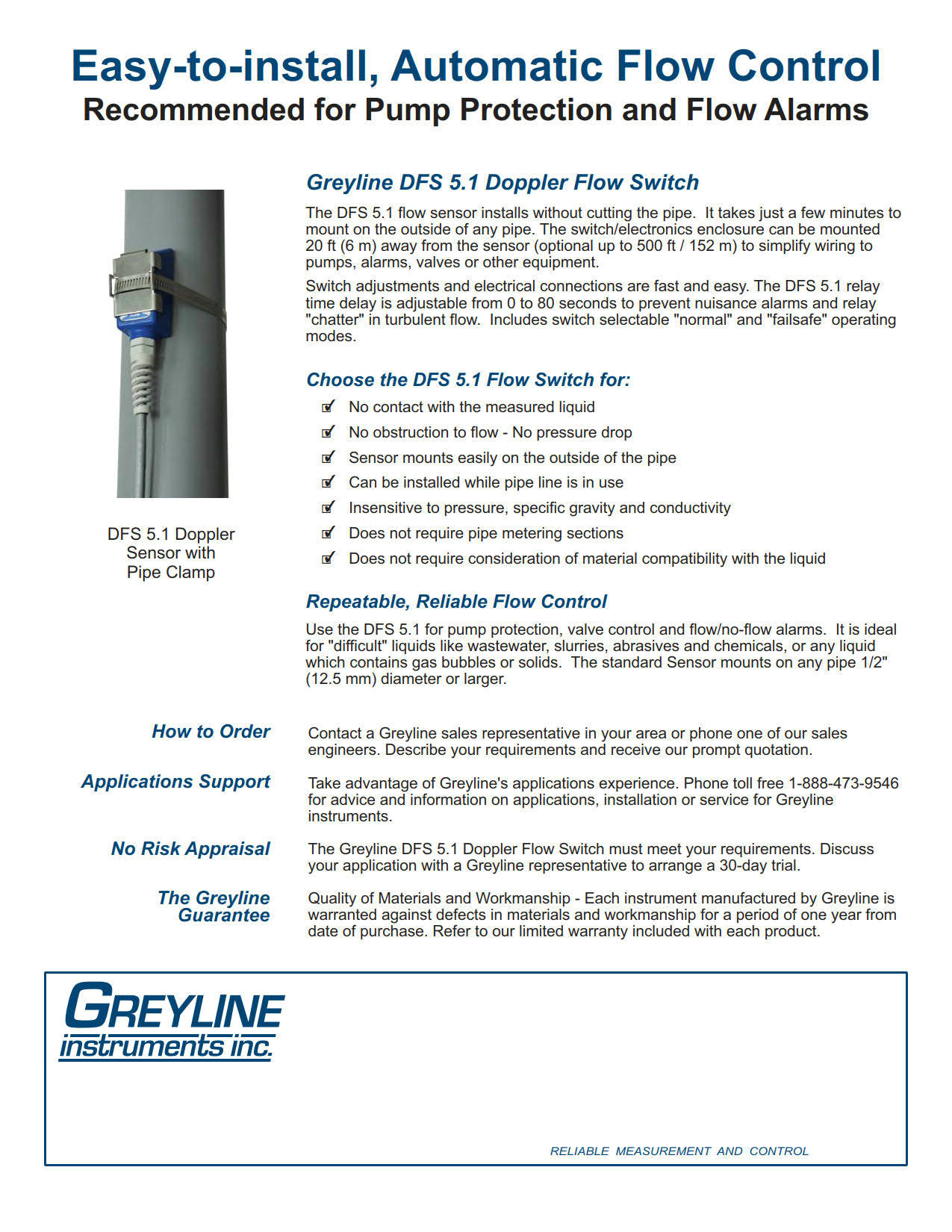 The flow switch shall be a Model DFS 5.1 Doppler Flow Switch as manufactured by Greyline Instruments Inc., and warranted against defects in materials and workmanship for one year.