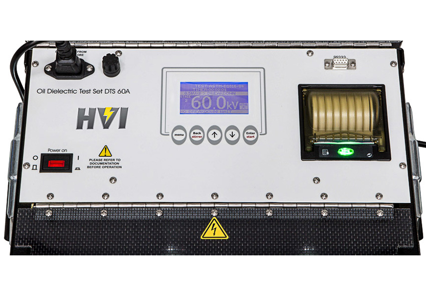 The DTS-60A(F) is a fully automatic liquid dielectric test set, typically used for testing the voltage breakdown level of insulating oils. The most common world standards are pre-programmed into the controls. Just hit the start button and the test is performed. Custom test sequences can also be programmed. Test results stored internally can be downloaded to a computer or printed using the onboard thermal printer.