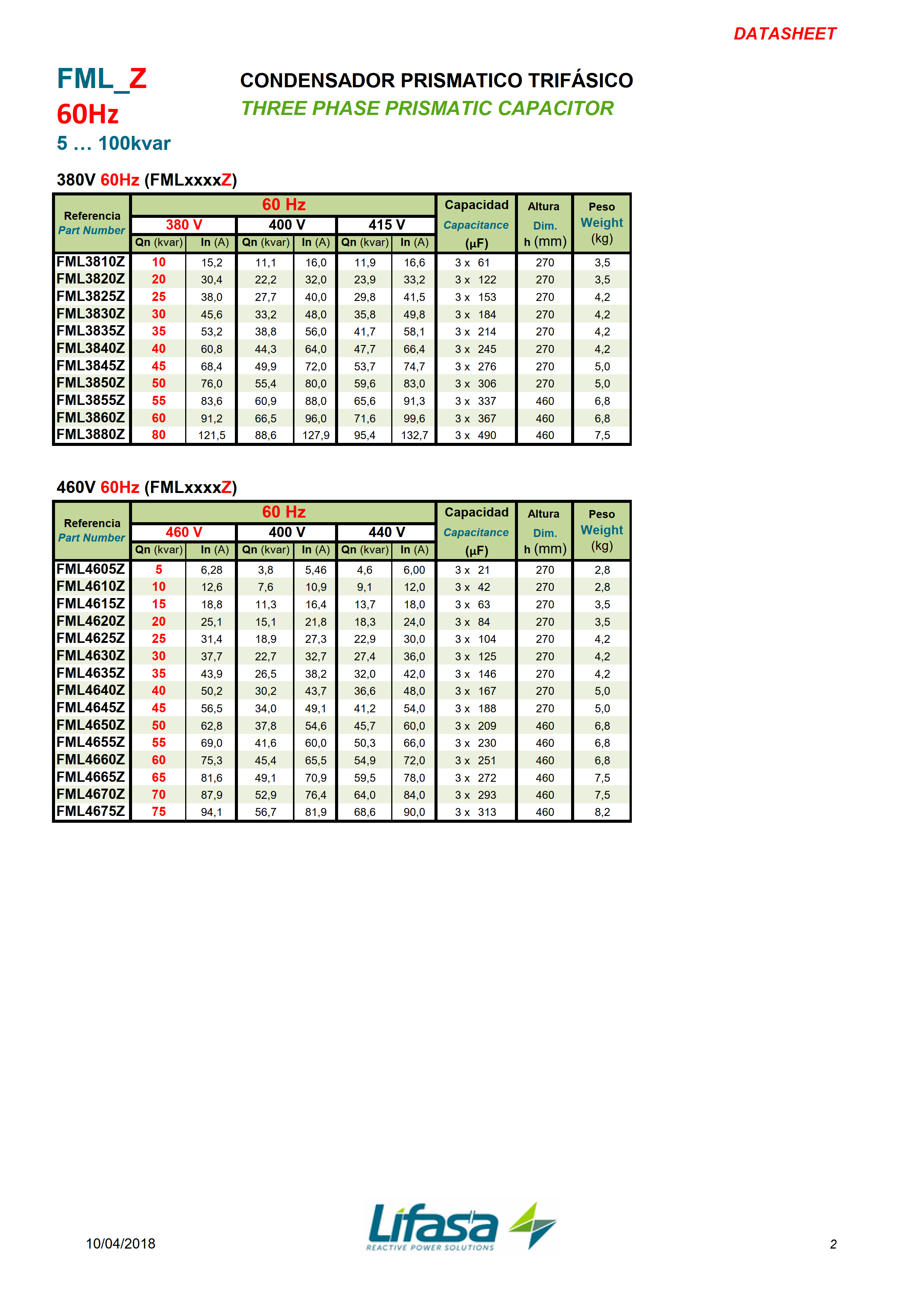 | Part Number | 60 Hz | Capacitance (?F) | Dim h (mm) | Weight (kg) | |||||