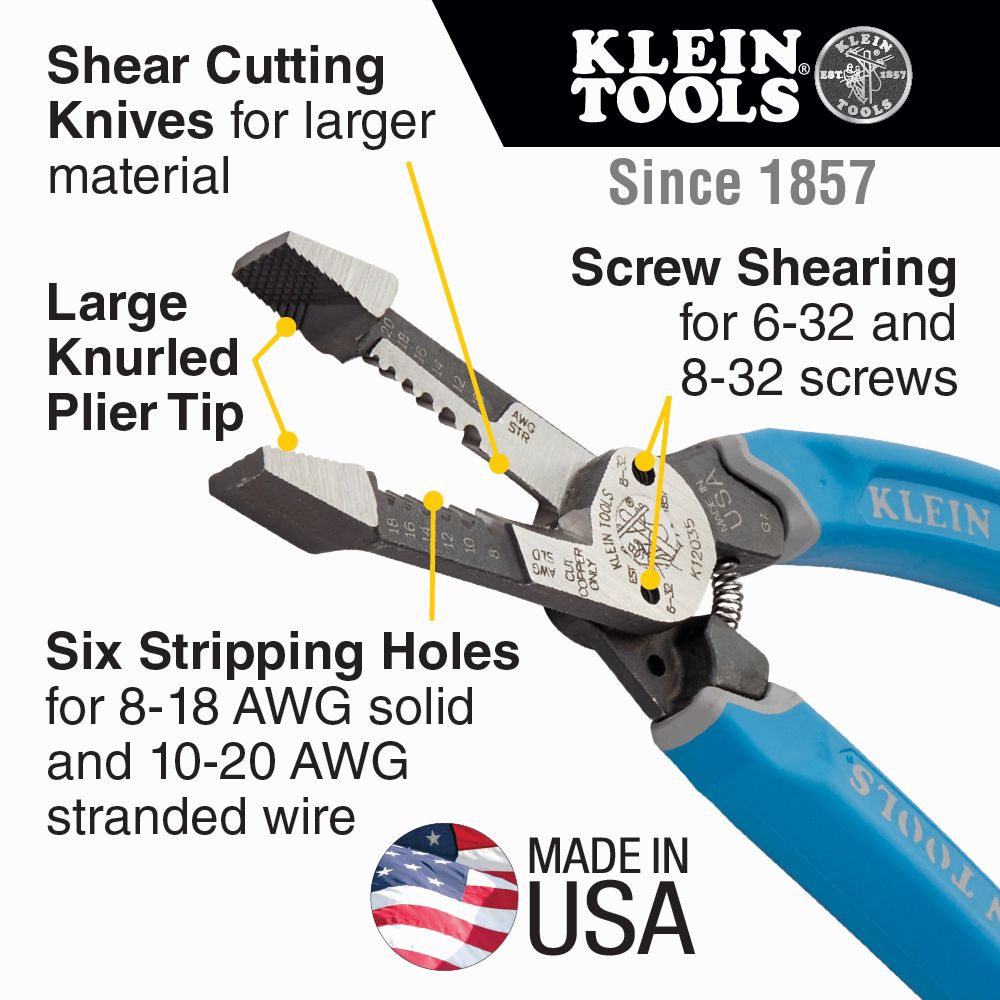 这些锻造的重型剥线钳带有剪切刀,以较低的力剪切铜线和较大的电缆,例如Romex和其他非金属(NM型)电缆。更新的设计具有六个剥线孔,用于8-18 AWG实心线和10-20 AWG绞合线。大号滚花钳头拉动并扭曲钢丝。螺丝剪孔可固定6-32和8-32螺丝。