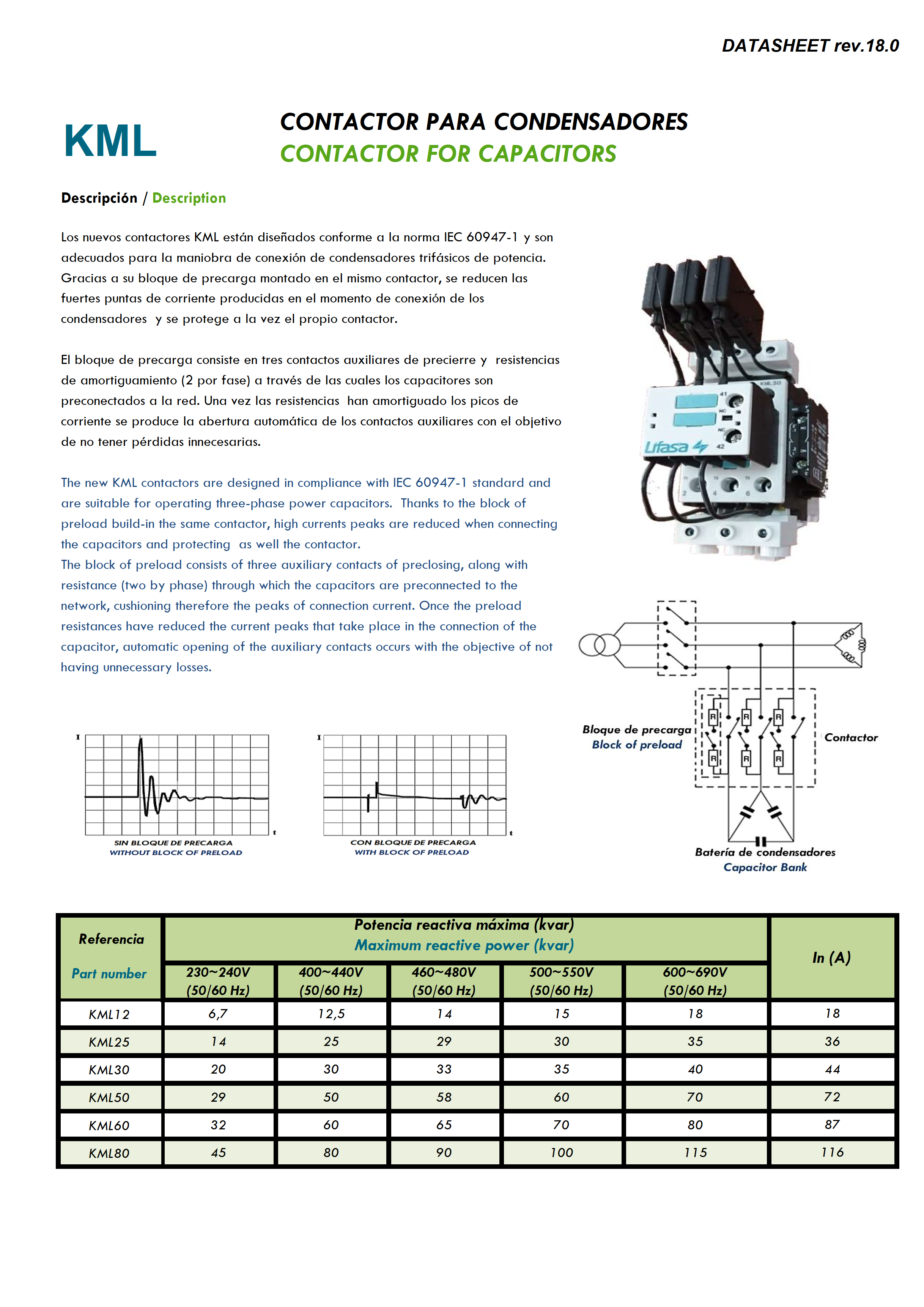 The new KML contactors are suitable for operating three-phase power capacitors. ?Thanks to the block of preload build-in the same contactor, high currents peaks are reduced when connecting the capacitors and protecting as well the contactor.