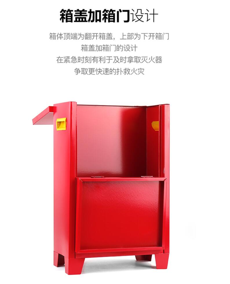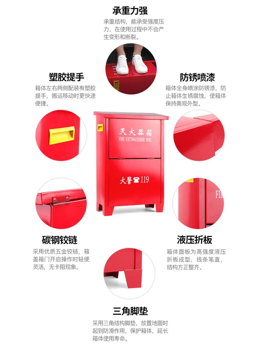 灭火器箱箱门可选用金属或非金属材料。当箱门采用玻璃时,应使用厚度不小于3 mm的平板玻璃。灭火器箱体应端正,不应有歪斜、翘曲等变形现象。置地型应能平稳安放,不应有倾斜摇晃。灭火器箱体焊接或铆接应牢固,不应有烧穿、焊瘤、毛刺和铆印等缺陷。箱体表面应作防腐处理,涂层应光滑平整。箱门、箱盖开启操作应轻便灵活,无卡阻现象。灭火器箱外表面应为大红色,正面上醒目标注中文”灭火器箱”和英文”Fire Extinguisher Box”字样,字色为白色,箱门采用玻璃时,字色为红色。灭火器箱的外形尺寸应符合我国公共安全行业标准GA 139-2009《灭火器箱》的规定。