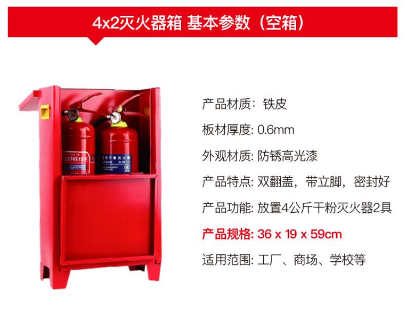灭火器箱是专门用于长期固定存放手提式灭火器的箱体。按放置型式,可分为置地型和嵌墙型两种。按开启方式可分为开门式和翻盖式两种。灭火器箱体应使用薄钢板、铝合金等金属材料制造。
