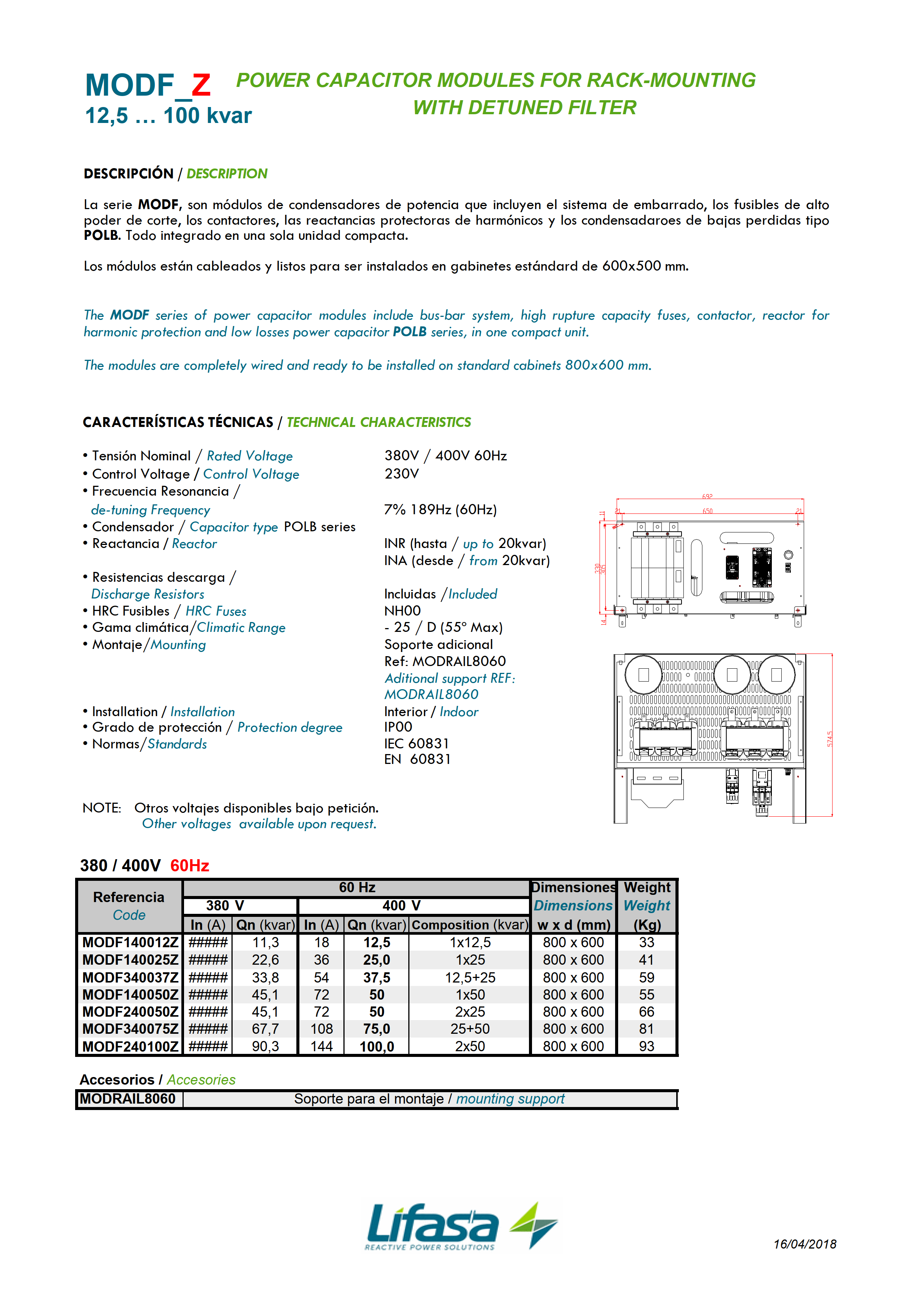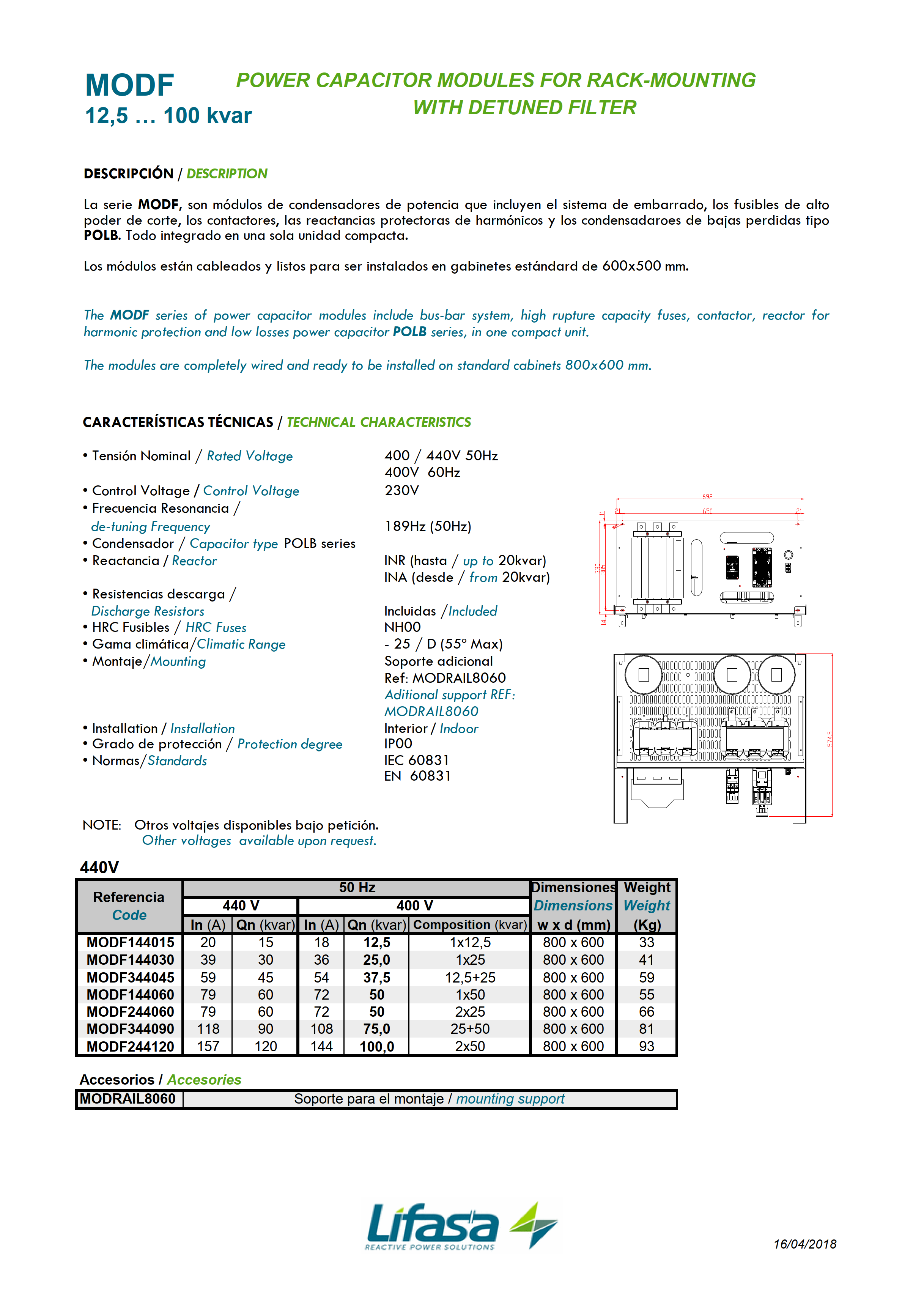 The MODF-RACK series of power capacitor modules include busbar system, high rupture capacity fuses, contactor, reactor for harmonic protection and low losses power capacitors POLB in one compact unit. The modules are completely wired and ready to be installed on standard cabinets 800x600mm. (W x D).