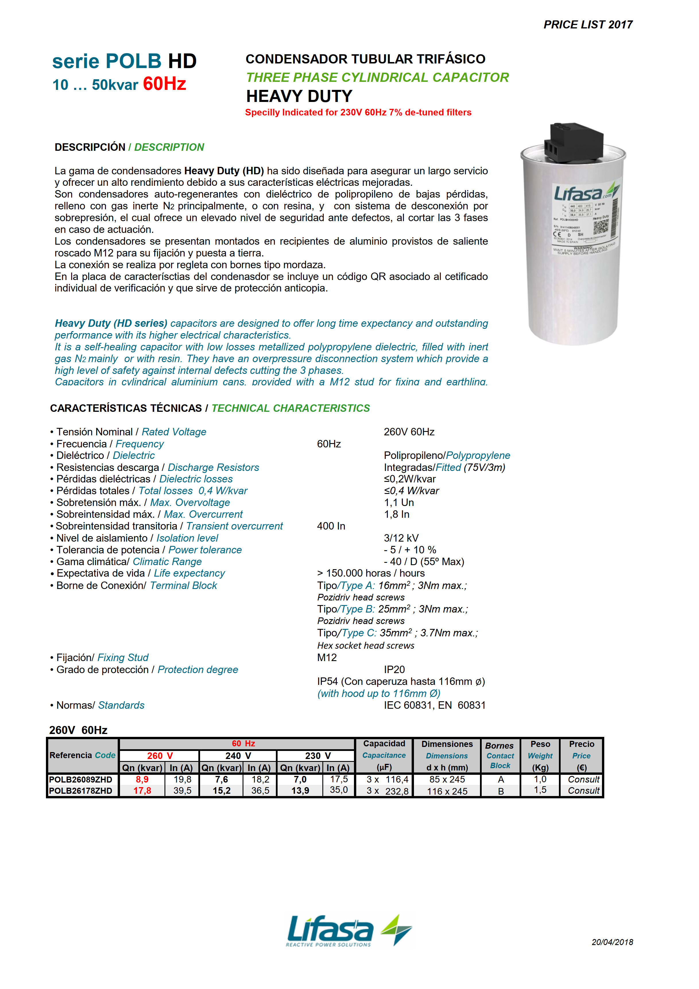 It is a self-healing capacitor with low losses metallized polypropylene dielectric, filled with inert gas N2. They have an overpressure disconnection system which provides a high level of safety against internal defects cutting the 3 phases.