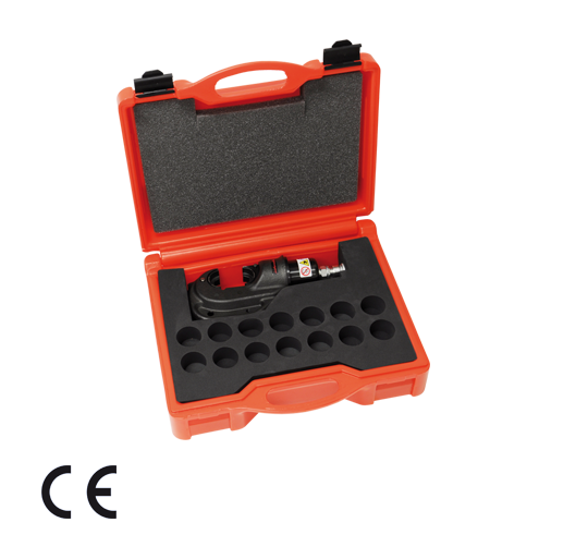 - Plastic case for crimping head and 14 semi-circular crimping dies