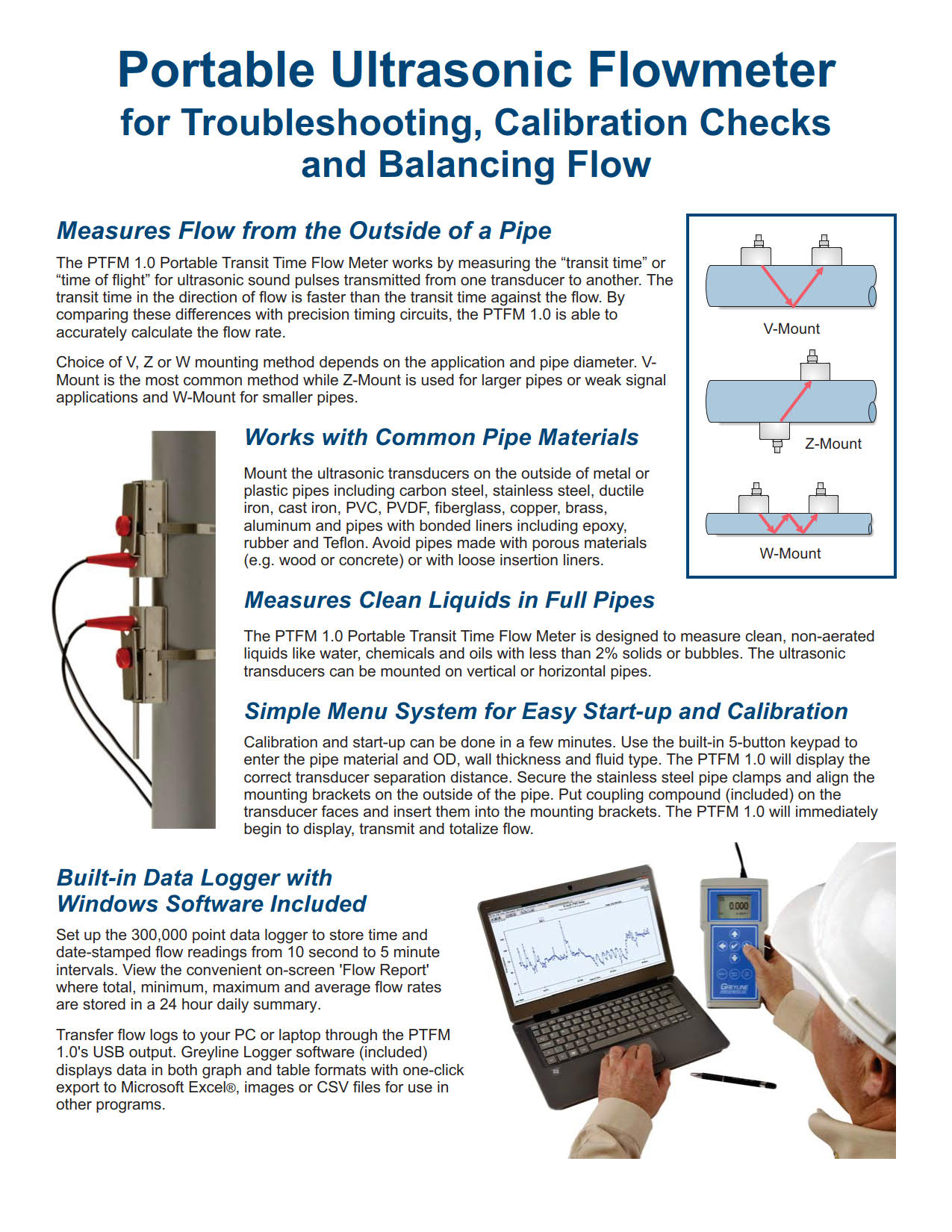 Transfer flow logs to your PC or laptop through the PTFM 1.0’s USB output. Greyline Logger software (included) displays data in both graph and table formats with one-click export to Microsoft Excel, images or CSV files for use in other programs.