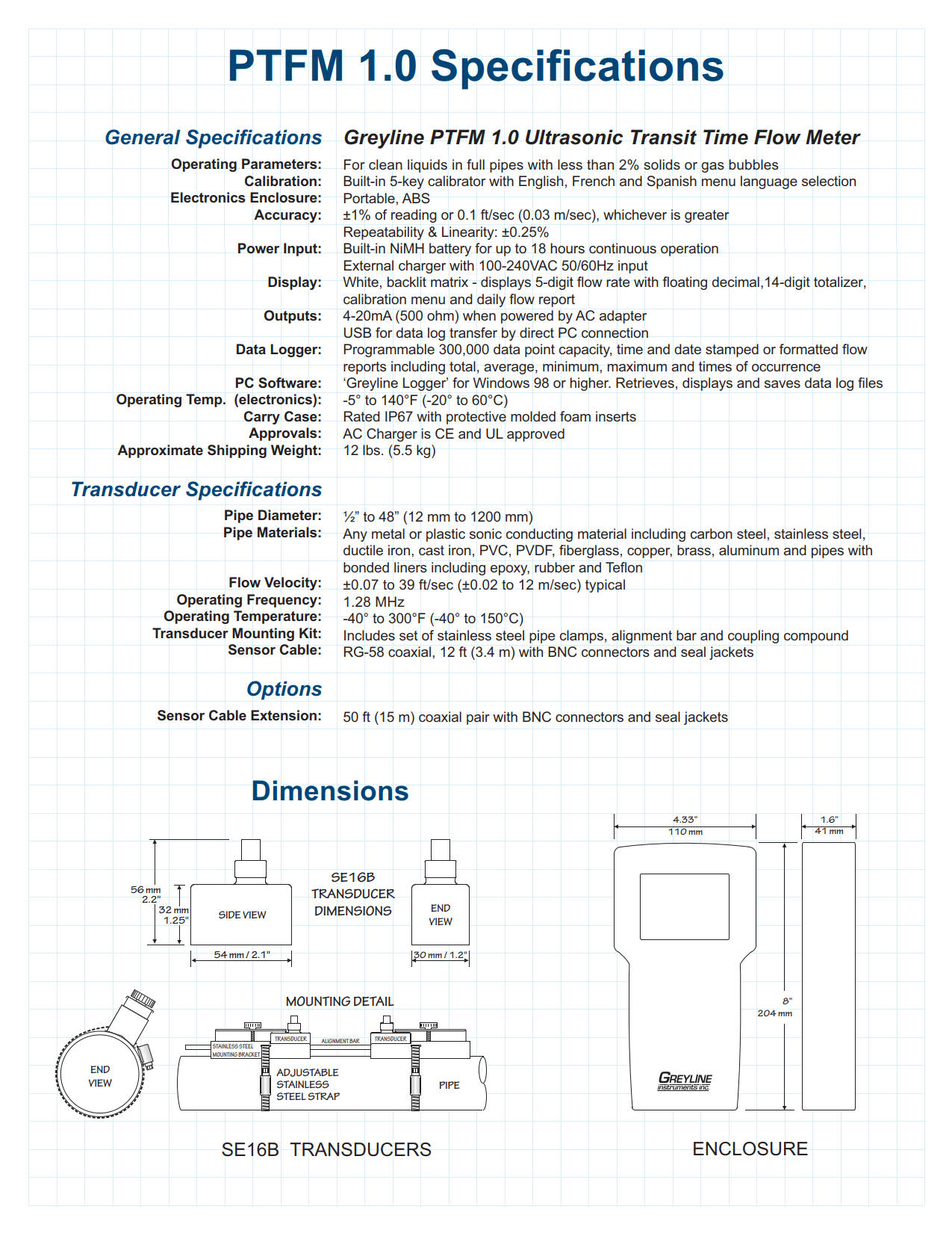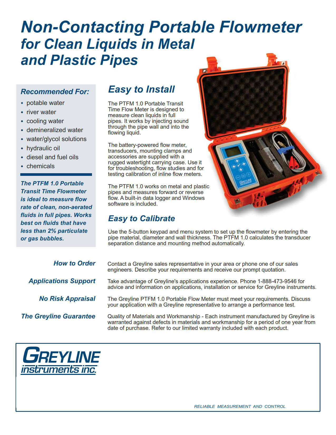 The instrument shall be a Model PTFM 1.0 Portable Transit Time Flow Meter as manufactured by Greyline Instruments Inc., and warranted against defects in materials and workmanship for one year.