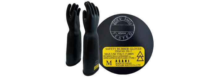 海外向けの高圧ゴム手袋、ゴム長靴、樹脂シート、絶縁服、絶縁ズボンなどの製作を承っております。20,000V/3分間合格品(使用電圧17,000V)など。