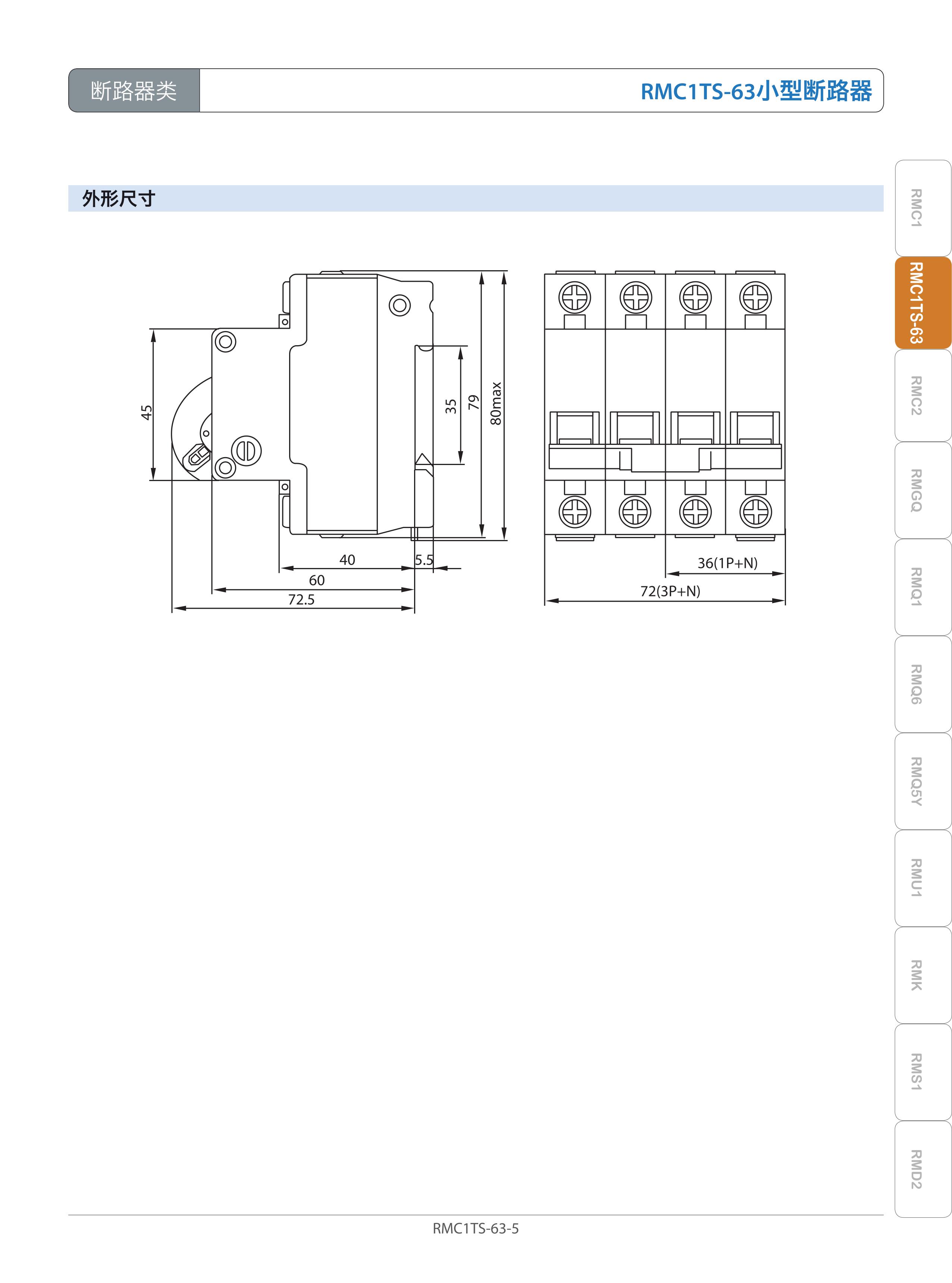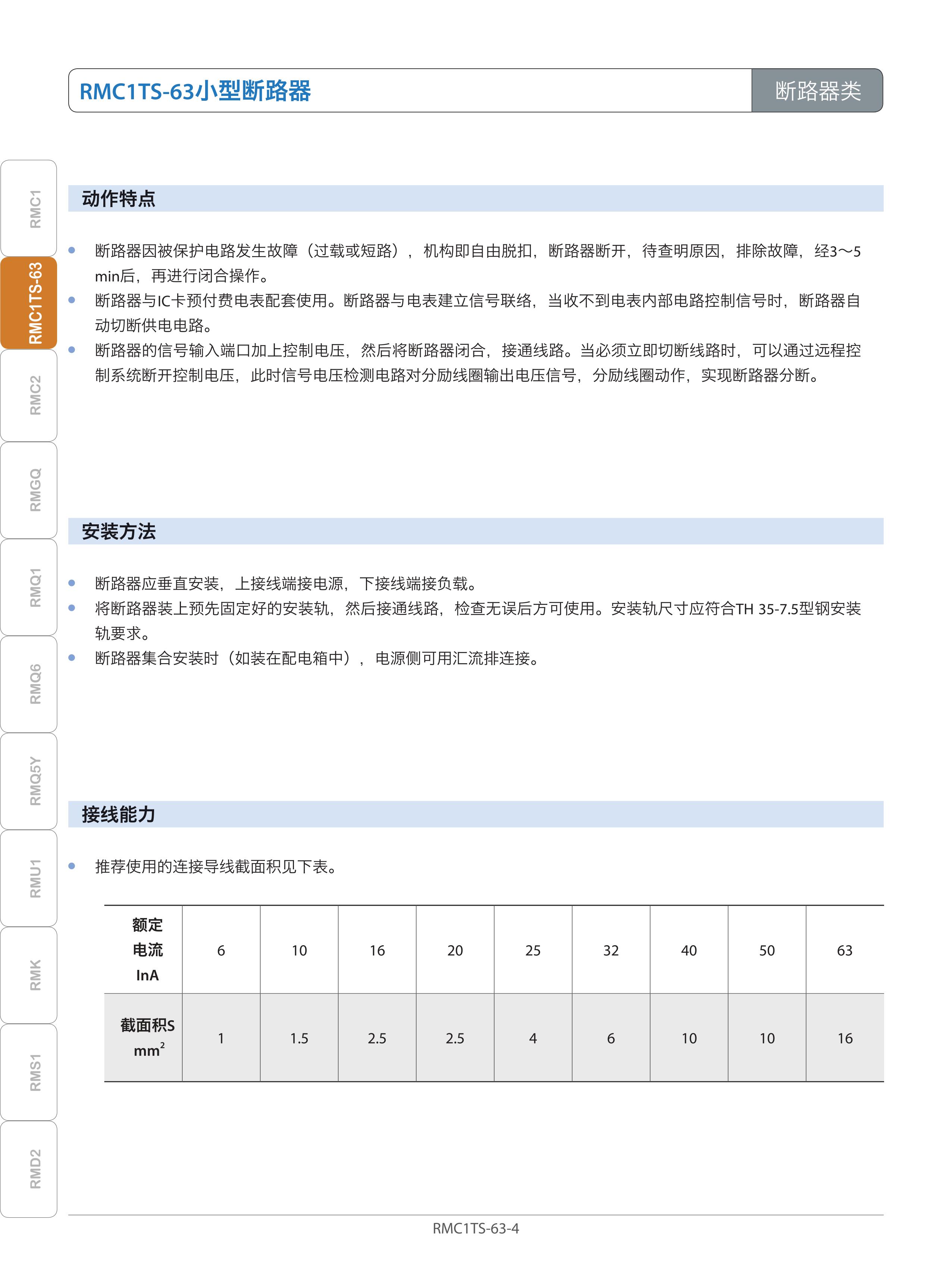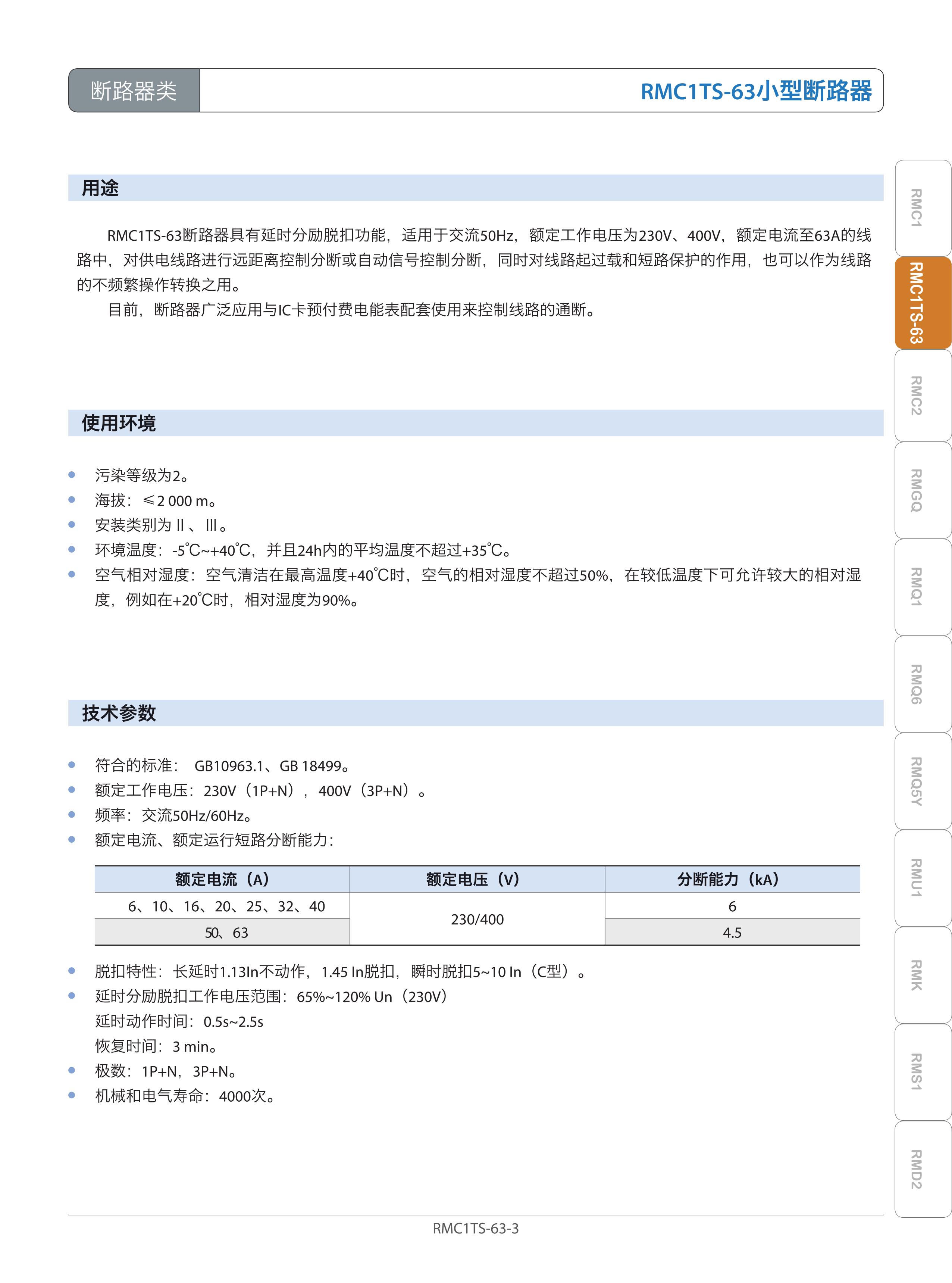 RMC1TS-63断路器具有延时分励脱扣功能, 适用于交流50Hz, 额定工作电压为230V、 400V, 额定电流至63A的线路中, 对供电线路进行远距离控制分断或自动信号控制分断, 同时对线路起过载和短路保护的作用, 也可以作为线路的不频繁操作转换之用。