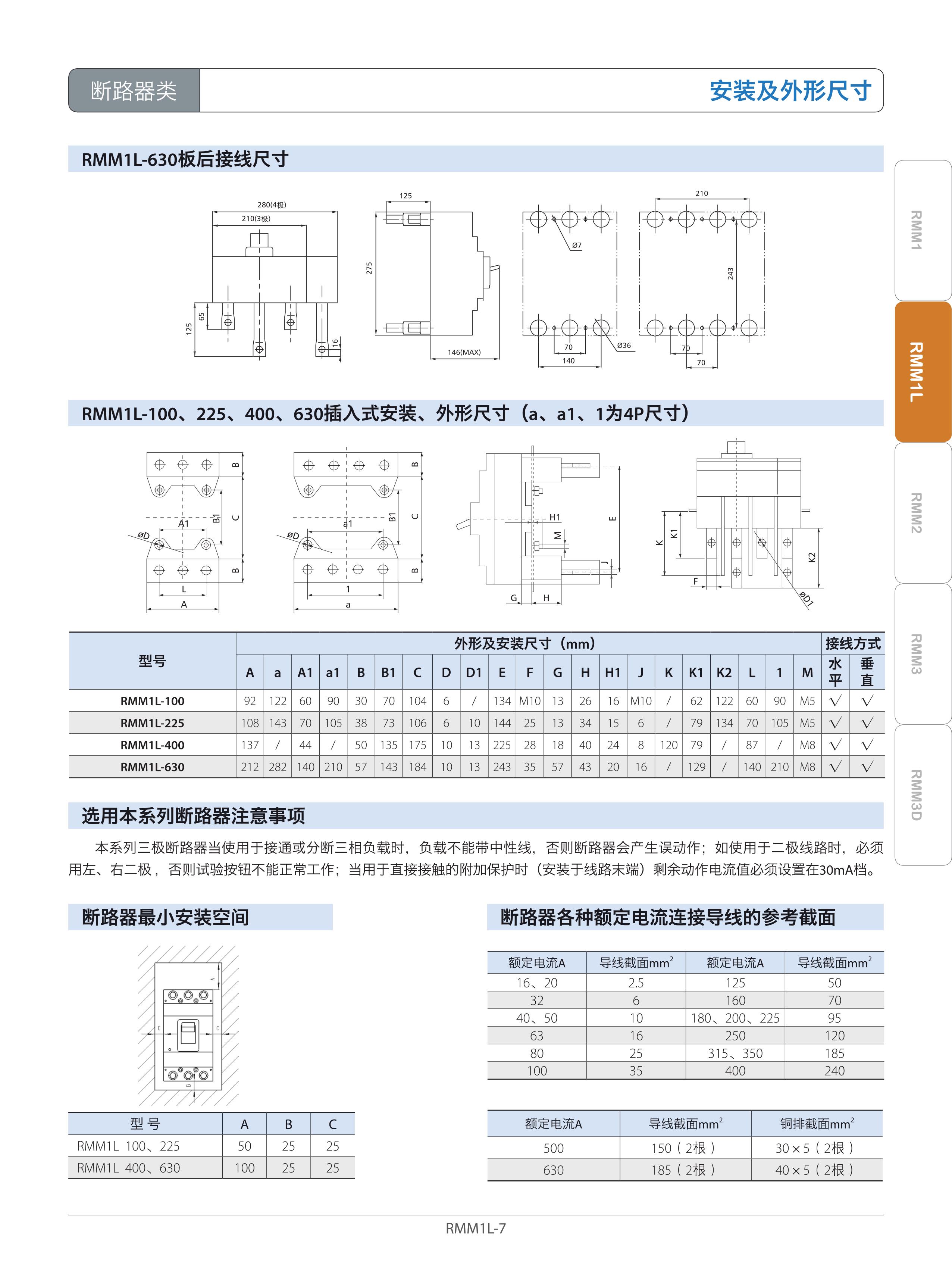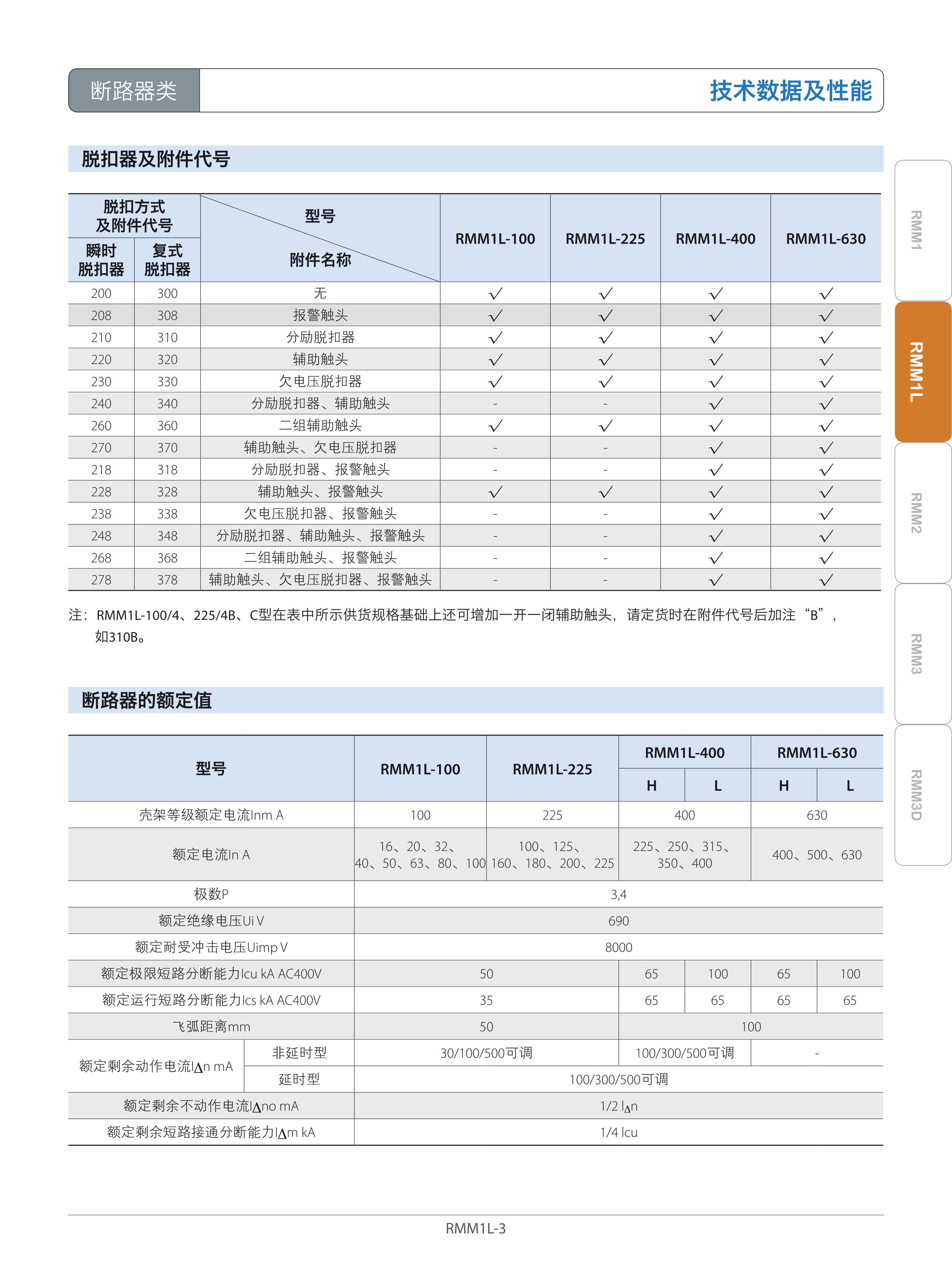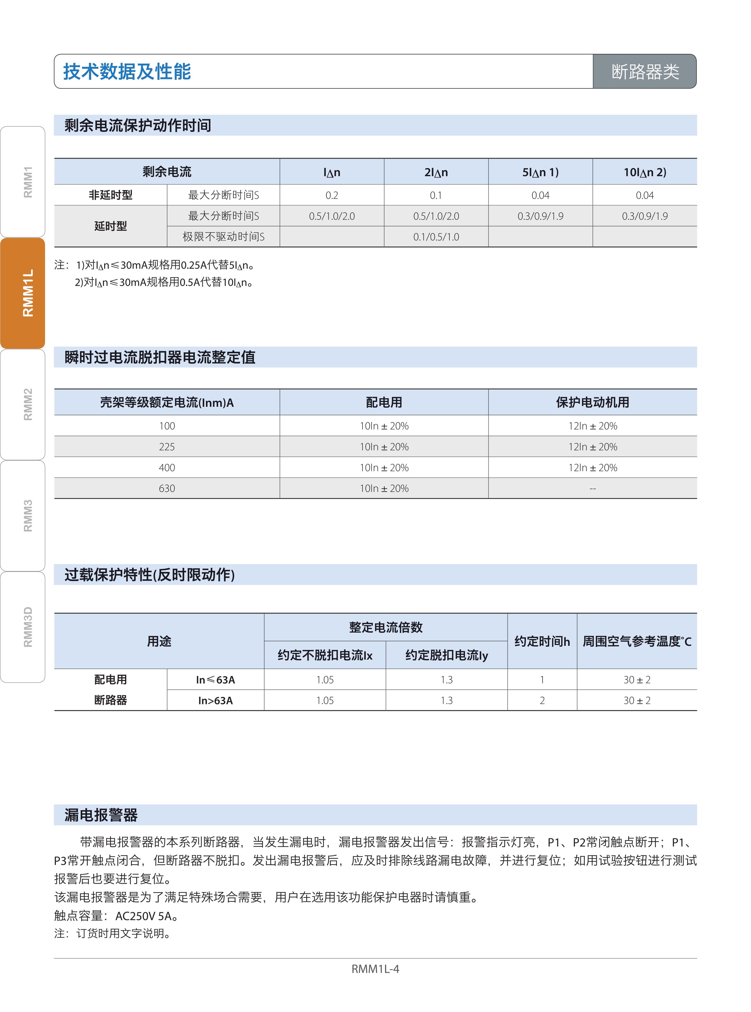 RMM1L系列带剩余电流保护塑料外壳式断路器( 以下简称断路器) 适用于交流50Hz, 额定工作电压400V, 额定工作电流至630A及以下的电路中作不频繁转换, 额定工作电流至400A的断路器亦可用于电动机不频繁起动之用。 断路器具有过载、 短路和欠电压保护功能。 同时可作为人身间接接触保护和设备漏电保护, 也可防止因设备绝缘损坏产生接地故障电流可能引起的火灾危险。 在有关保护装置失灵时额定剩余动作电流不超过30mA的断路器还可用作直接接触的附加保护。