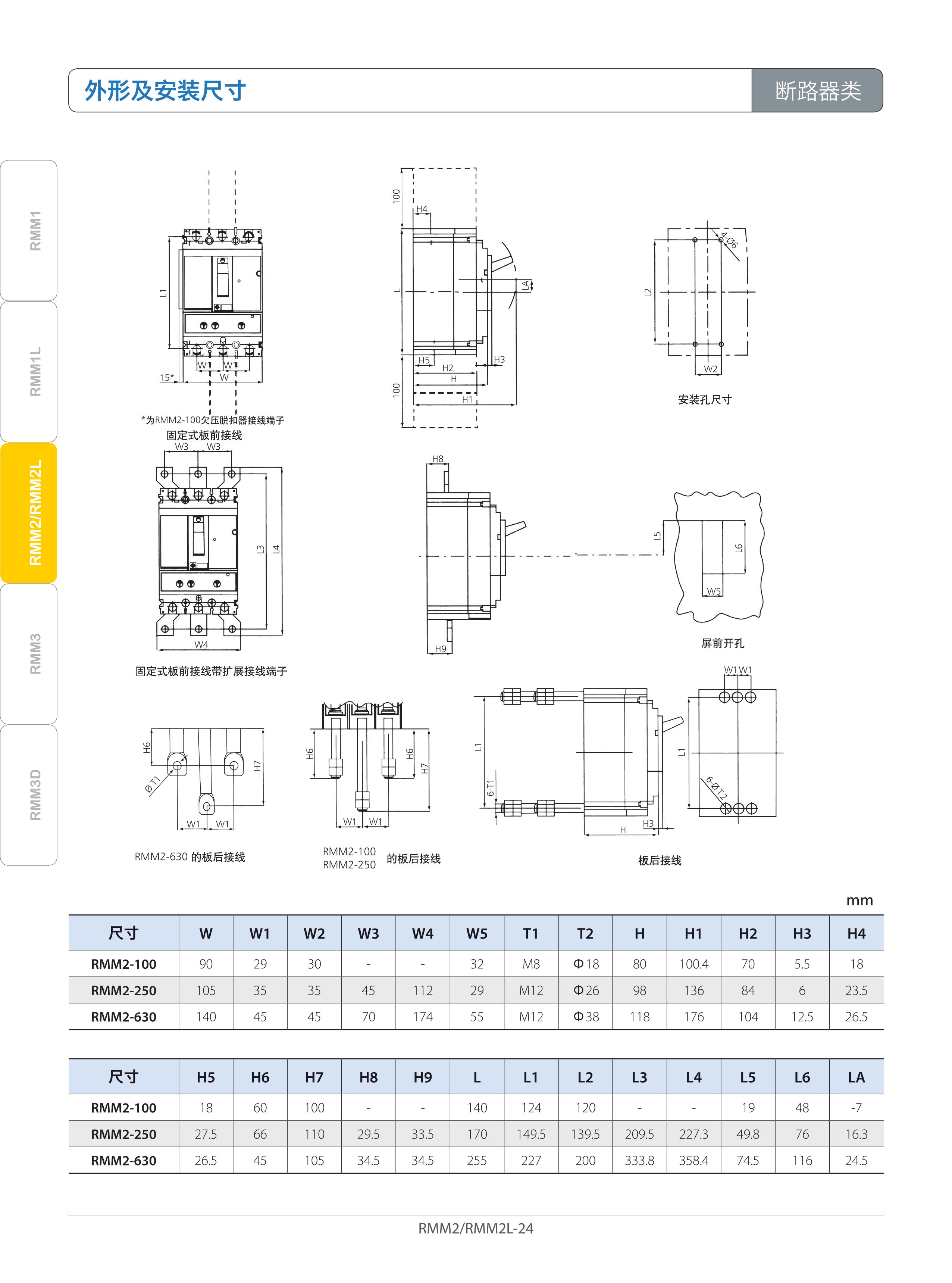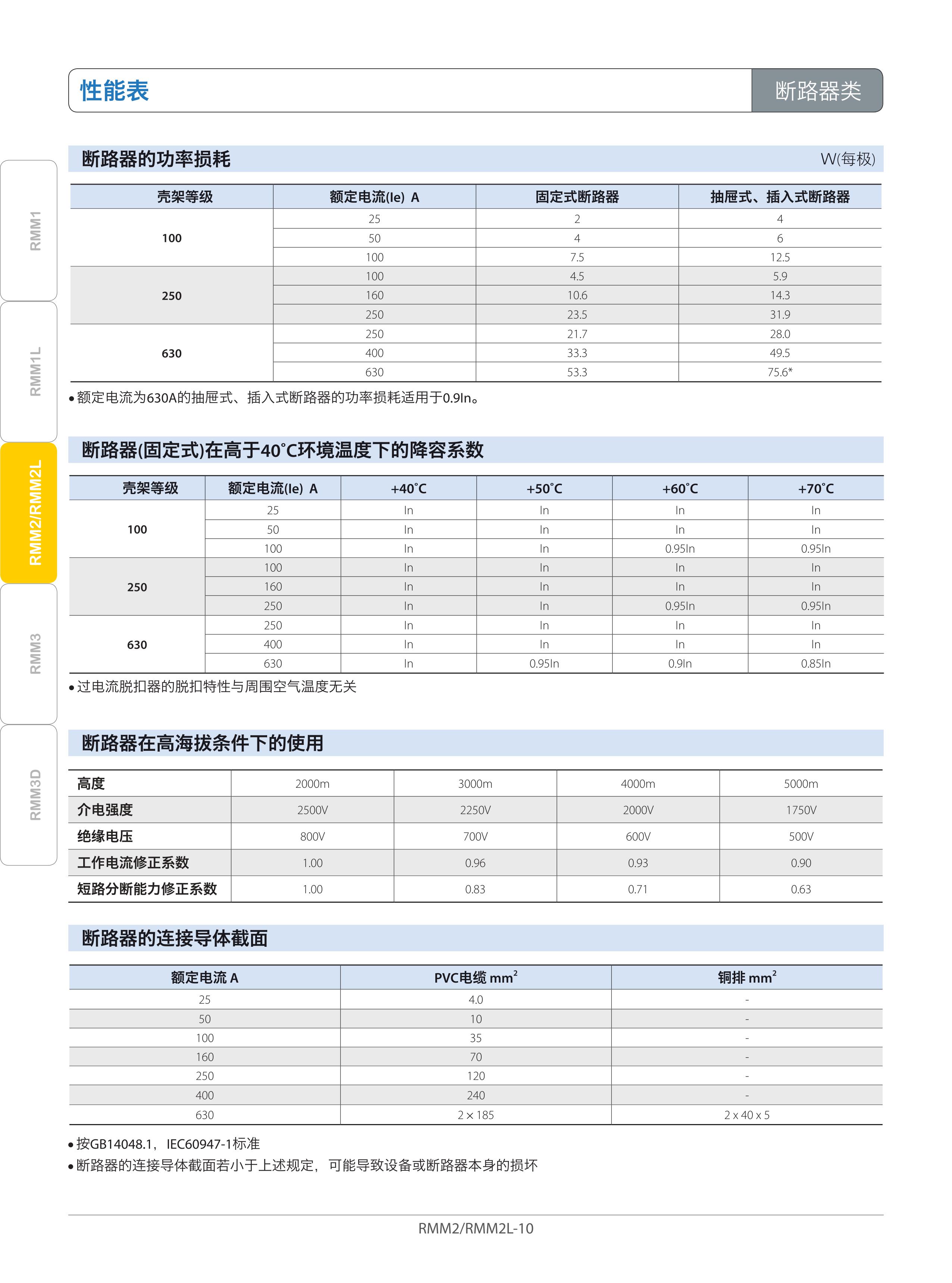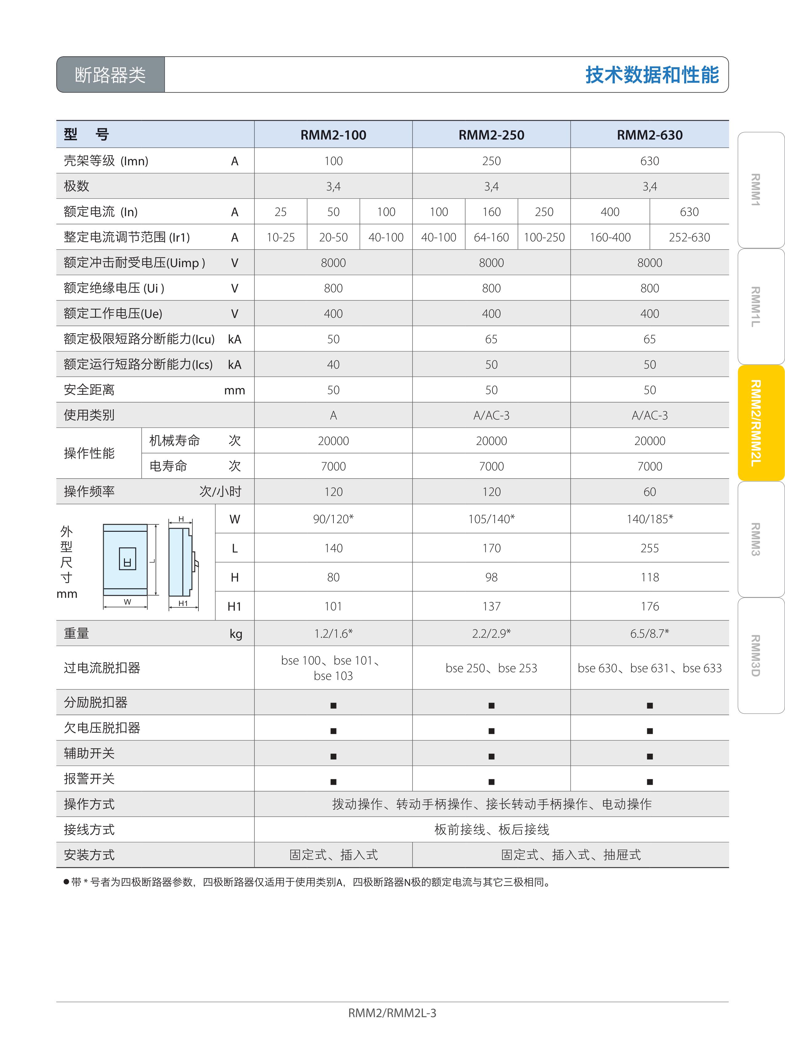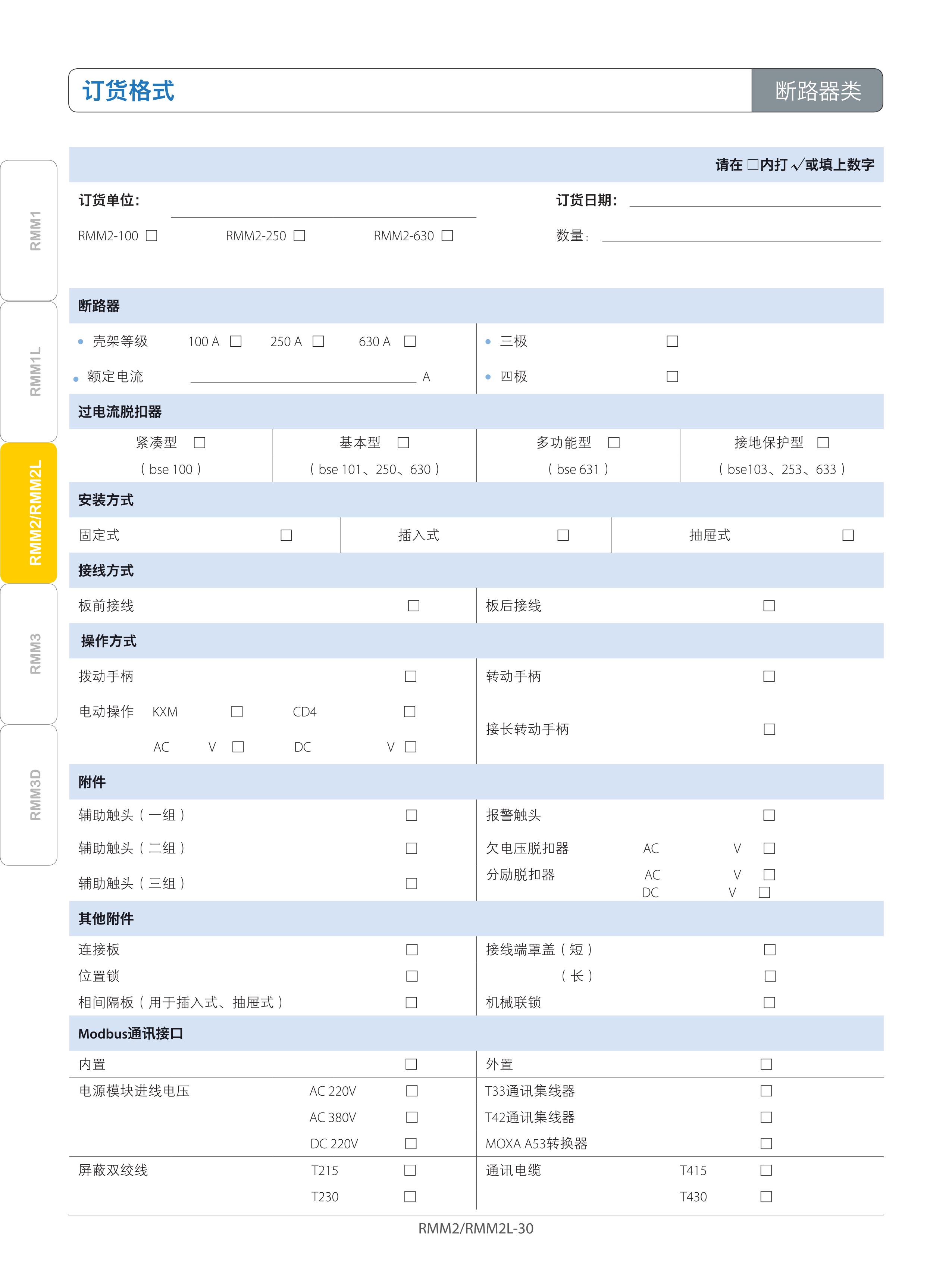 注:断路器一般为上进线,下出线,若用户要求RMM2-250、630下进线,应作为特殊订货提出。