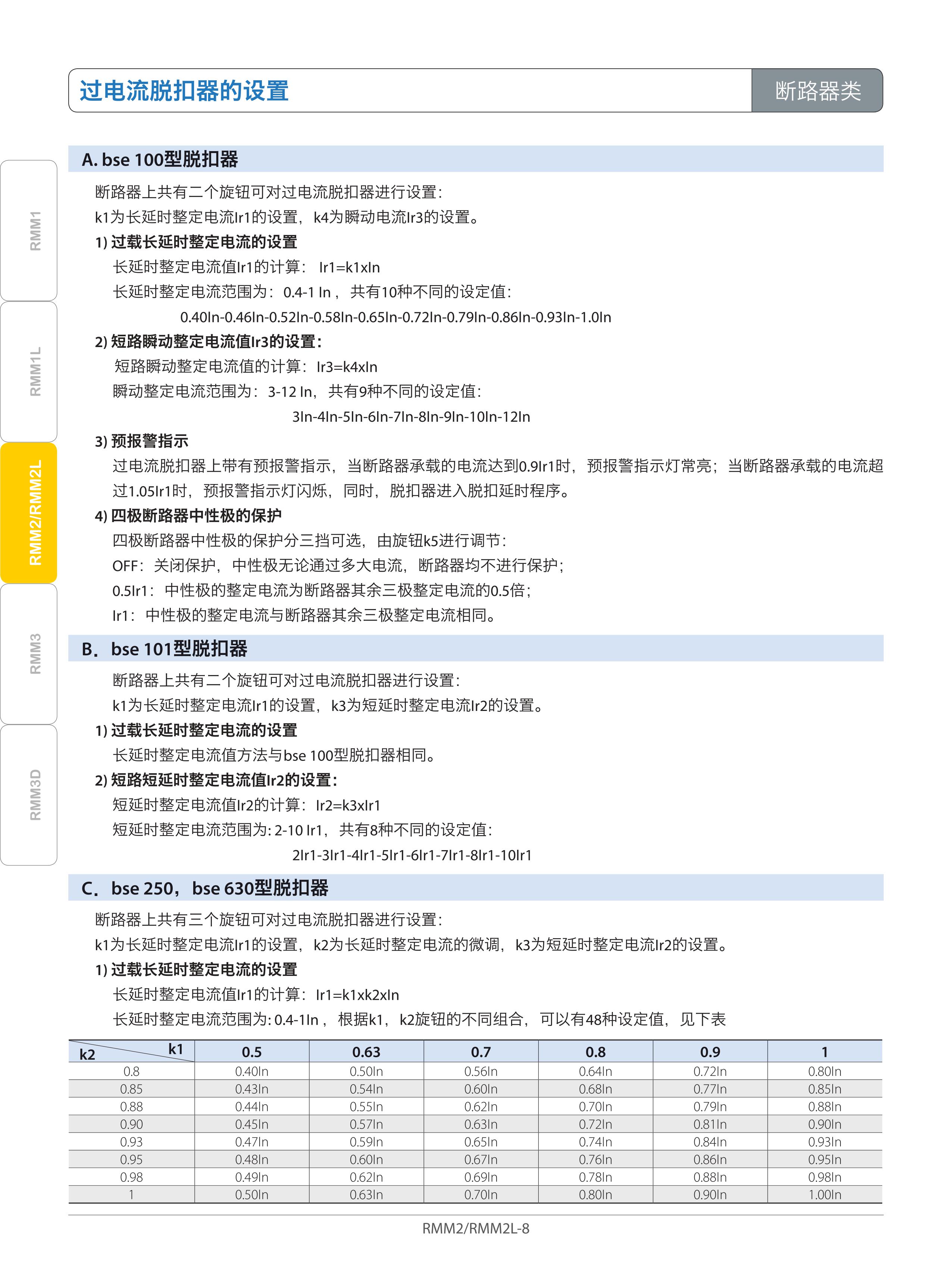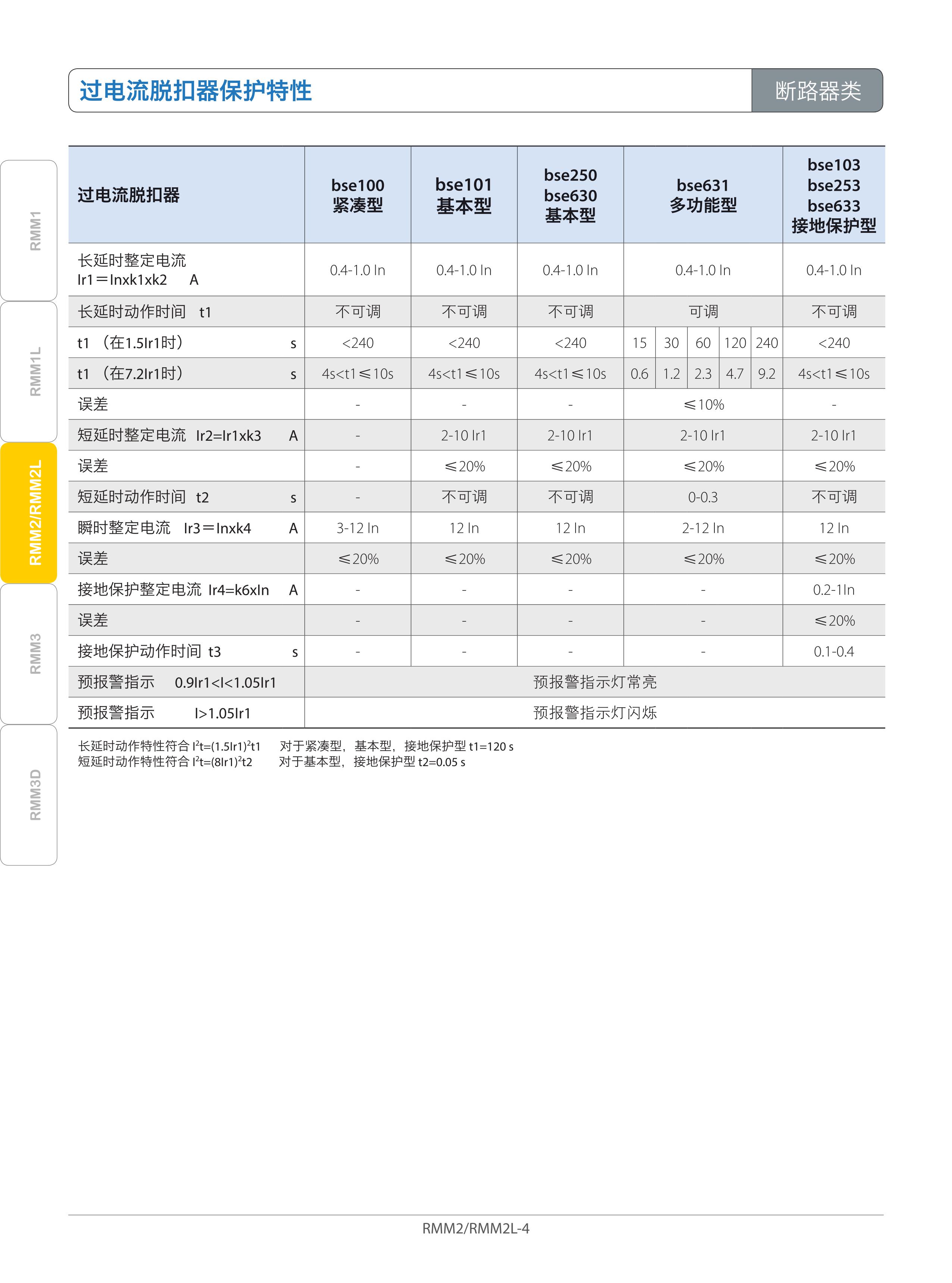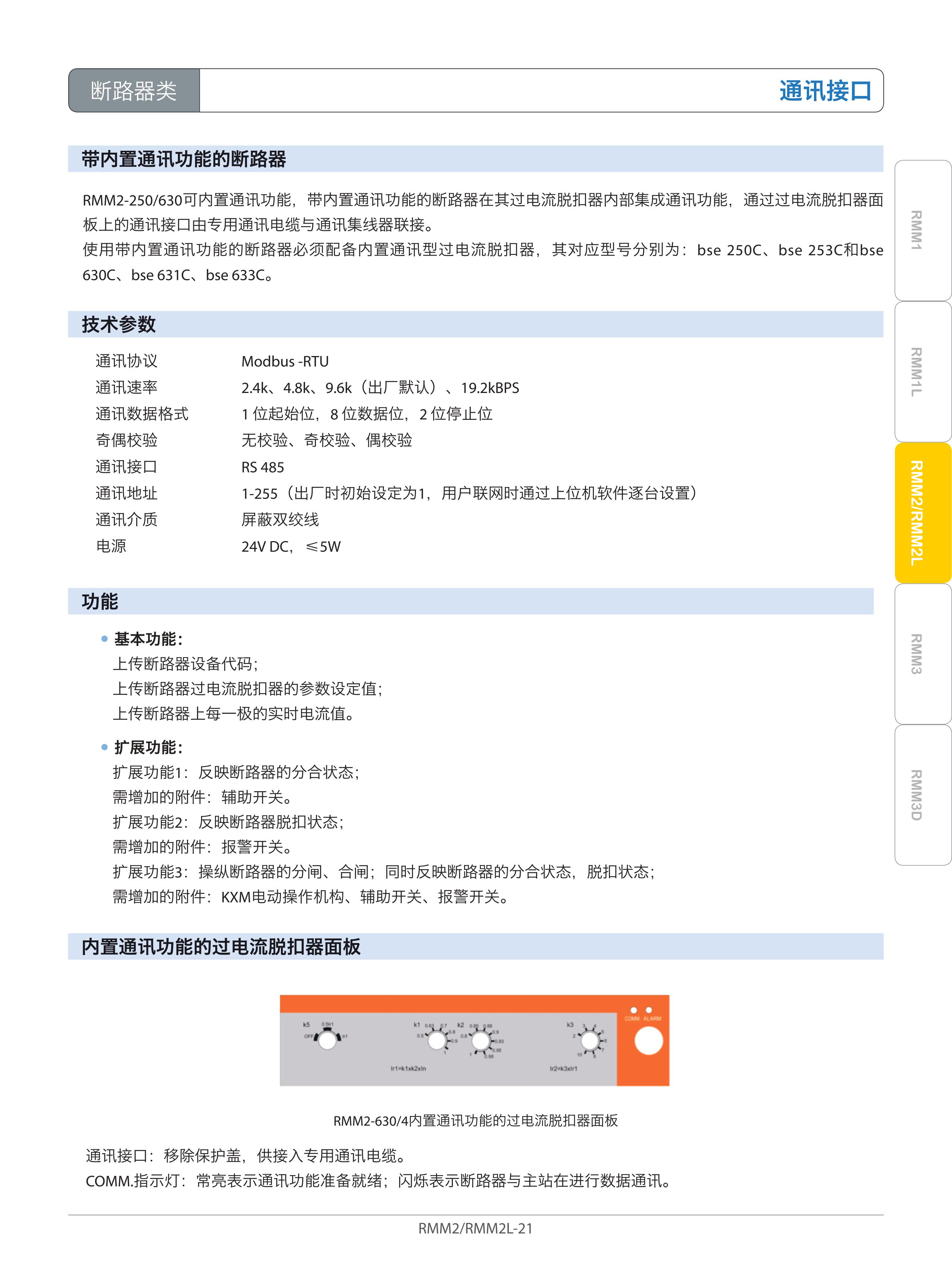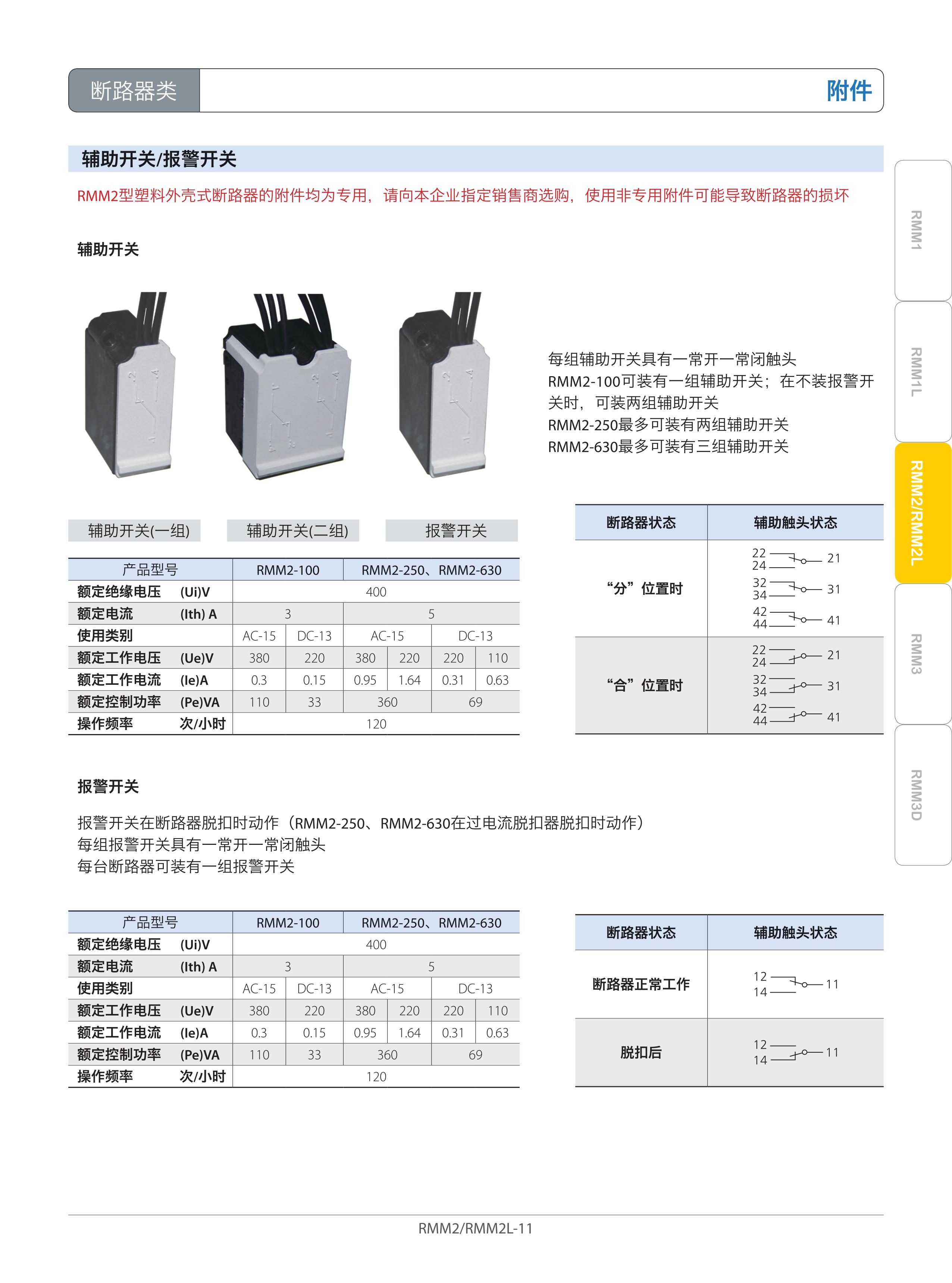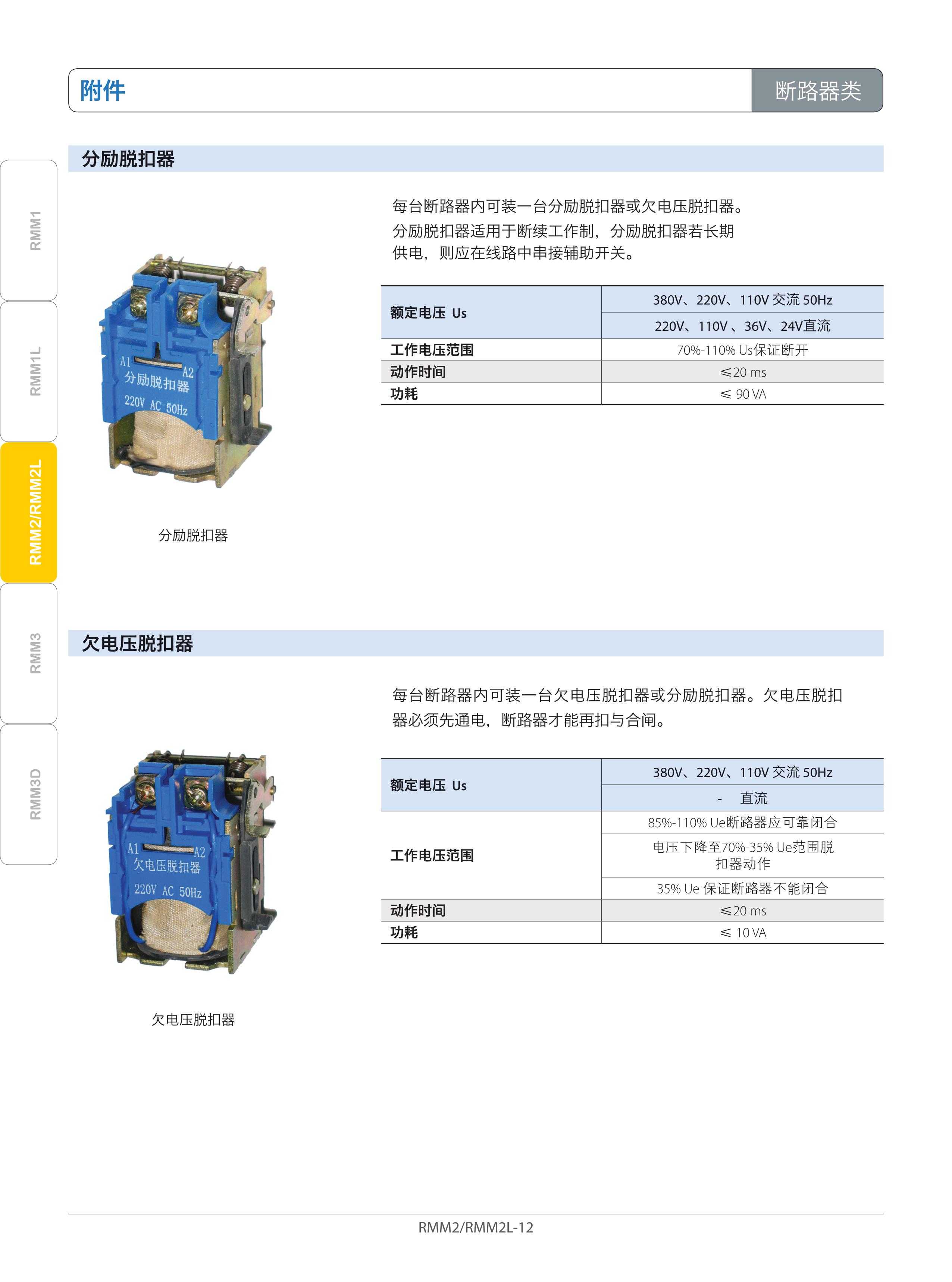 RMM2塑料外壳式断路器额定绝缘电压800V,主要用于交流50Hz,额定工作电压400V,额定电流630A及以下的配电网络中,作为分配电能和保护线路及电源设备免受过载、欠电压、短路等故障的危害。断路器也可对电动机进行过载、欠电压和短路保护。RMM2塑料外壳式断路器带接地故障保护型过电流脱扣器后,除了原有的过载、短路保护功能之外,新增加了接地故障保护功能。可以对一般过电流保护装置不能检测出的接地故障引起的火灾或其它危险提供保护。RMM2塑料外壳式断路器可带通讯功能,将断路器上的信息通过现场总线上传到控制计算机上,并能通过计算机操纵断路器的合闸和断开。
