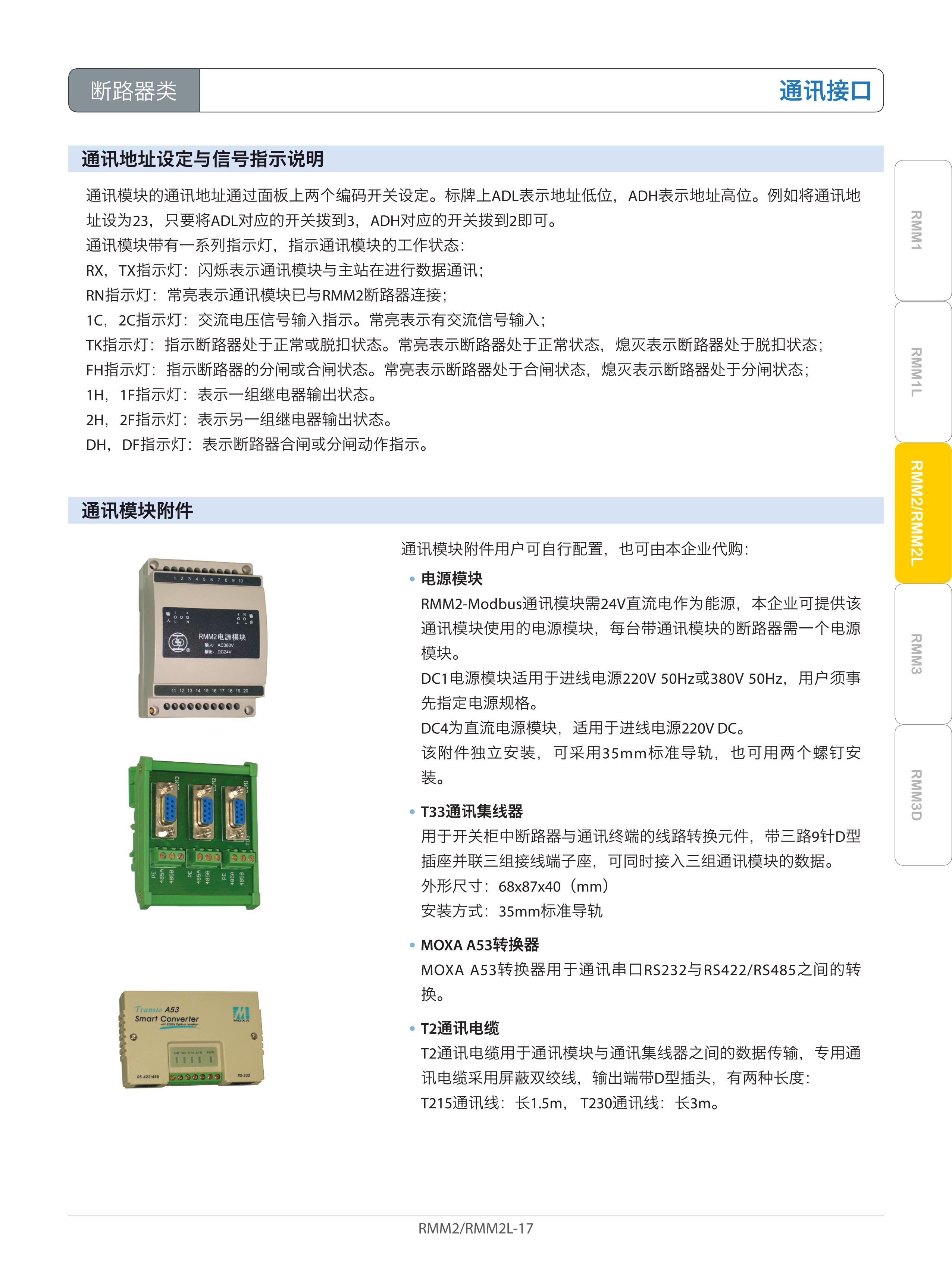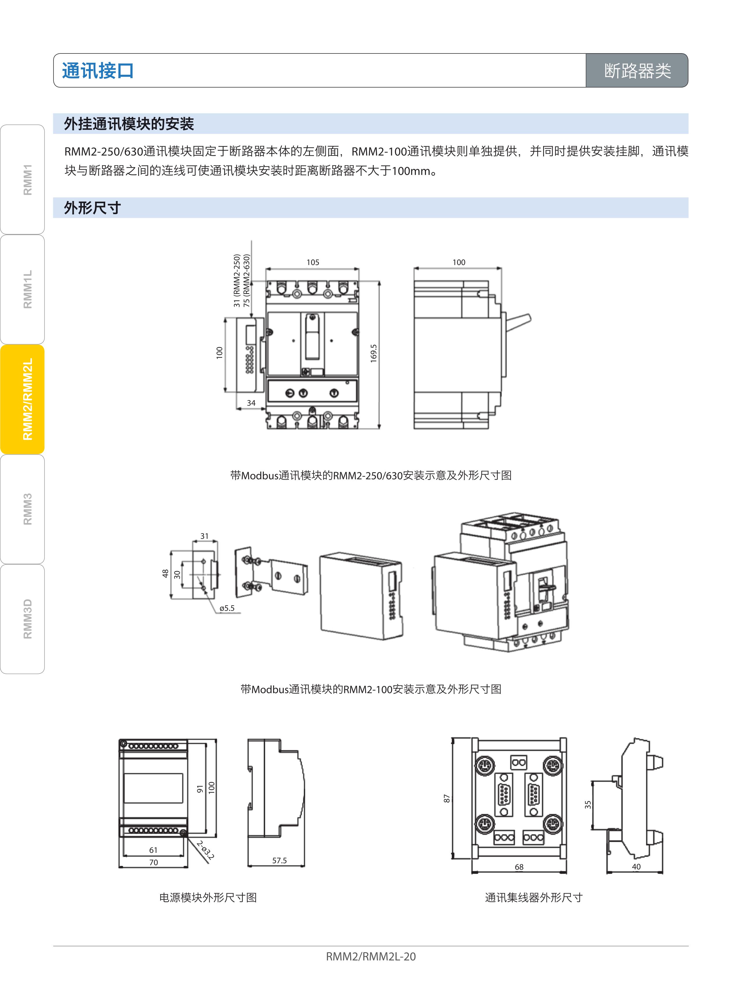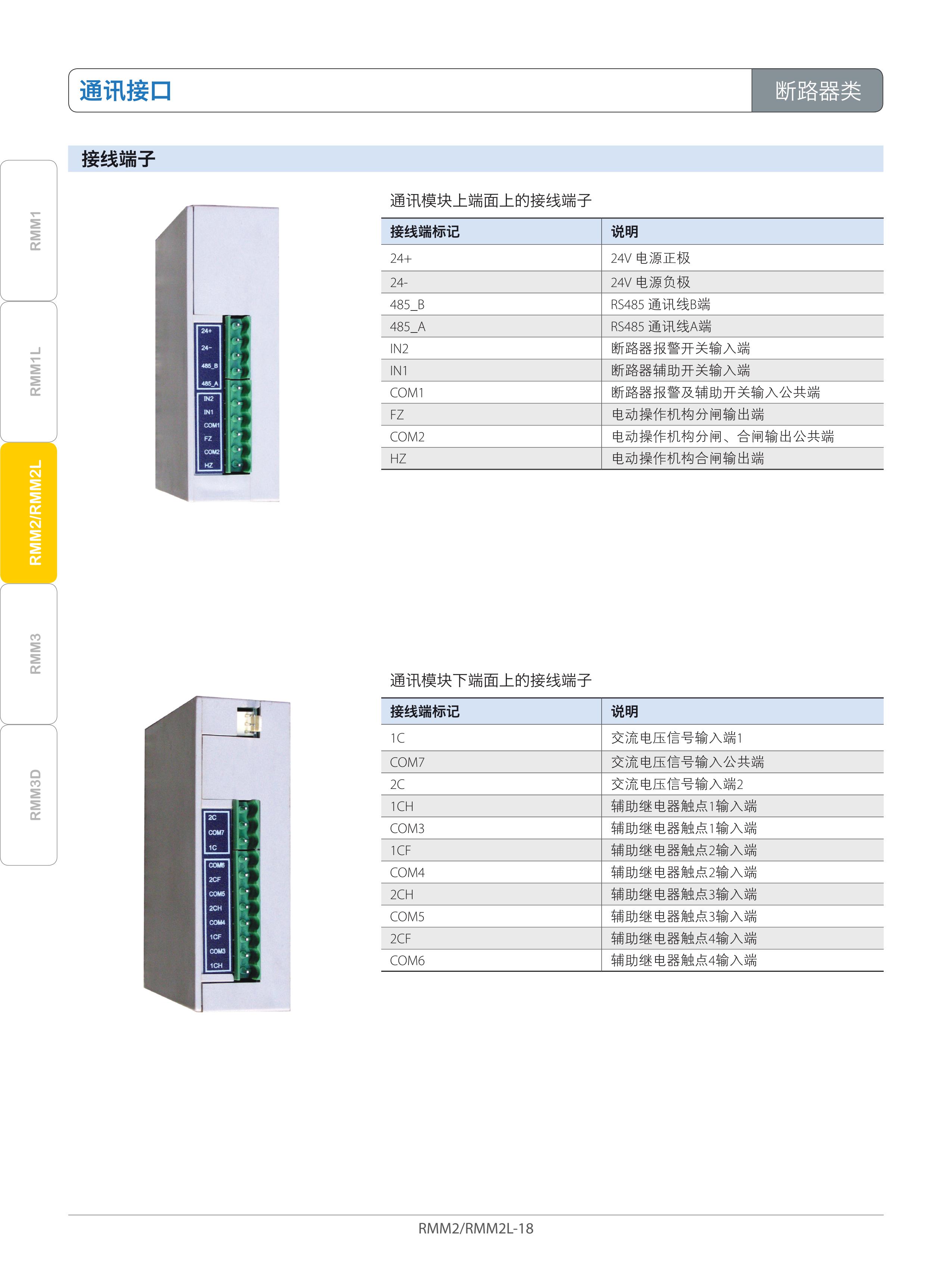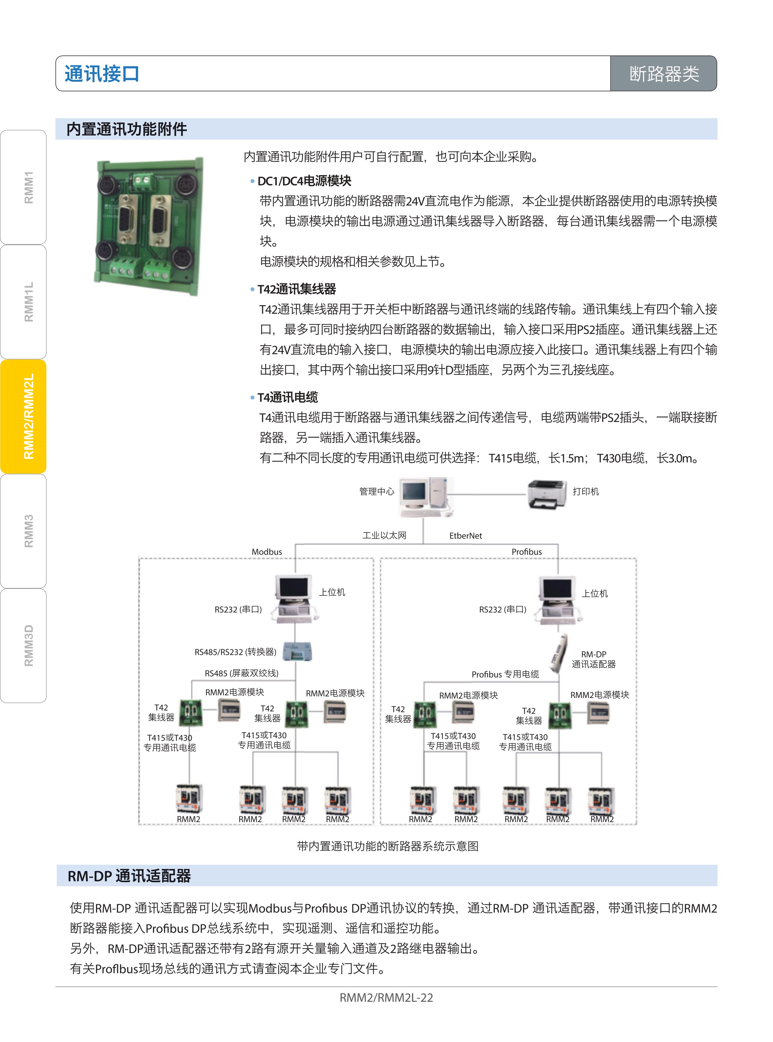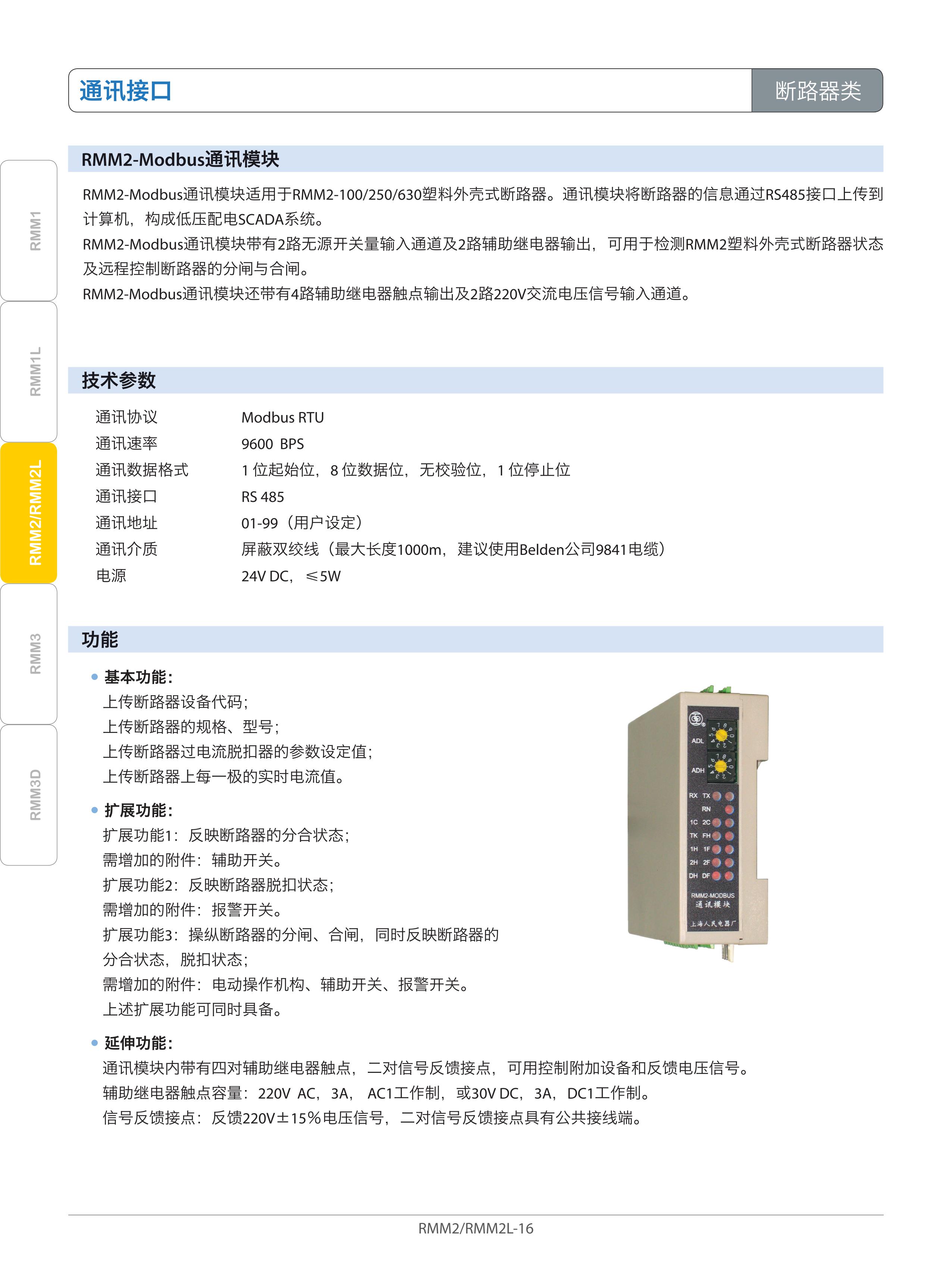 RMM2塑料外壳式断路器额定绝缘电压800V,主要用于交流50Hz,额定工作电压400V,额定电流630A及以下的配电网络中,作为分配电能和保护线路及电源设备免受过载、欠电压、短路等故障的危害。断路器也可对电动机进行过载、欠电压和短路保护。RMM2塑料外壳式断路器带接地故障保护型过电流脱扣器后,除了原有的过载、短路保护功能之外,新增加了接地故障保护功能。可以对一般过电流保护装置不能检测出的接地故障引起的火灾或其它危险提供保护。RMM2塑料外壳式断路器可带通讯功能,将断路器上的信息通过现场总线上传到控制计算机上,并能通过计算机操纵断路器的合闸和断开。