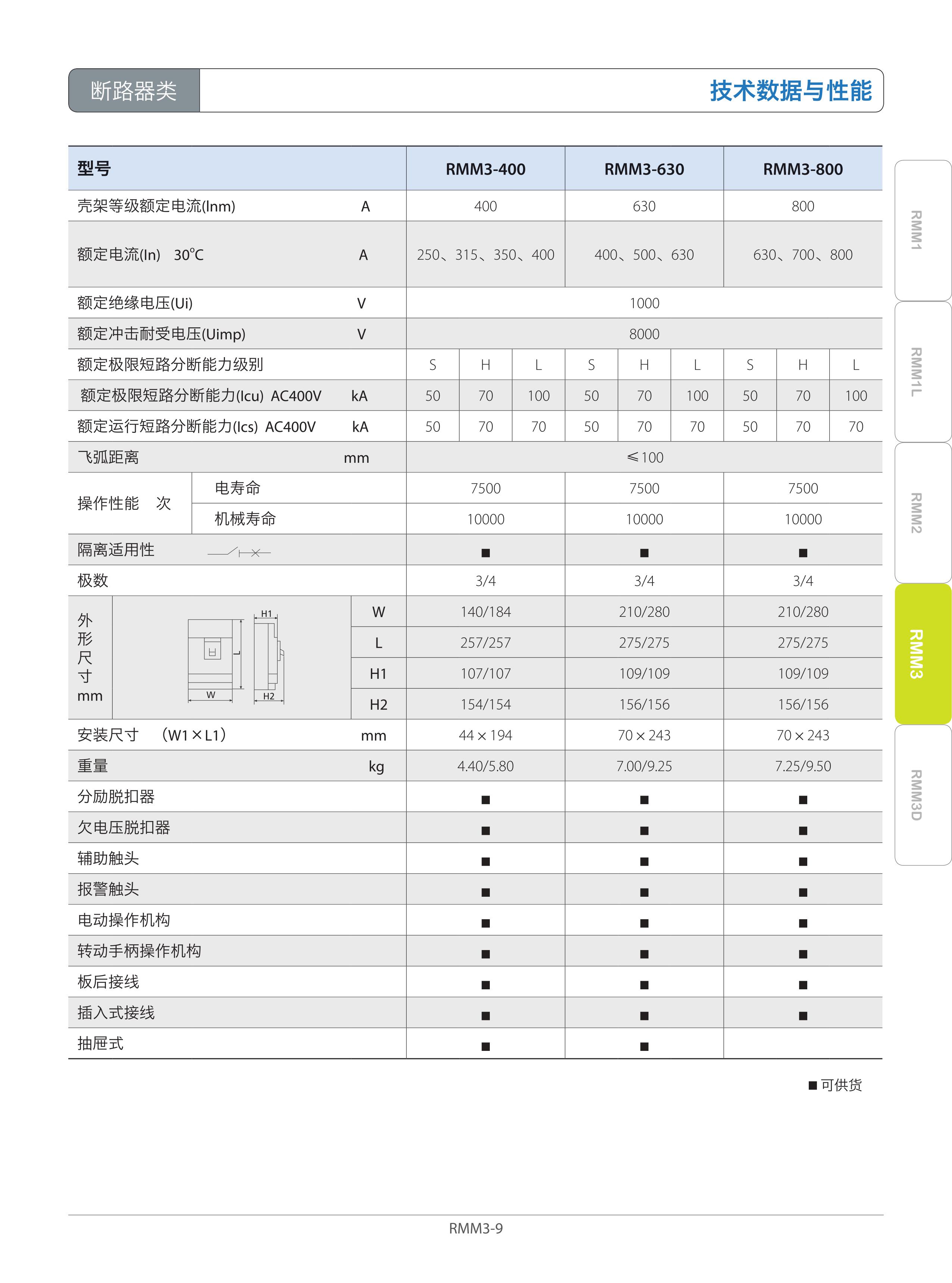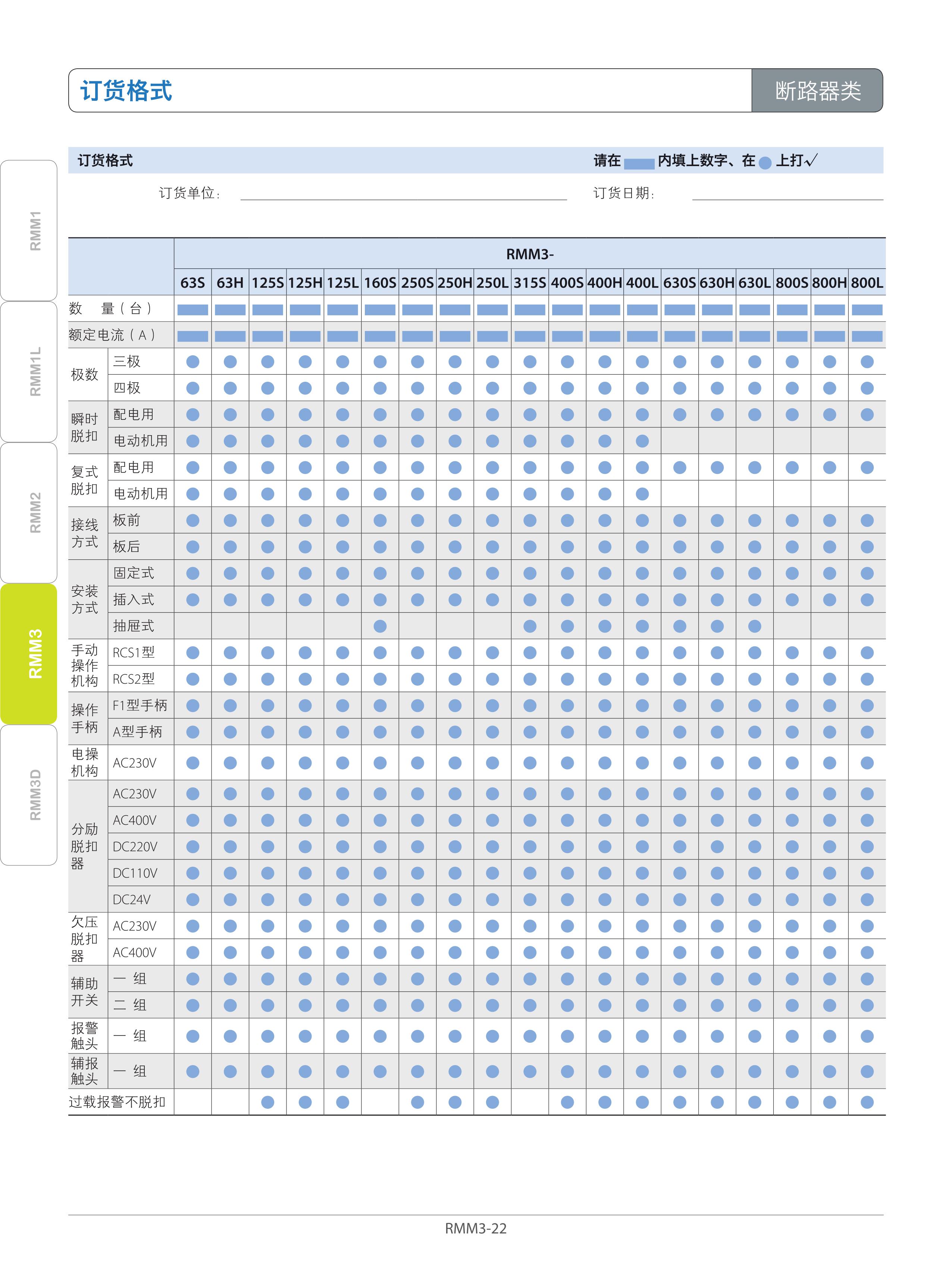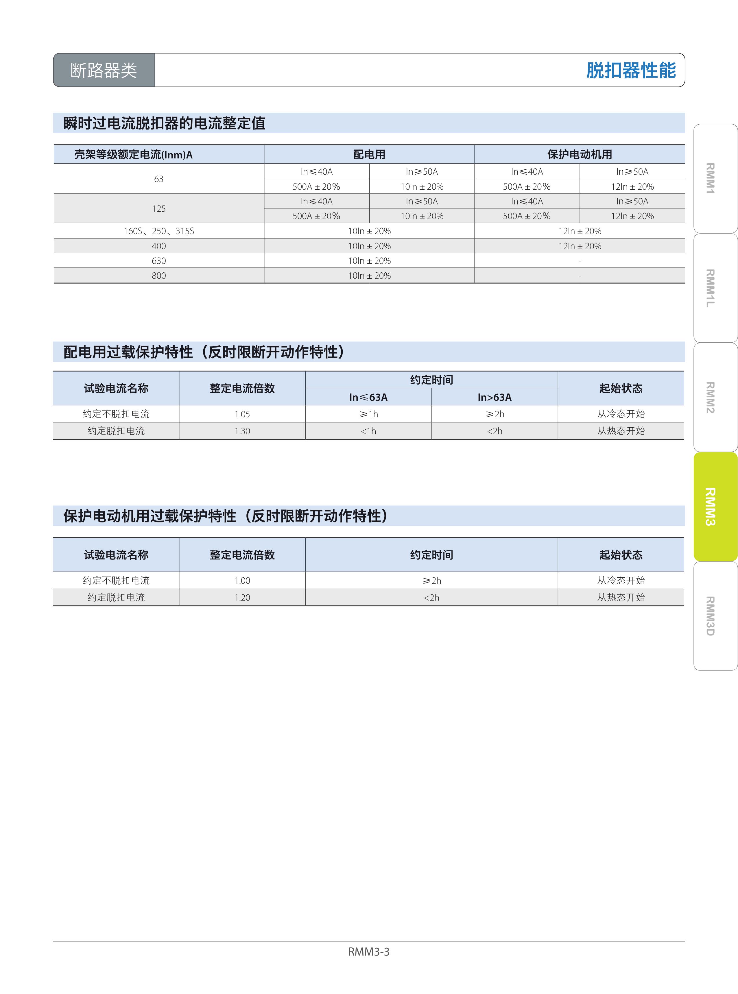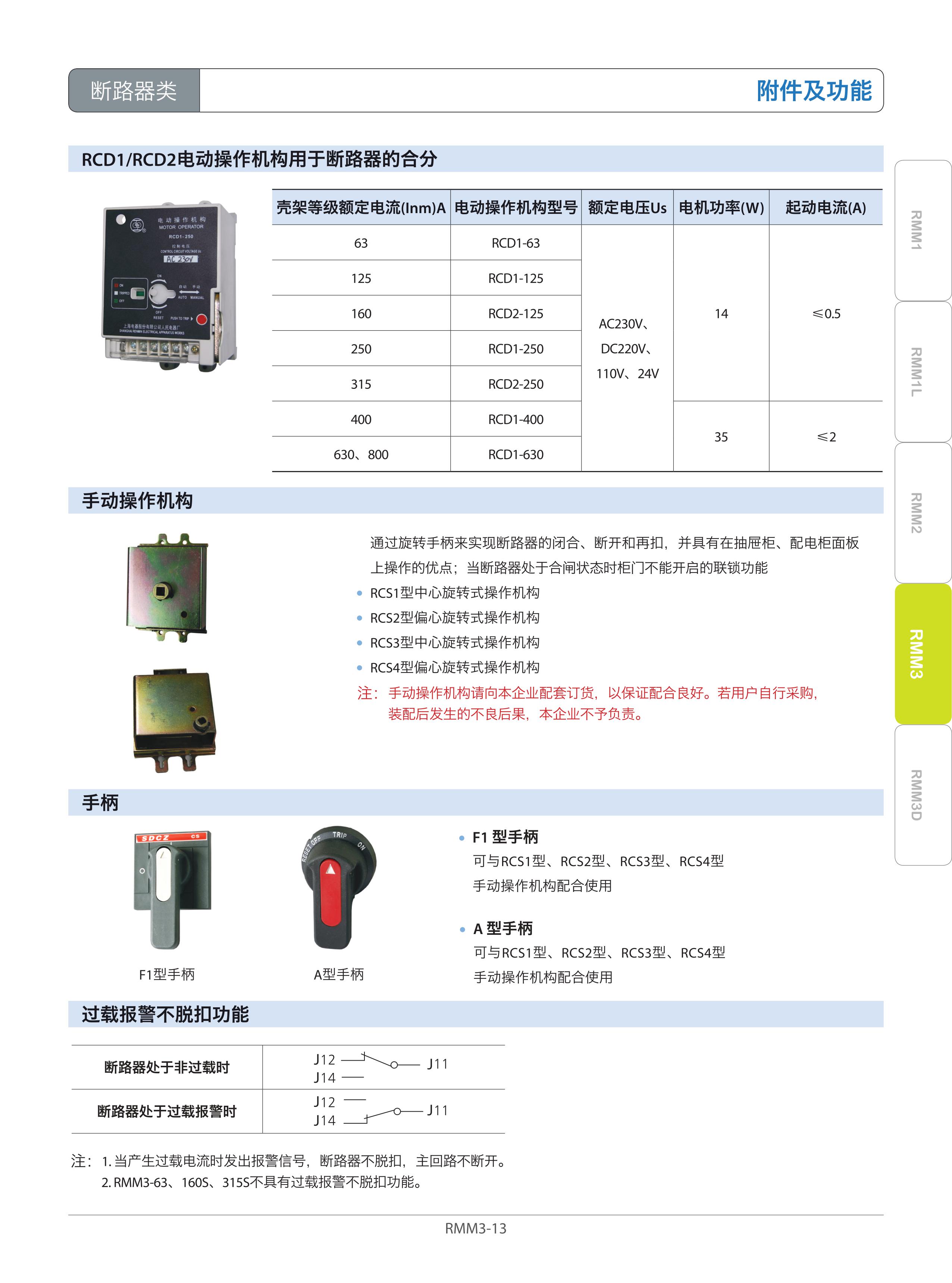 RMM3系列塑料外壳式断路器适用于交流50Hz额定工作电压400V,额定电流至800A的配电网络中用于分配电能和保护线路、电源及用电设备免受过载、欠电压和短路的危害,提高了供电可靠性,在正常条件下可作为线路的不频繁转换及电动机的不频繁启动之用。并具有过载报警不脱扣和隔离功能。