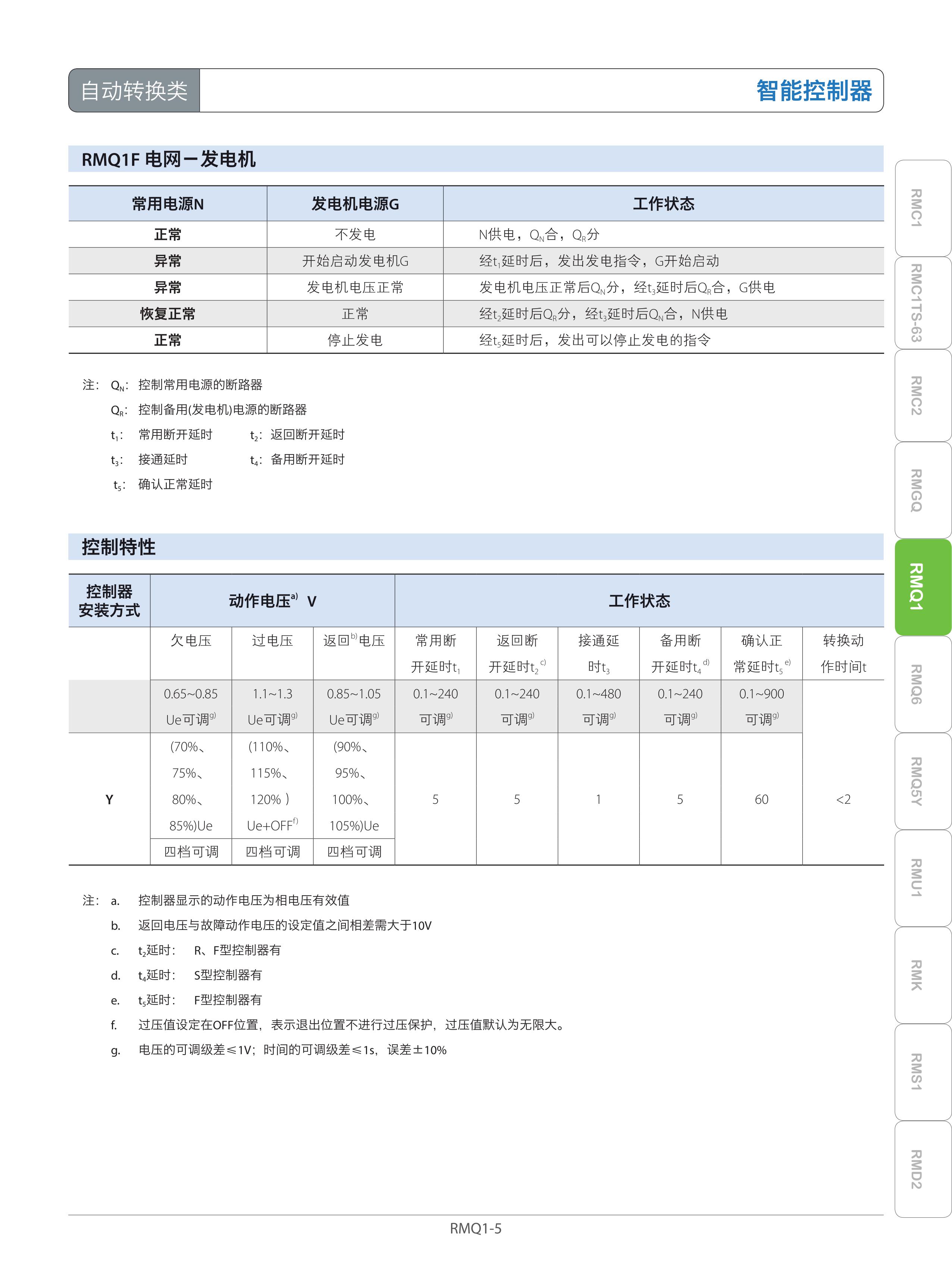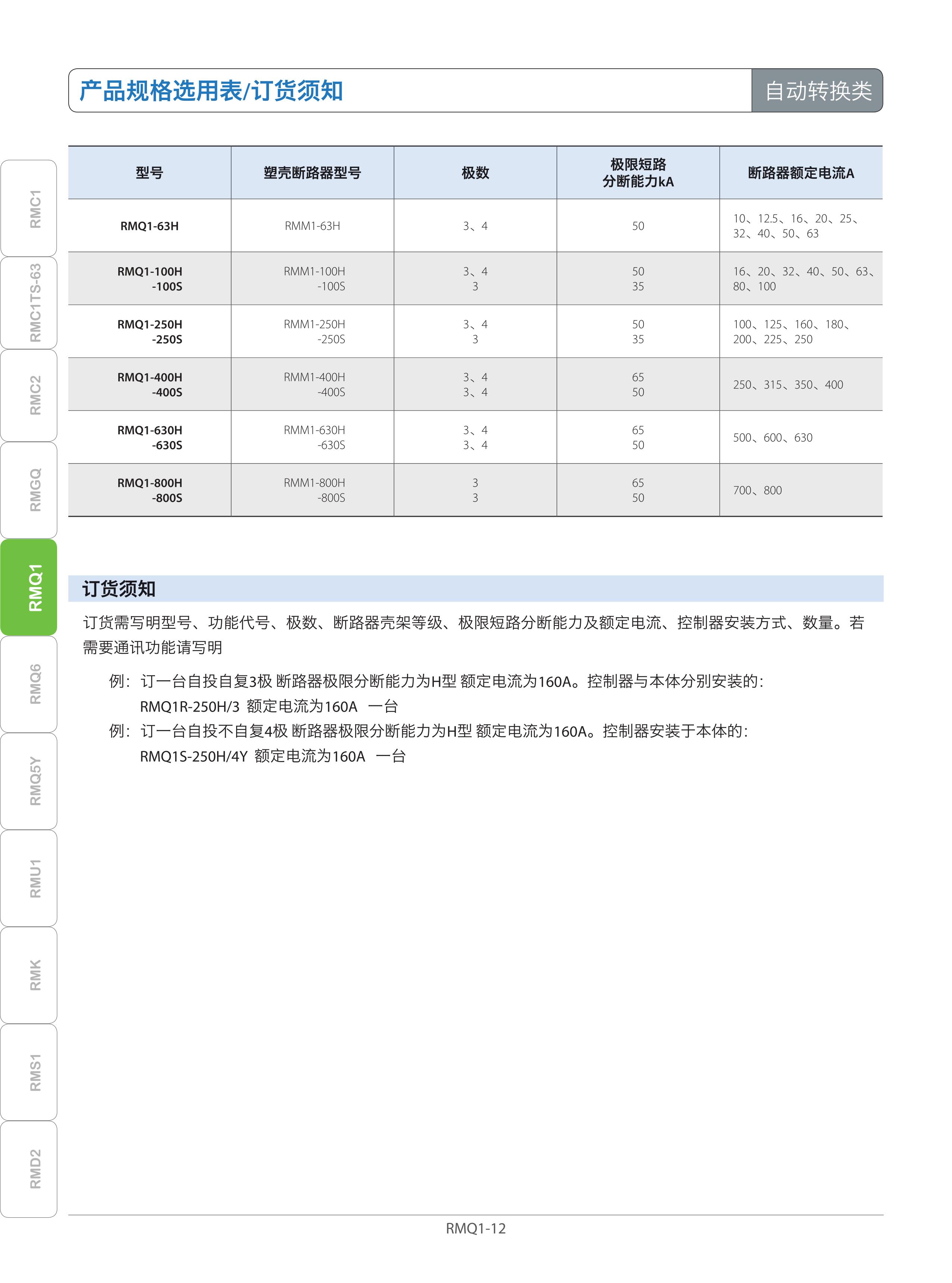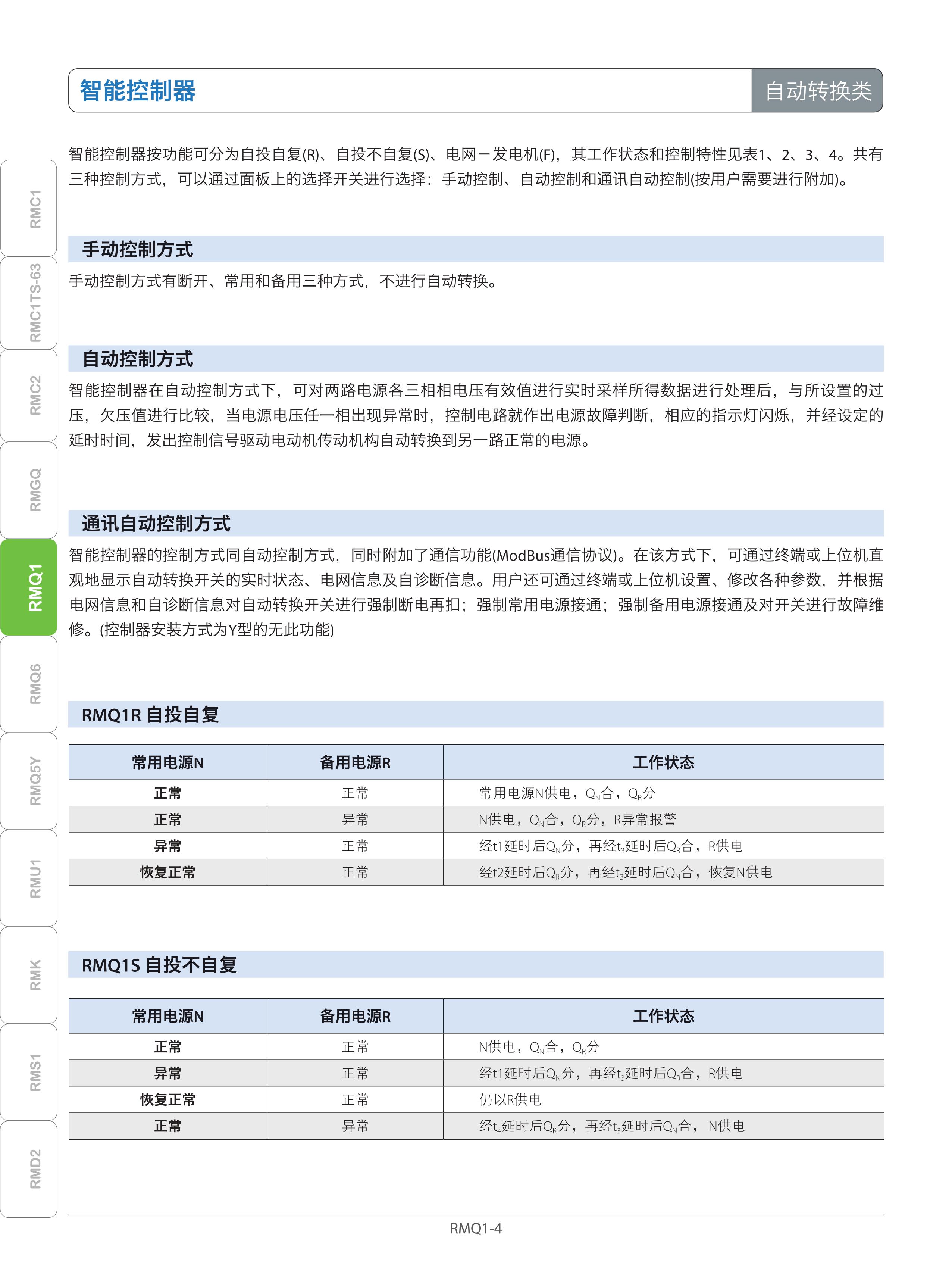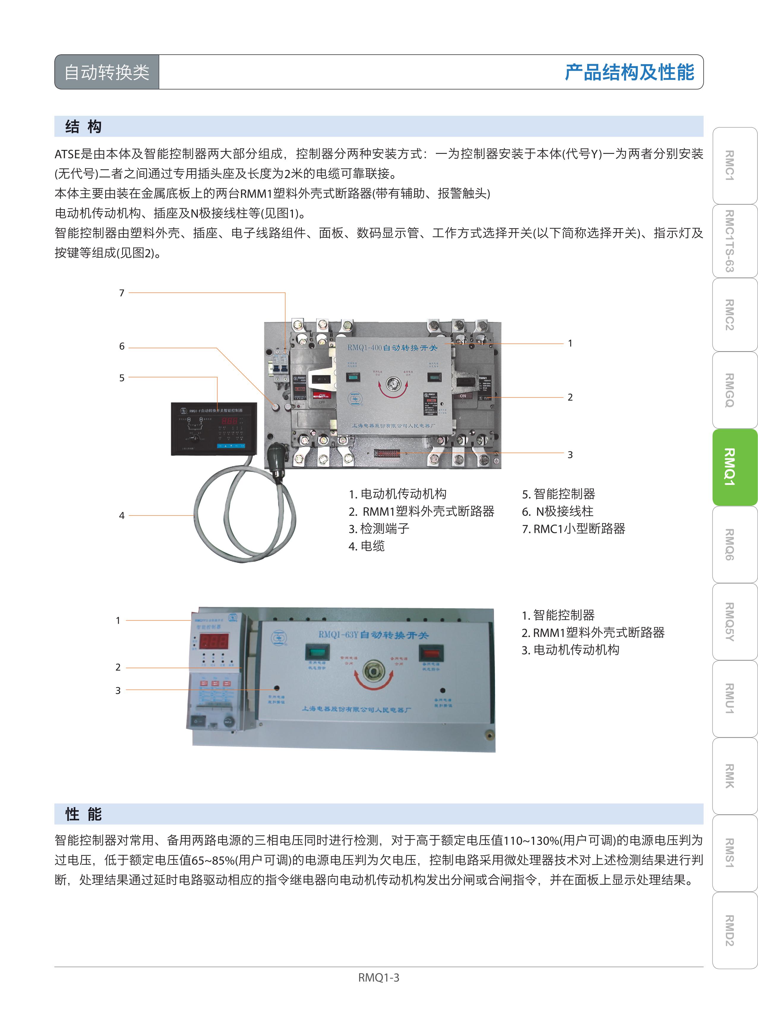 RMQ1系列自动转换开关(以下简称ATSE)系CB级,适用于交流50Hz,额定工作电压400V,额定电流至800A及以下的三相四线双路供电电源(常用电源和备用电源或发电机电源),当一路电源发生欠电压、过电压或断相时能自动地切换至另一路正常电源,并对负载电路具有过电流保护。在需要持续不间断供电的场所和负载的电源系统中,当常用电源发生故障或断电时,要求备用电源在极短的时间内投入使用,RMQ1自动转换开关就具备达到上述要求的功能。使用类别AC-33iB。