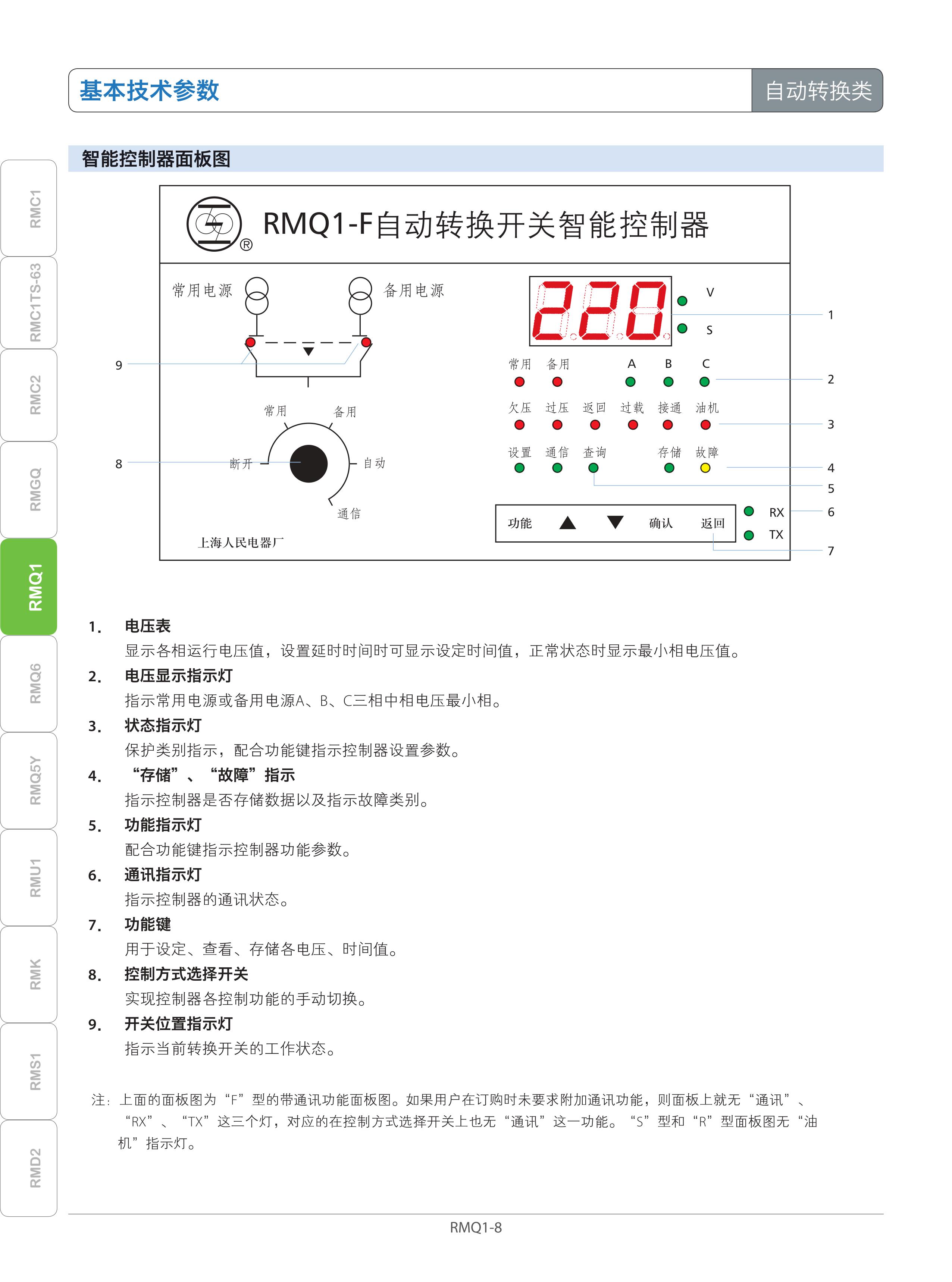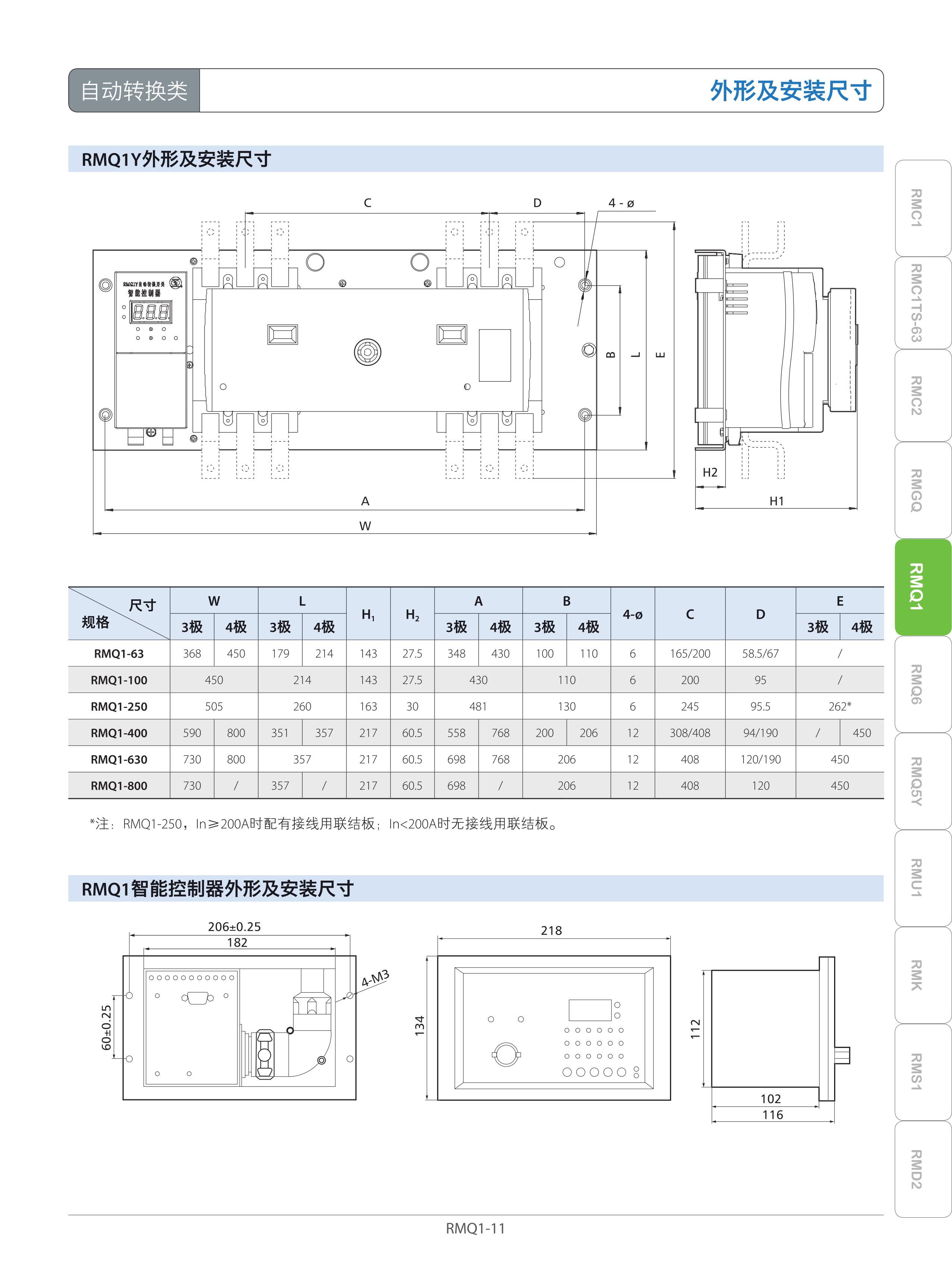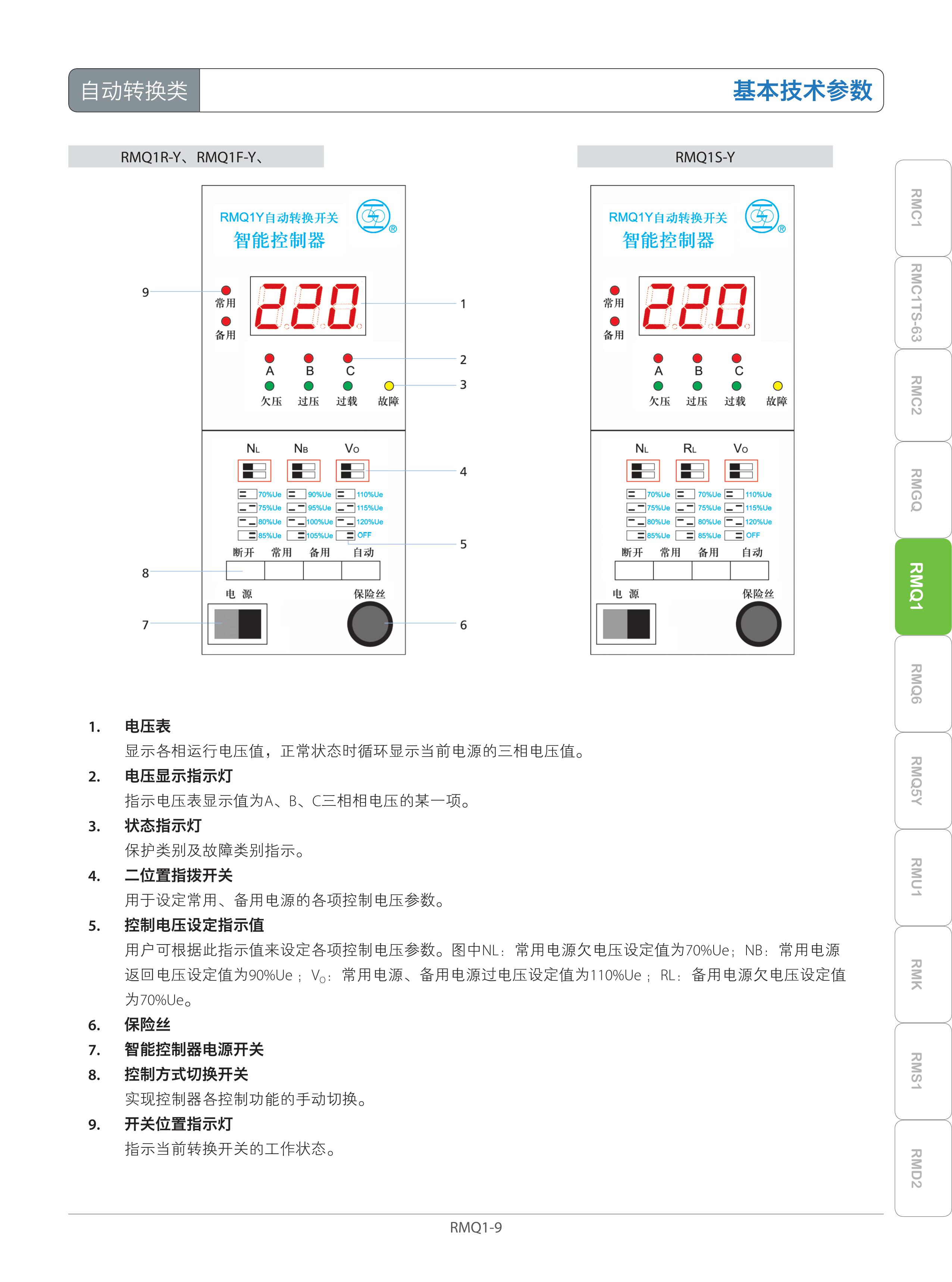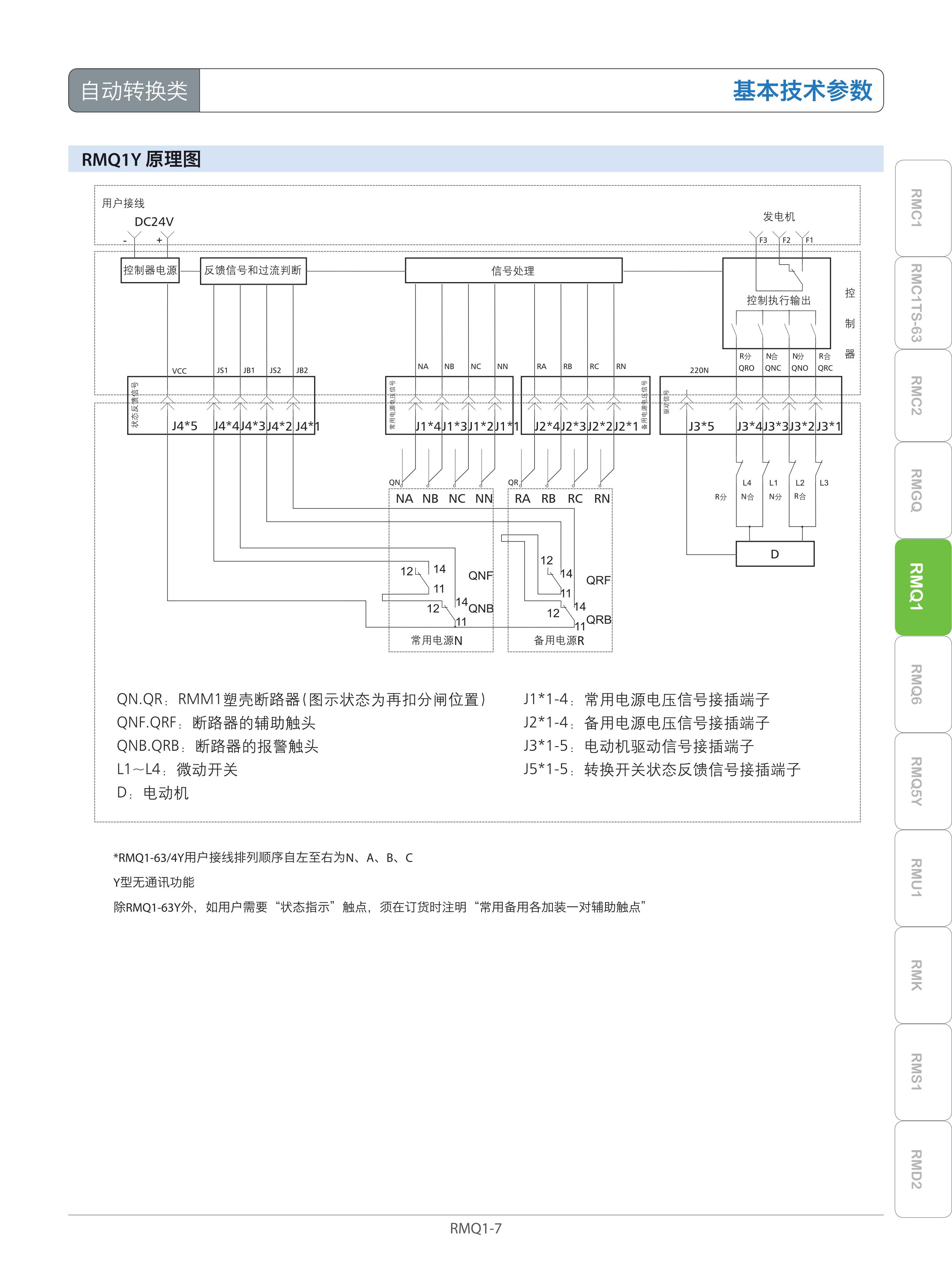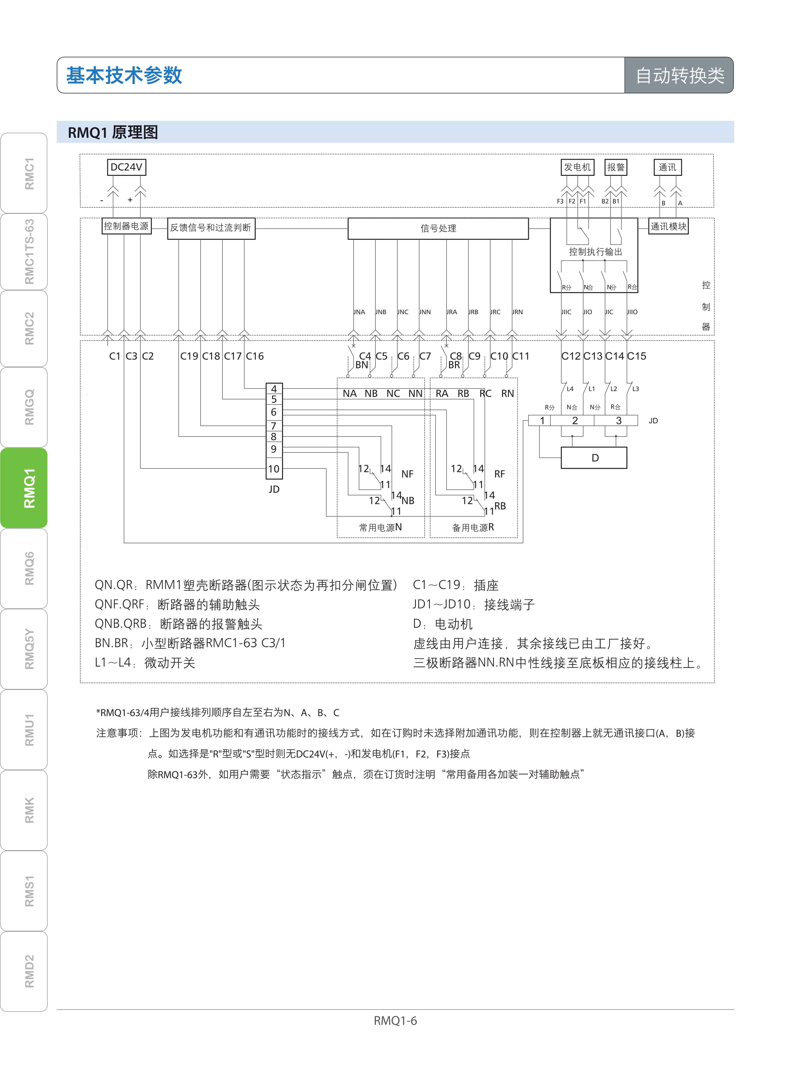 RMQ1系列自动转换开关(以下简称ATSE)系CB级,适用于交流50Hz,额定工作电压400V,额定电流至800A及以下的三相四线双路供电电源(常用电源和备用电源或发电机电源),当一路电源发生欠电压、过电压或断相时能自动地切换至另一路正常电源,并对负载电路具有过电流保护。在需要持续不间断供电的场所和负载的电源系统中,当常用电源发生故障或断电时,要求备用电源在极短的时间内投入使用,RMQ1自动转换开关就具备达到上述要求的功能。使用类别AC-33iB。