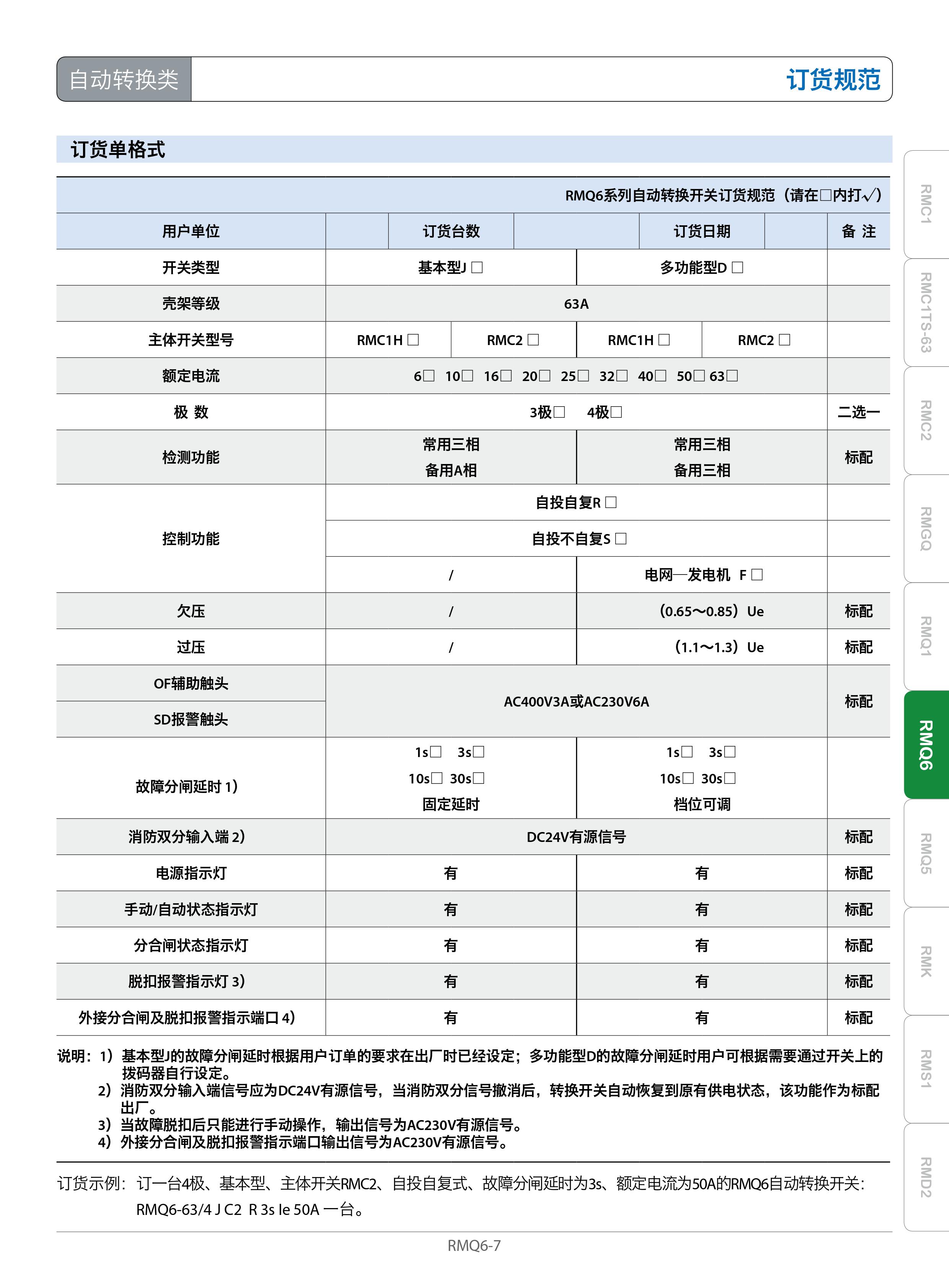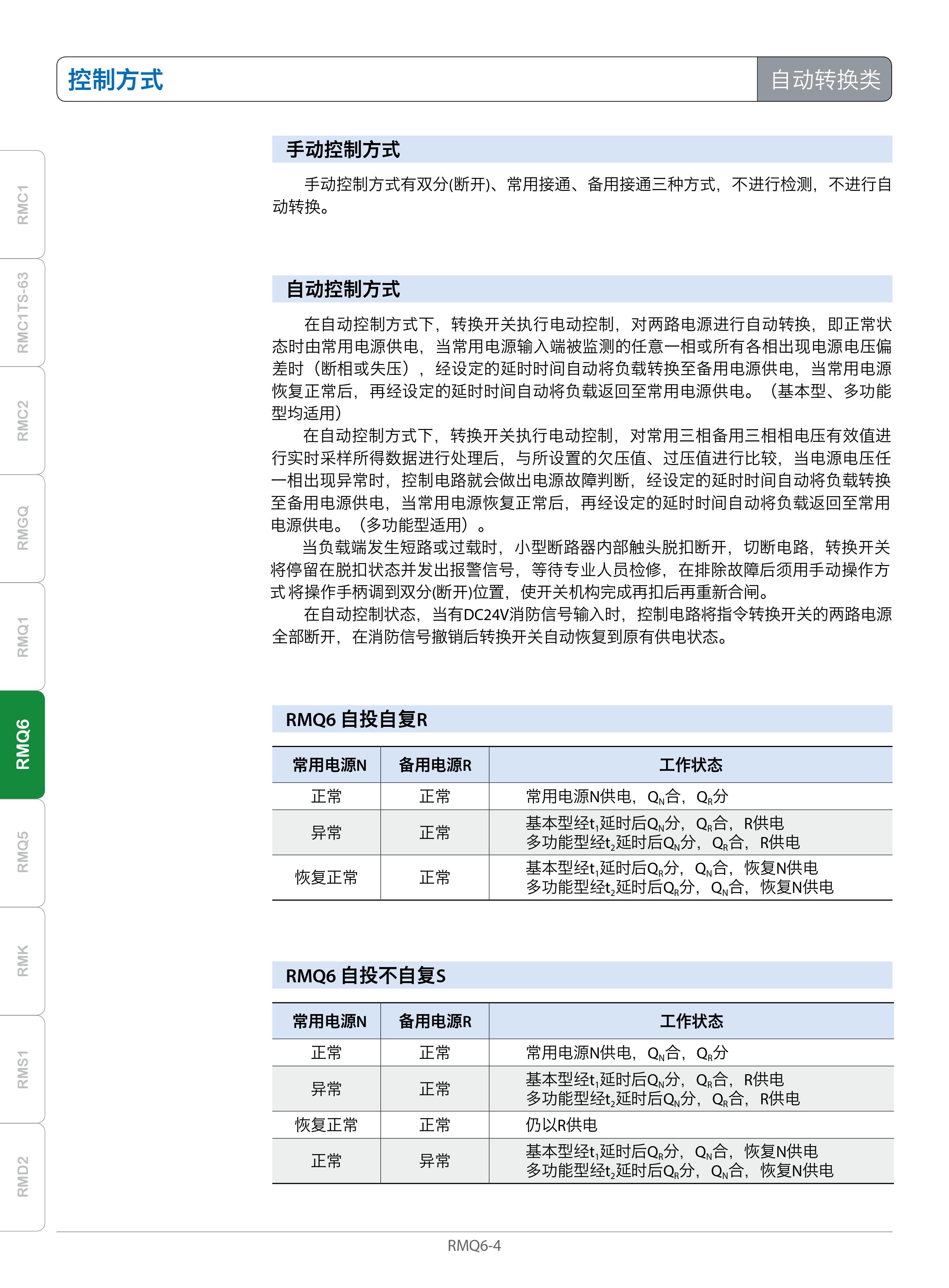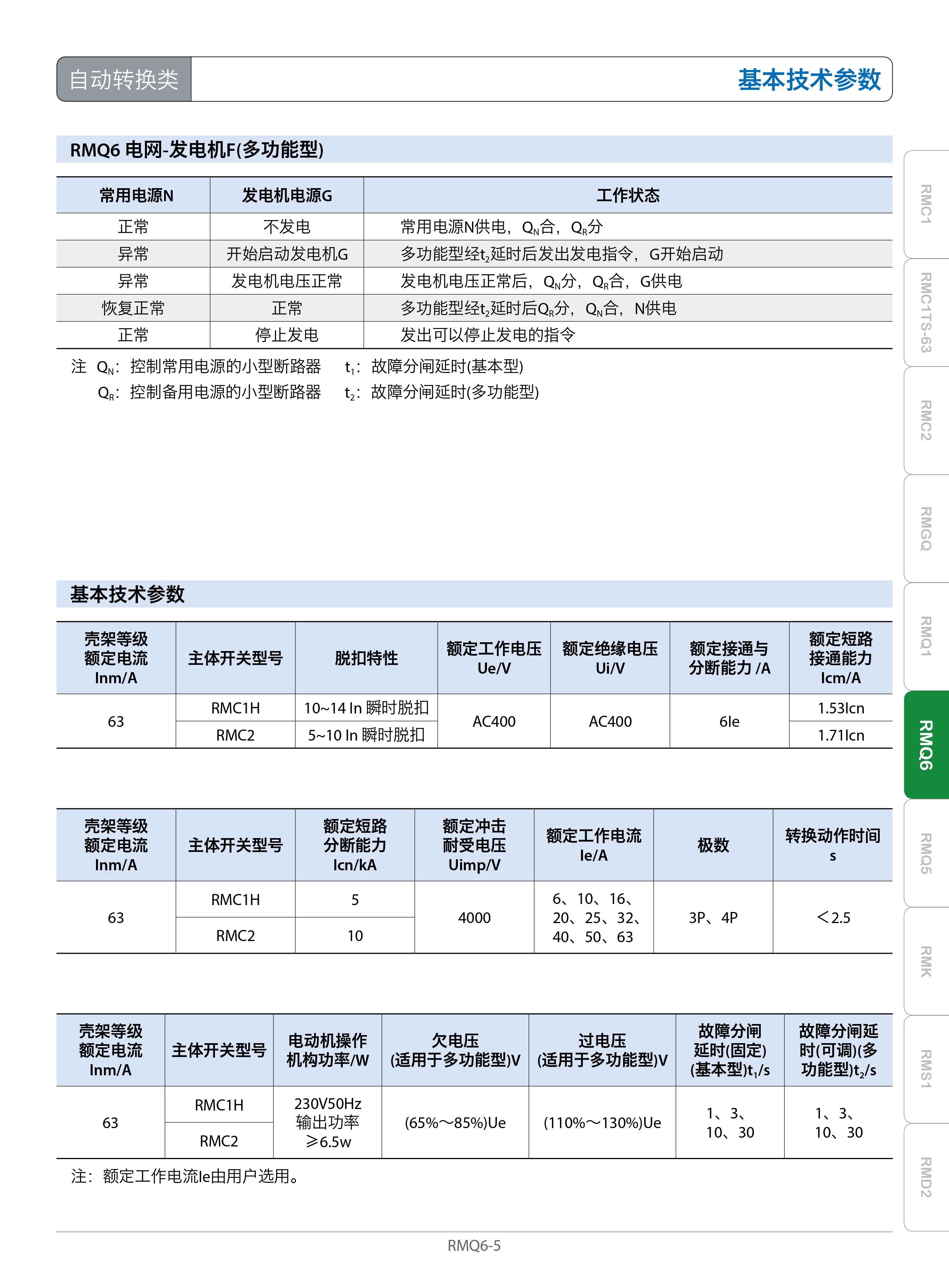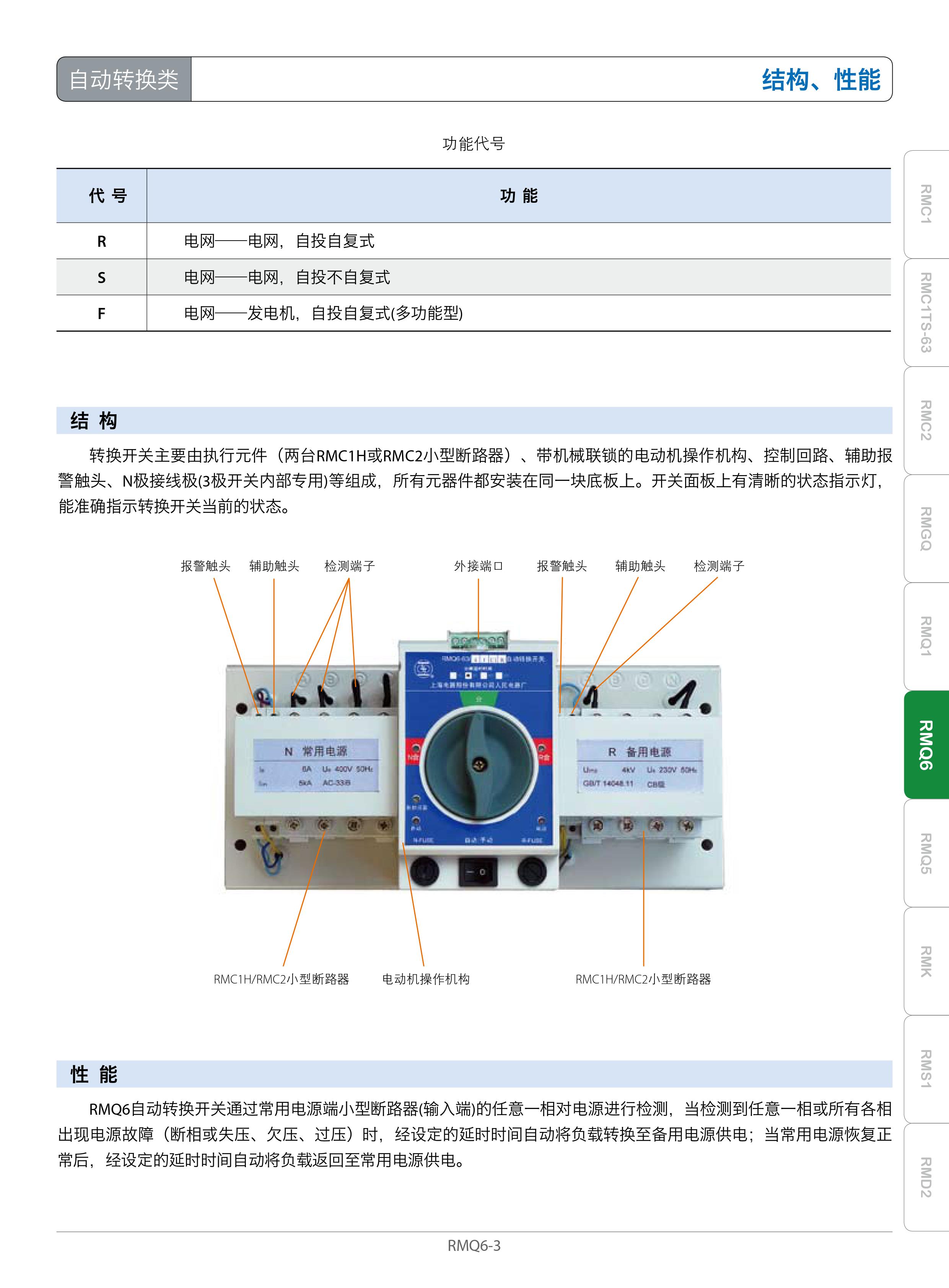 RMQ6系列自动转换开关(以下简称转换开关)属于CB级,适用于交流50Hz,额定工作电压400V,额定电流至63A及以下的三相四线双路供电电网中(电网-电网、电网—发电机),当常用电源输入端的任意一相或所有各相出现电源故障(断相或失压、欠压、过压)时,经设定的延时时间自动将负载转换至备用电源供电;当常用电源恢复正常后,经设定的延时时间自动将负载返回至常用电源供电。并对负载电路具有短路和过电流保护。