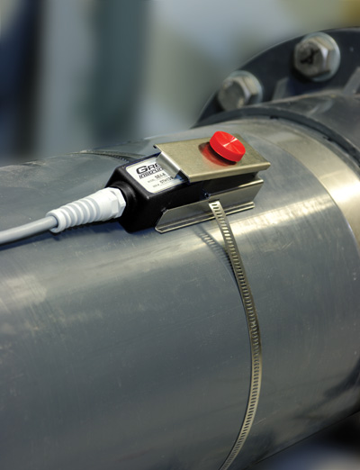 The flow sensor shall be single-head, ultrasonic in a stainless steel housing. It shall be installed on the outside of a pipe without interrupting flow. The sensor shall be capable of continuous operation at temperatures from -40°F to 300°F (-40°C to 150°C), and to withstand accidental submersion pressures to 10 psi. Manufacturer’s recommended coupling compound and stainless steel mounting clamp shall be included.