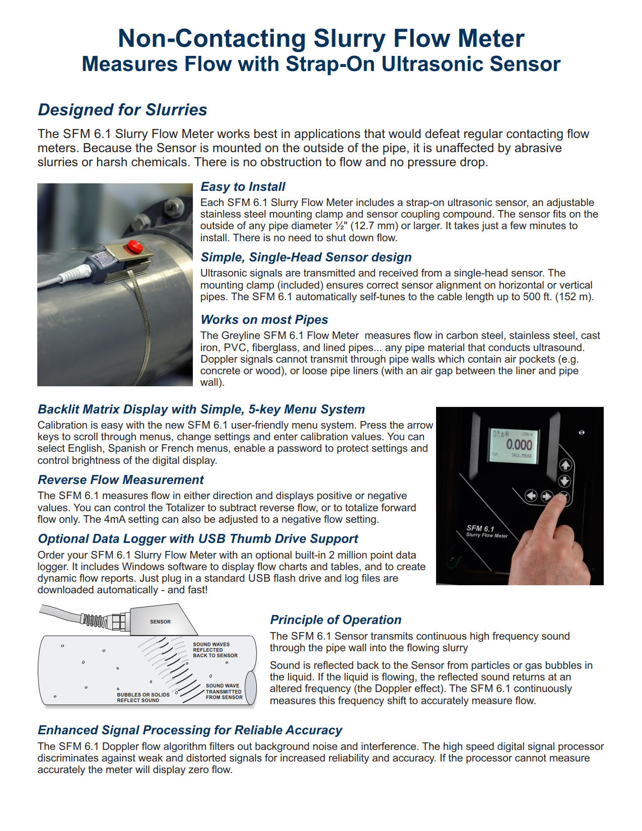 The SFM 6.1 Slurry Flow Meter works best in applications that would defeat regular contacting flow meters. Because the Sensor is mounted on the outside of the pipe, it is unaffected by abrasive slurries or harsh chemicals. There is no obstruction to flow and no pressure drop.