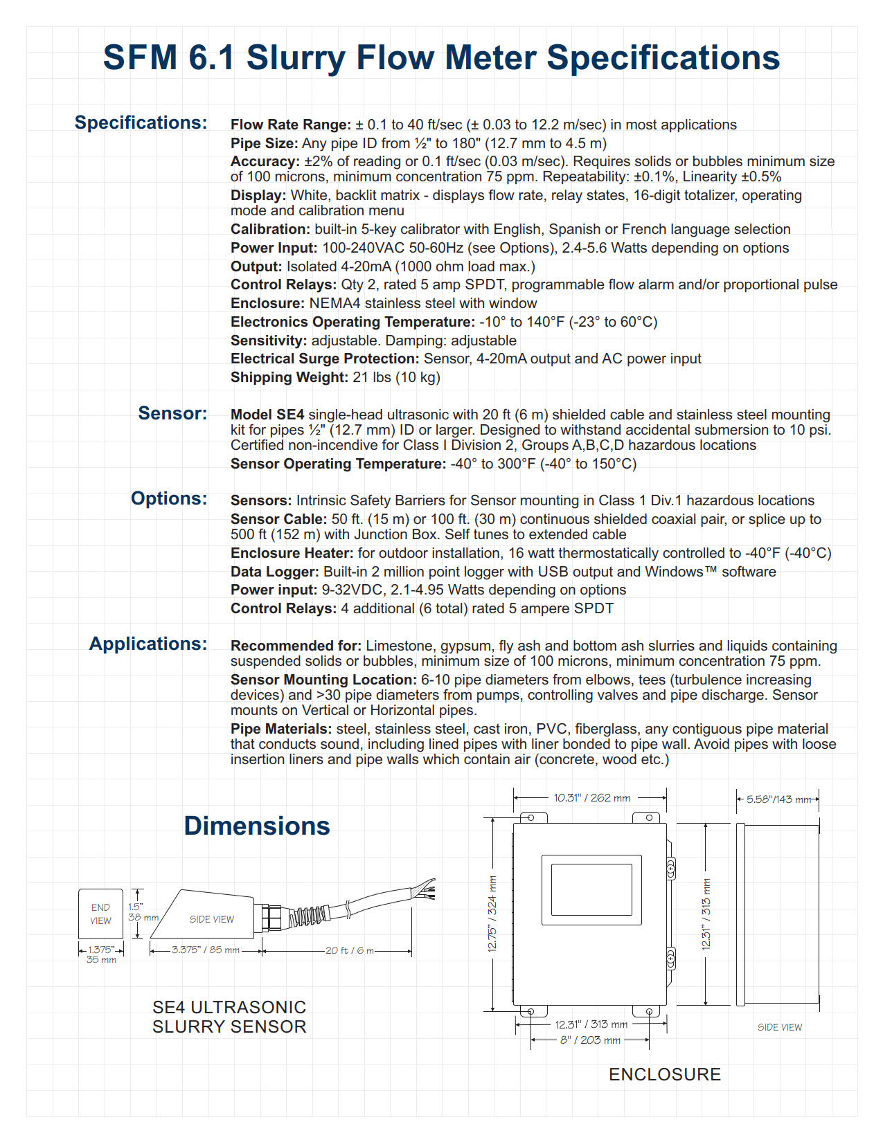 Each SFM 6.1 Slurry Flow Meter includes a strap-on ultrasonic sensor, an adjustable stainless steel mounting clamp and sensor coupling compound. The sensor fits on the outside of any pipe diameter ?” (12.7 mm) or larger. It takes just a few minutes to install. There is no need to shut down flow.
