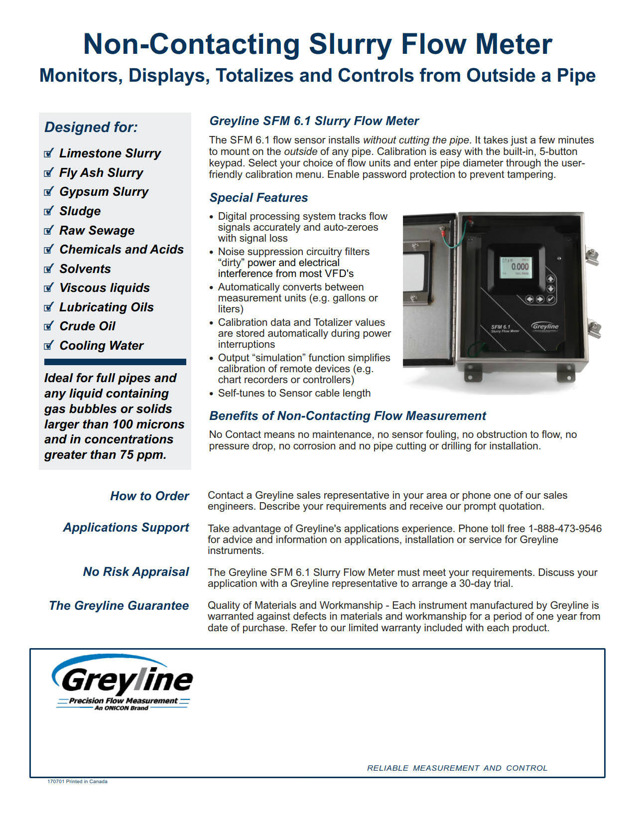 The instrument shall be a Model SFM 6.1 Slurry Flow Meter as manufactured by Greyline Instruments Inc., and warranted against defects in materials and workmanship for one year.