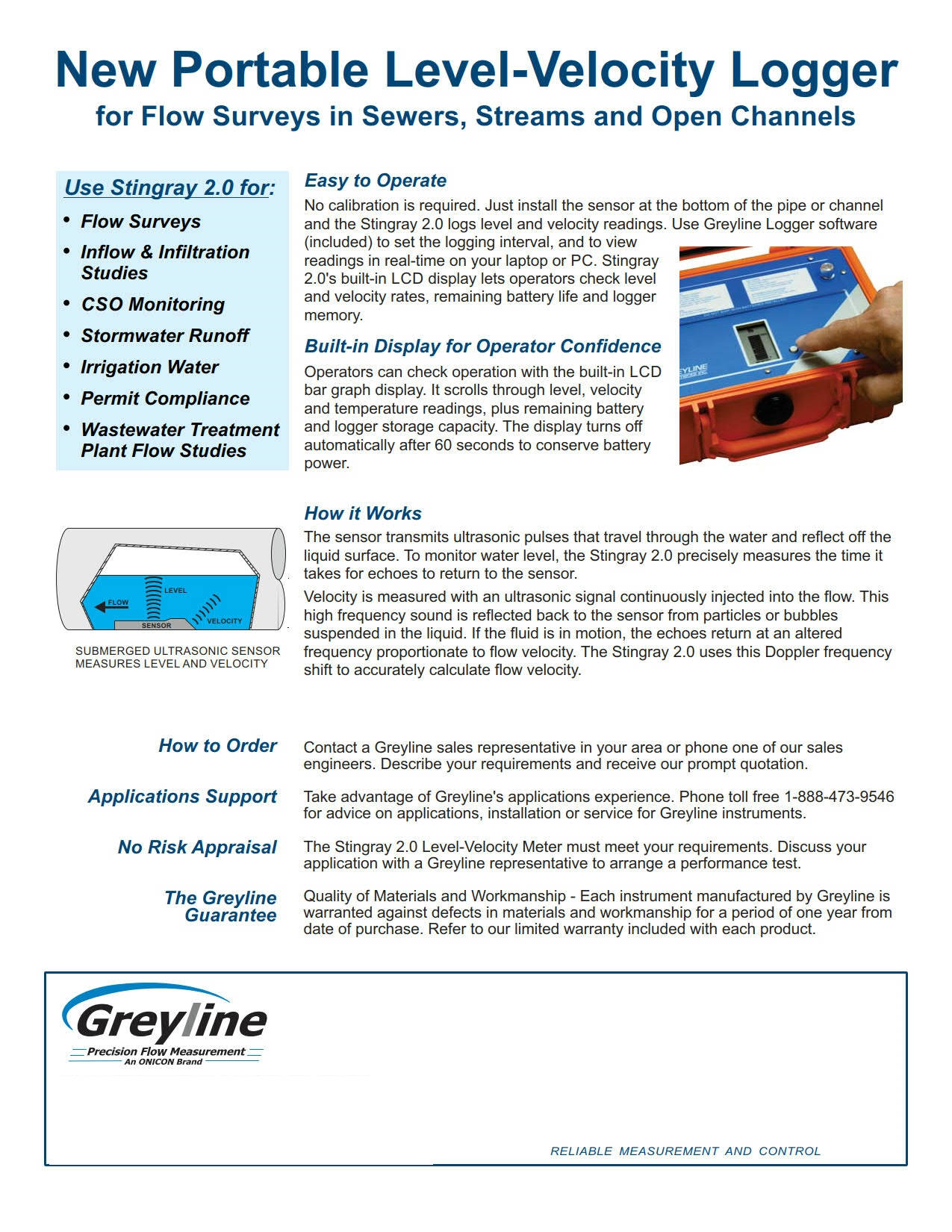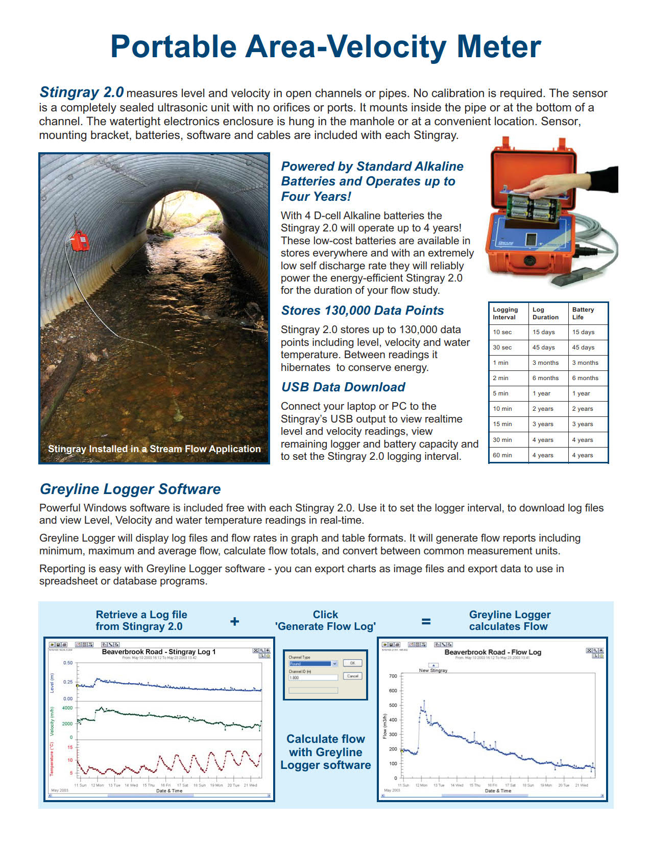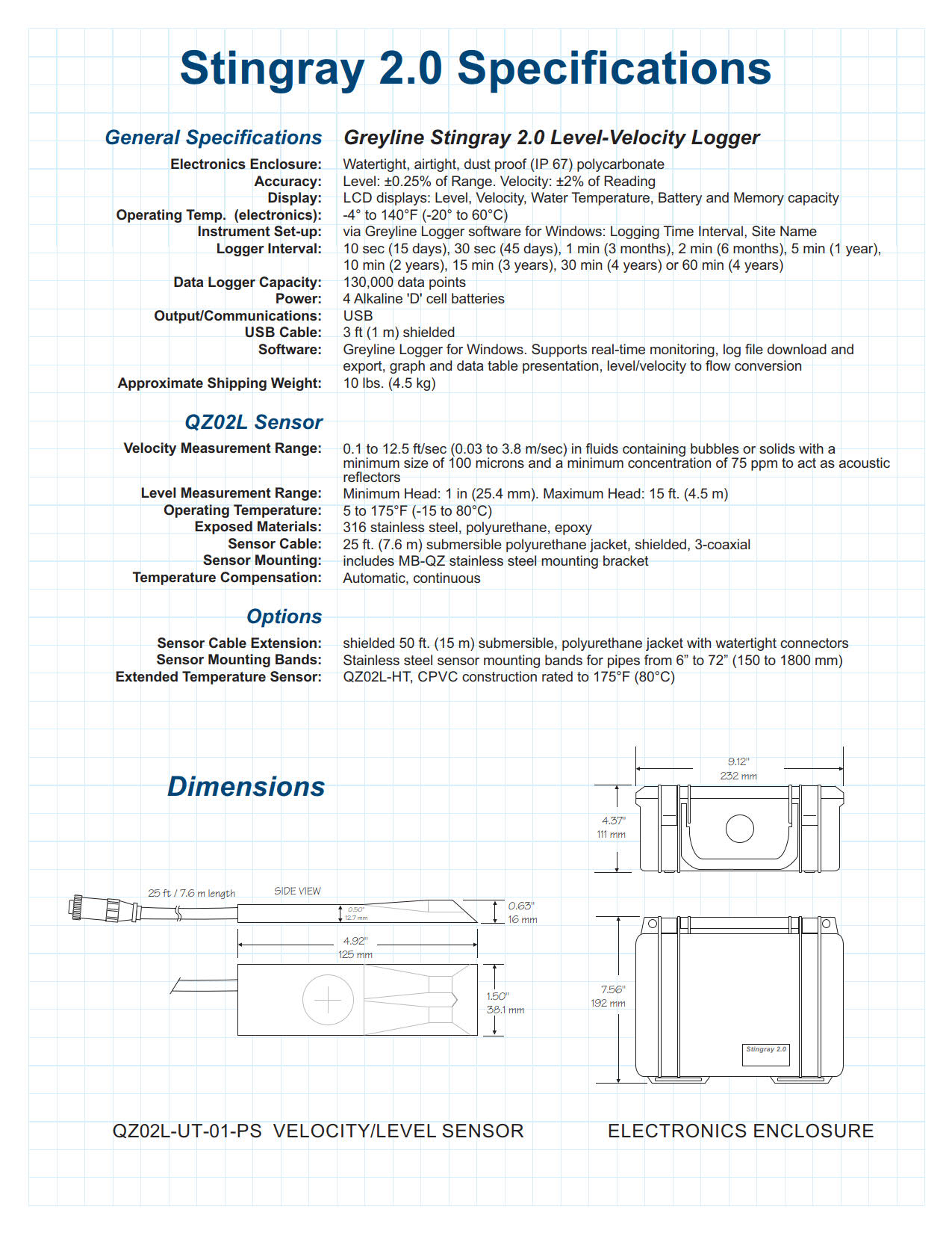 Level-Velocity Logger shall be Stingray 2.0 model by Greyline Instruments and warranted against defects in materials and workmanship for one year.