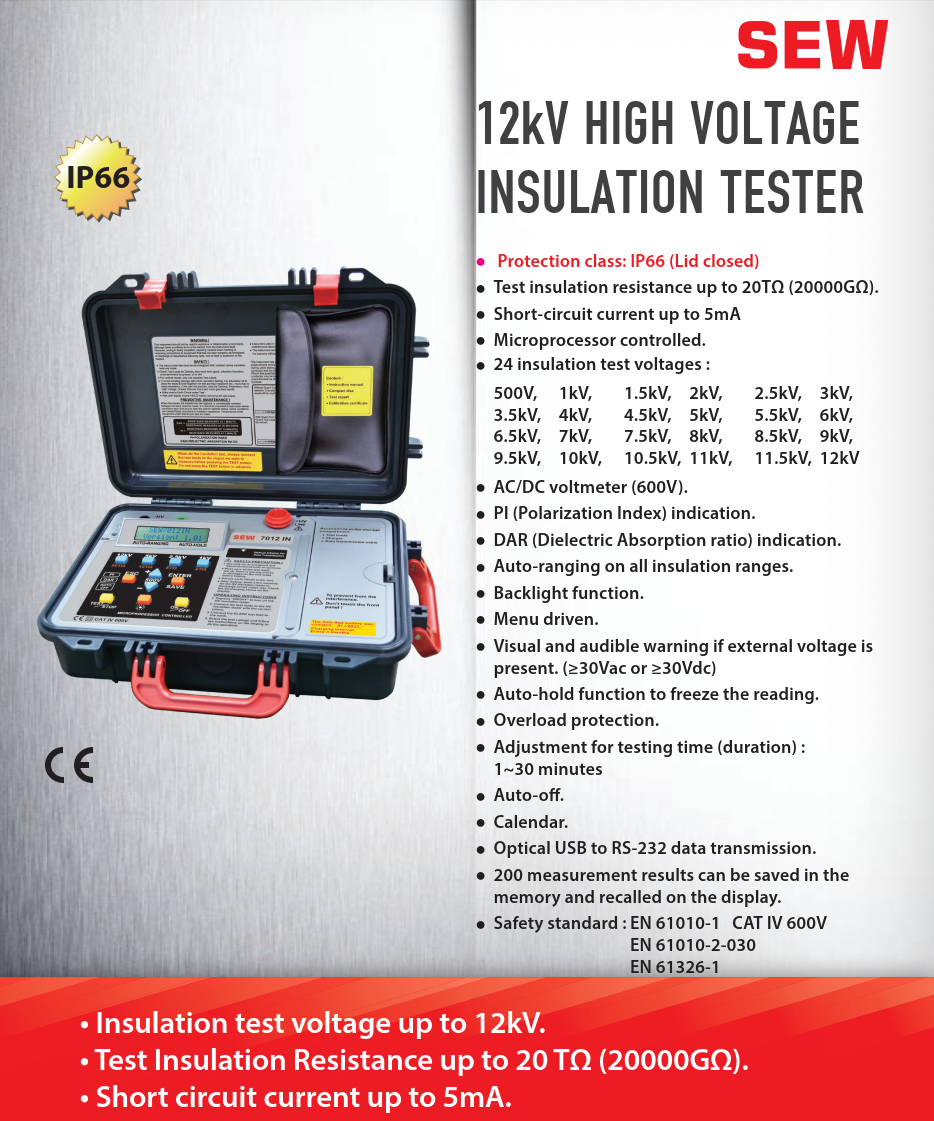 | Test voltage | From 500Vdc to 12kVdc Adjustable in 500V steps | |