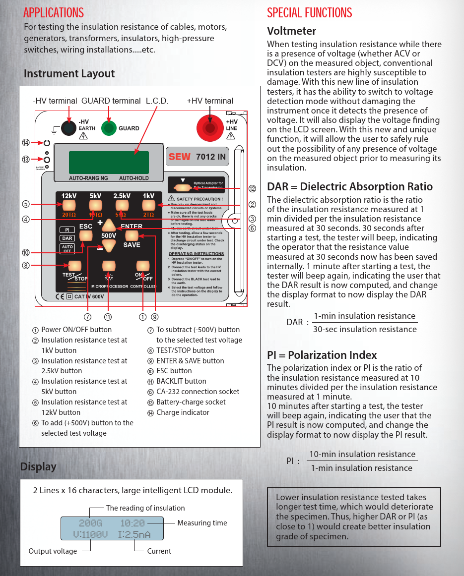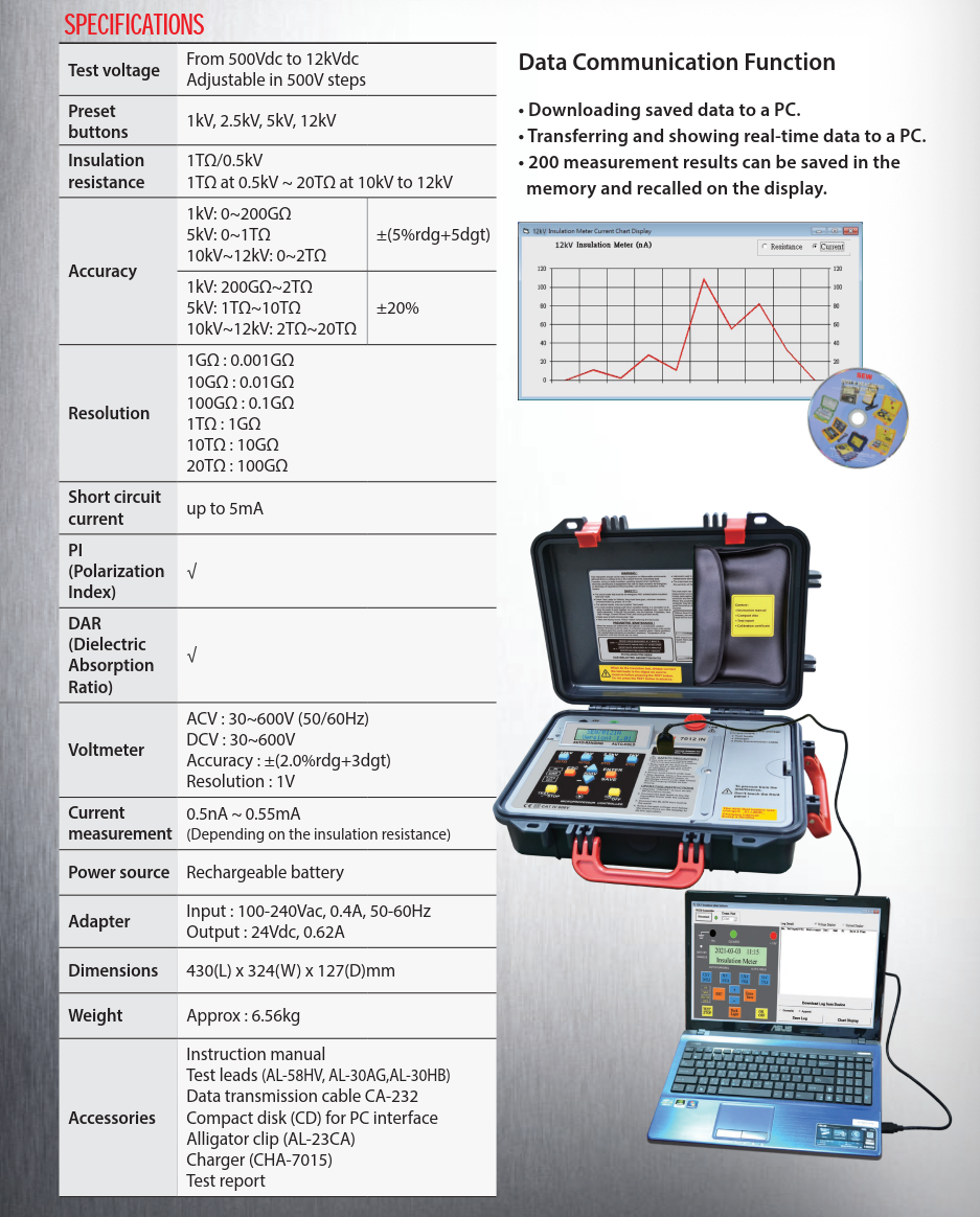 | Accuracy | 1kV: 0~200GΩ 5kV: 0~1TΩ 10kV~12kV: 0~2TΩ | ±(5%rdg+5dgt) |