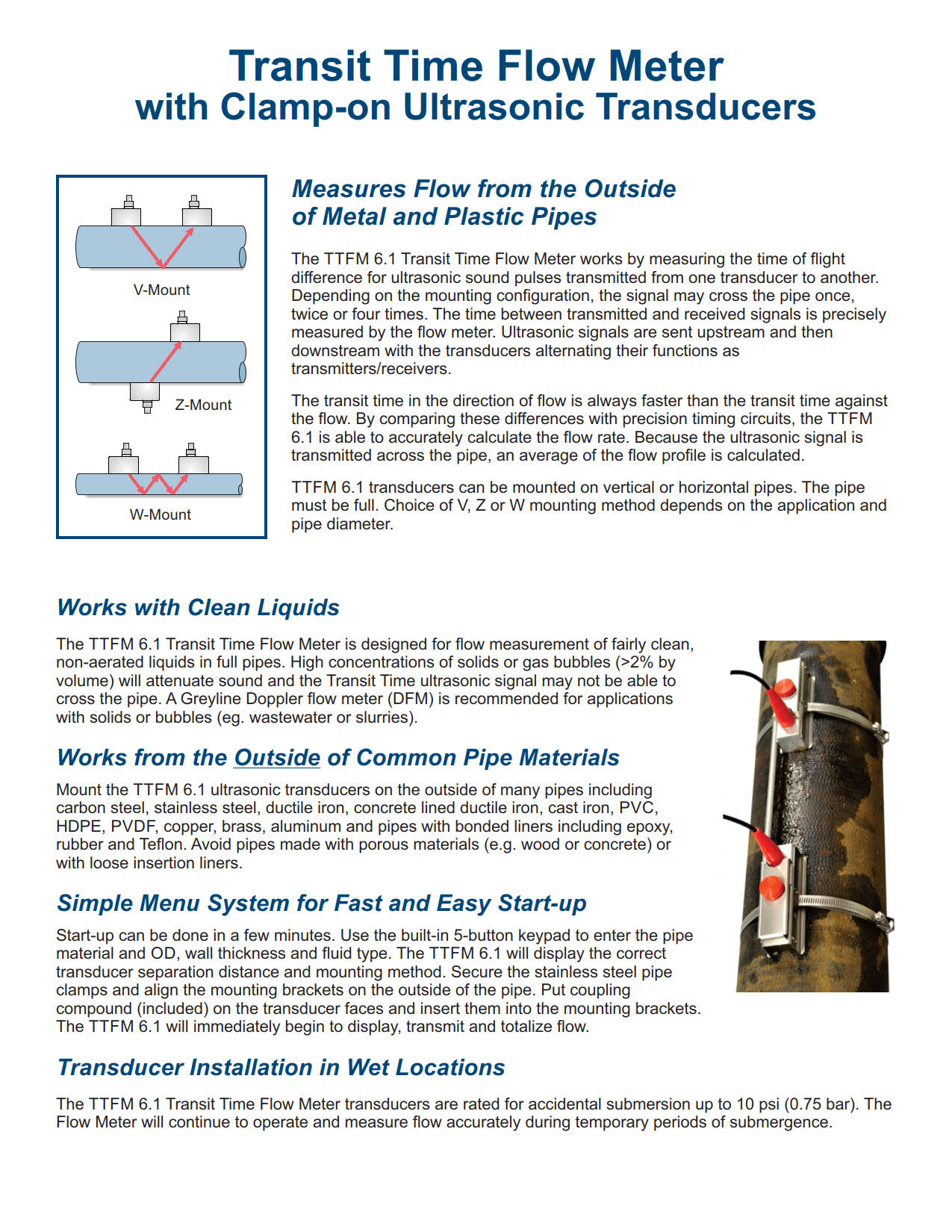 The TTFM 6.1 Transit Time Flow Meter operates by measuring the “transit time” or “time of flight” for ultrasonic sound pulses transmitted from one transducer to another. Depending on the mounting configuration, the signal may cross the pipe once, twice or four times. To measure flow the transit time is compared between ultrasonic signals travelling upstream and downstream.