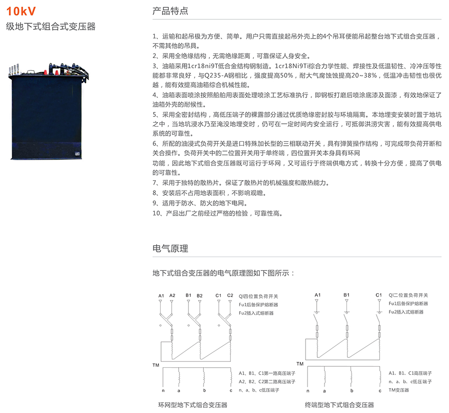 地下式组合变压器是一种将变压器、高压负荷开关和保护用溶断器等安装在油箱之中的紧凑型组合式配电设施。地下式组合变压器安装时置于地坑之中,具有不占用地表空间、可以在一定时间内浸没在水中运行、免维护等特点。由于以上特点,它在北美地区得到了广泛的应用。我国人口众多,城市人口密度大,采用地下式组合变压器对于节约城市配电设施占地面积、提高城市土地利用率具有重要意义,因此在城网改造和建设中有广泛的应用价值。