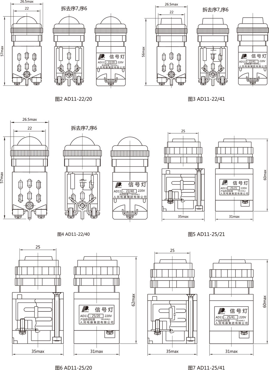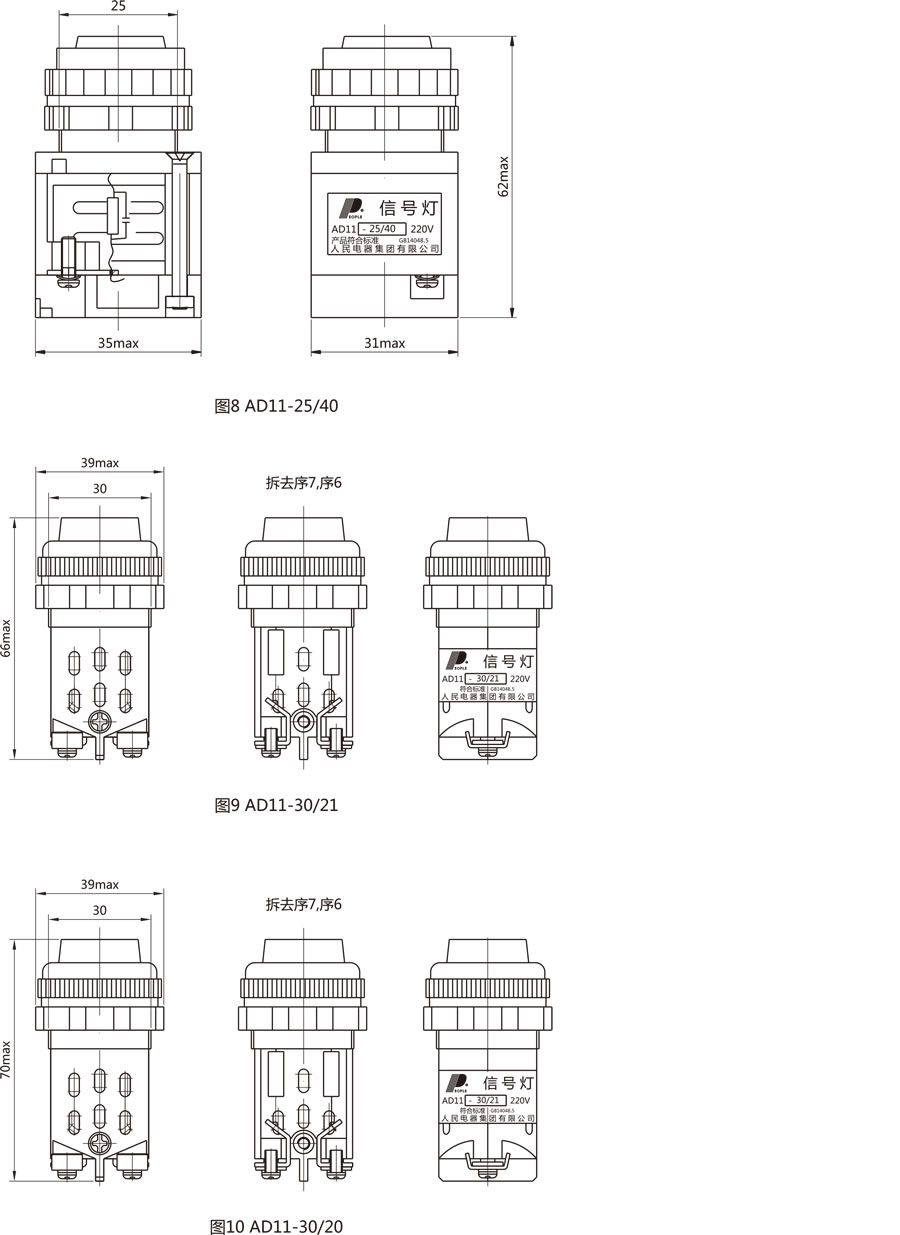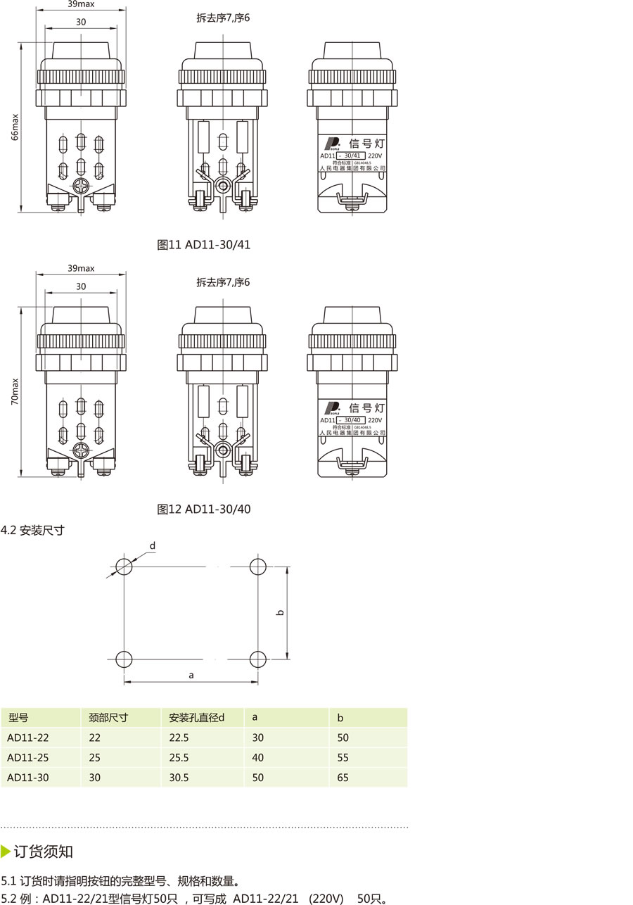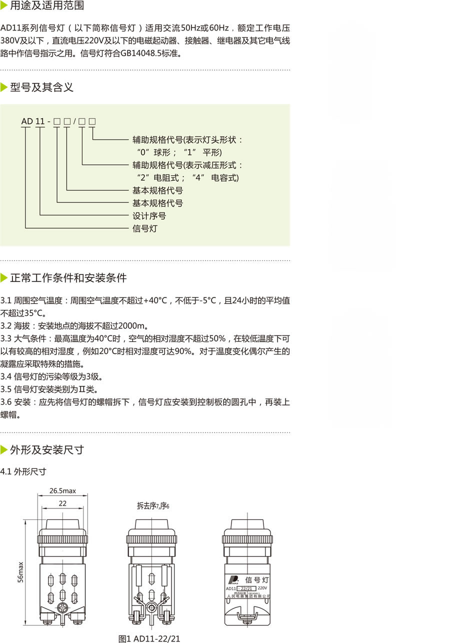 AD11系列信号灯(以下简称信号灯)适用交流50Hz或60Hz,额定工作电压380V及以下,直流电压220V及以下的电磁起动器、接触器、继电器及其它电气线路中作信号指示之用。