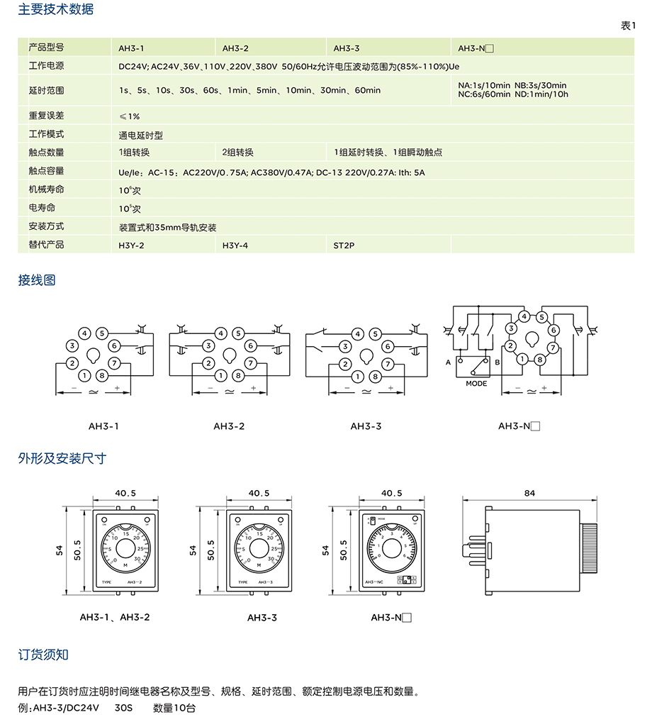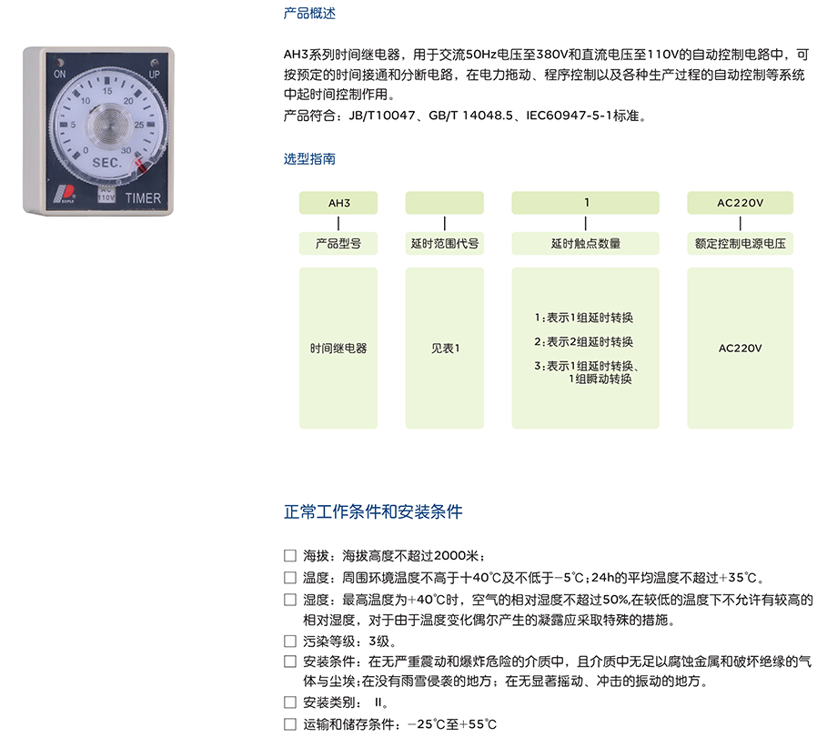 AH3系列时间继电器,用于交流50Hz电压至380V和直流电压至110V的自动控制电路中,可按预定的时间接通和分断电路,在电力拖动、程序控制以及各种生产过程的自动控制等系统中起时间控制作用。