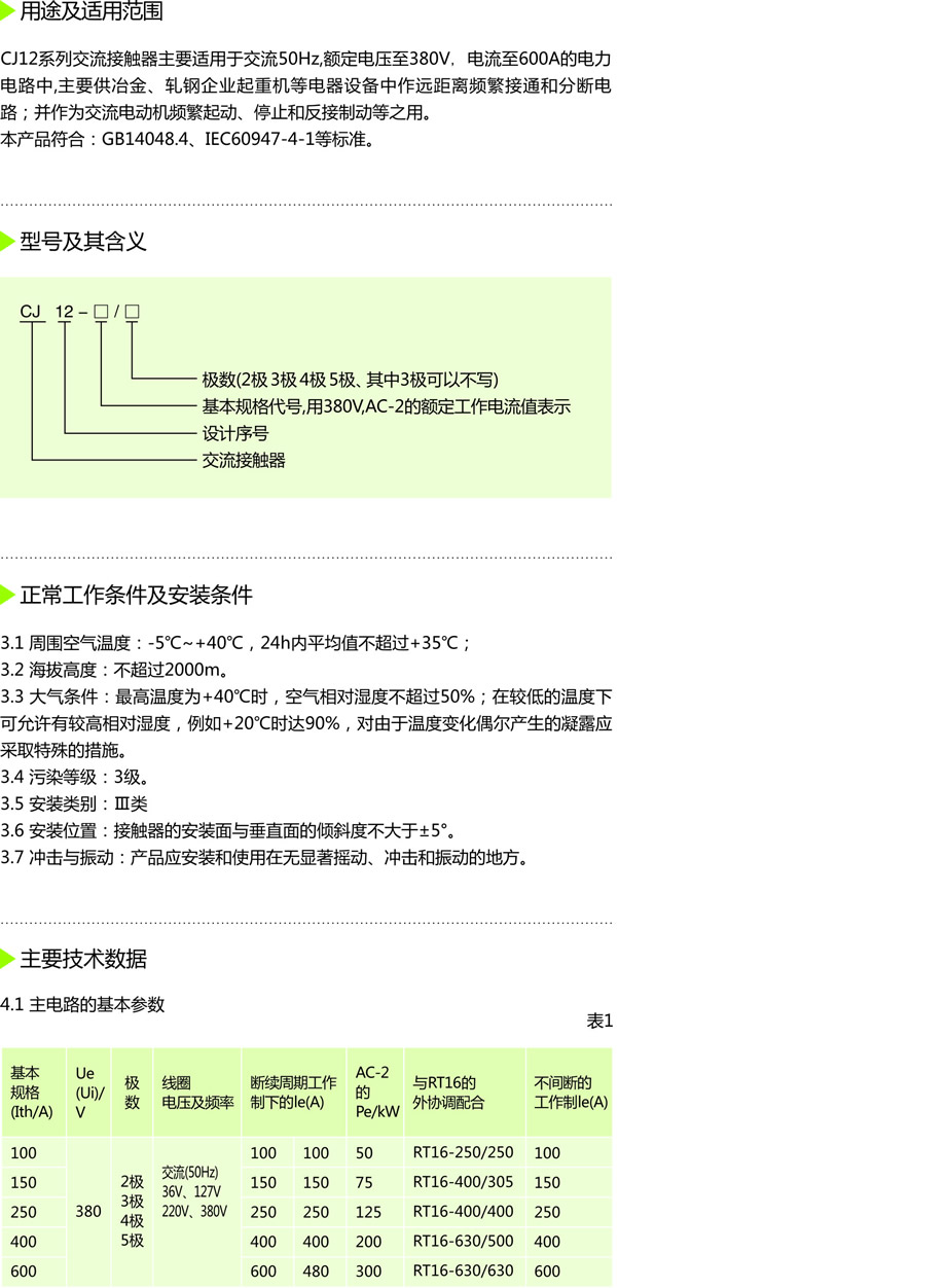 CJ12系列交流接触器主要适用于交流50Hz,额定电压至380V,电流至600A的电力电路中,主要供治金、轧钢企业起重机等电器设备中作远距离频繁接通和分断电路;并作为交流电动机频繁起动、停止和反接制动等之用。