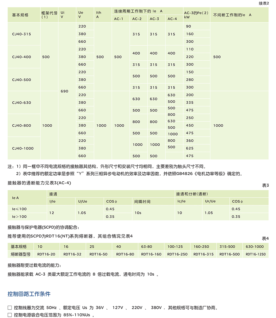CJ40系列交流接触器适用于交流50Hz或60Hz、额定电压至690V、电流至1000A的电力系统中接通与分断电路,并与适当的热继电器或电子式保护装置组合成电动机起动器,以保护可能发生过载的电路。