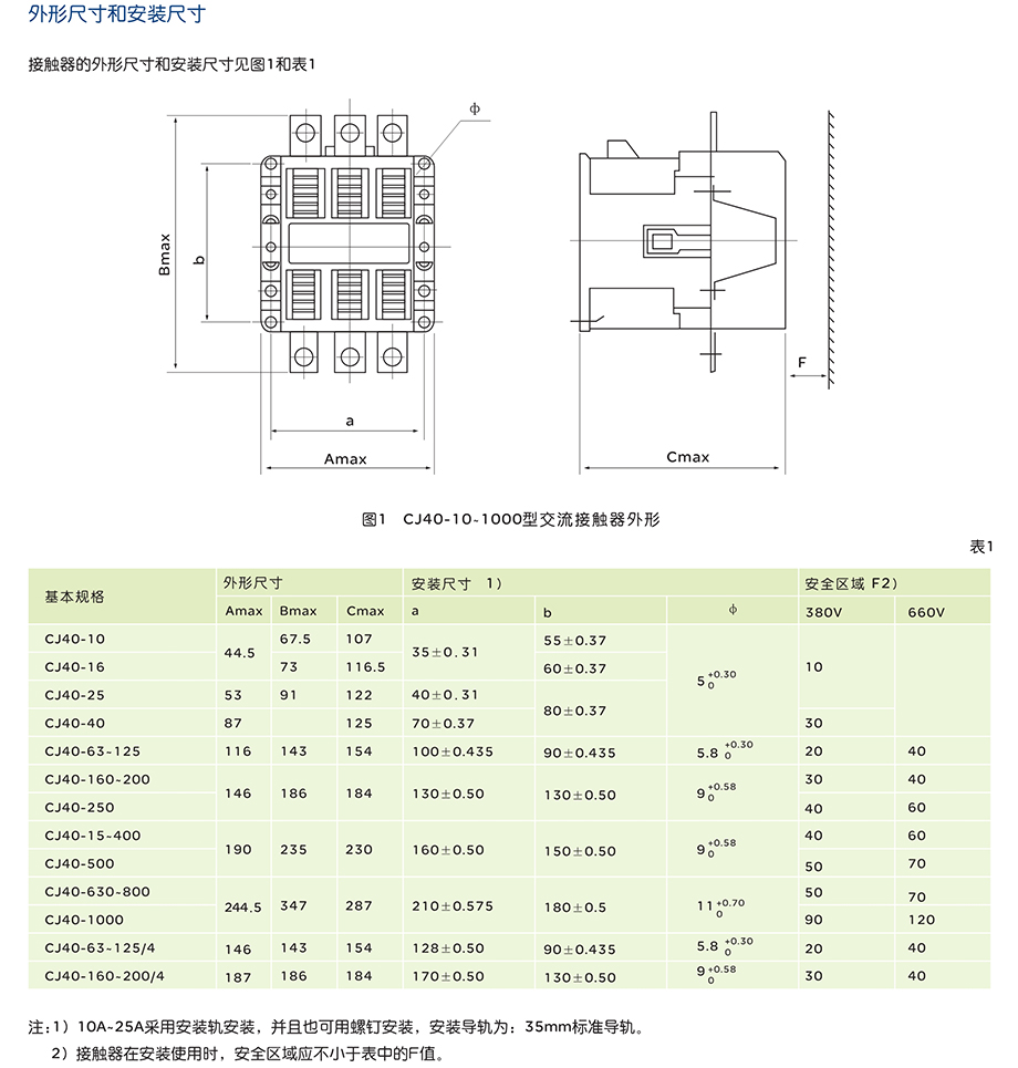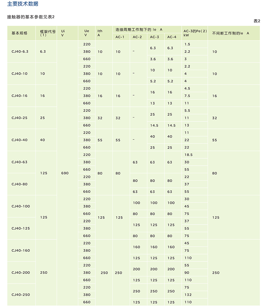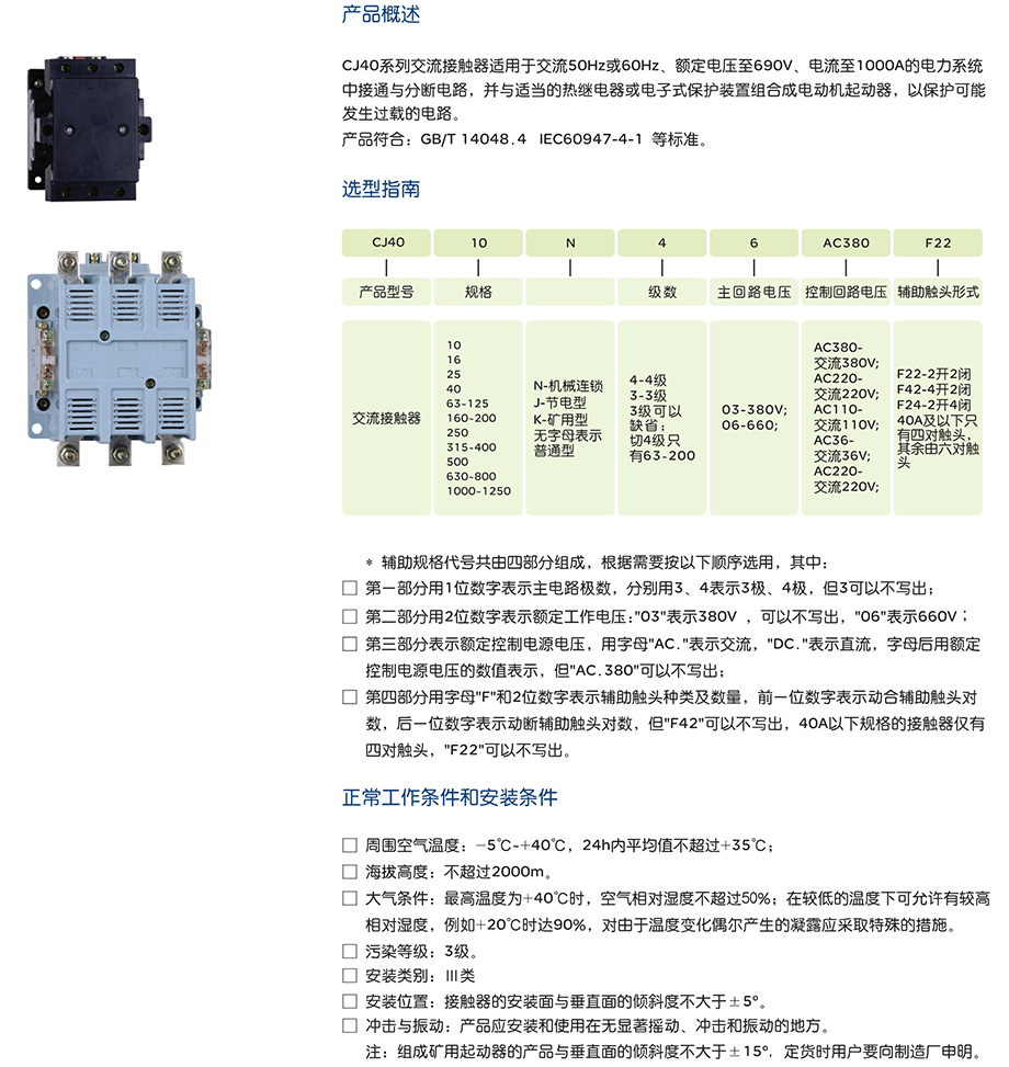 CJ40系列交流接触器适用于交流50Hz或60Hz、额定电压至690V、电流至1000A的电力系统中接通与分断电路,并与适当的热继电器或电子式保护装置组合成电动机起动器,以保护可能发生过载的电路。