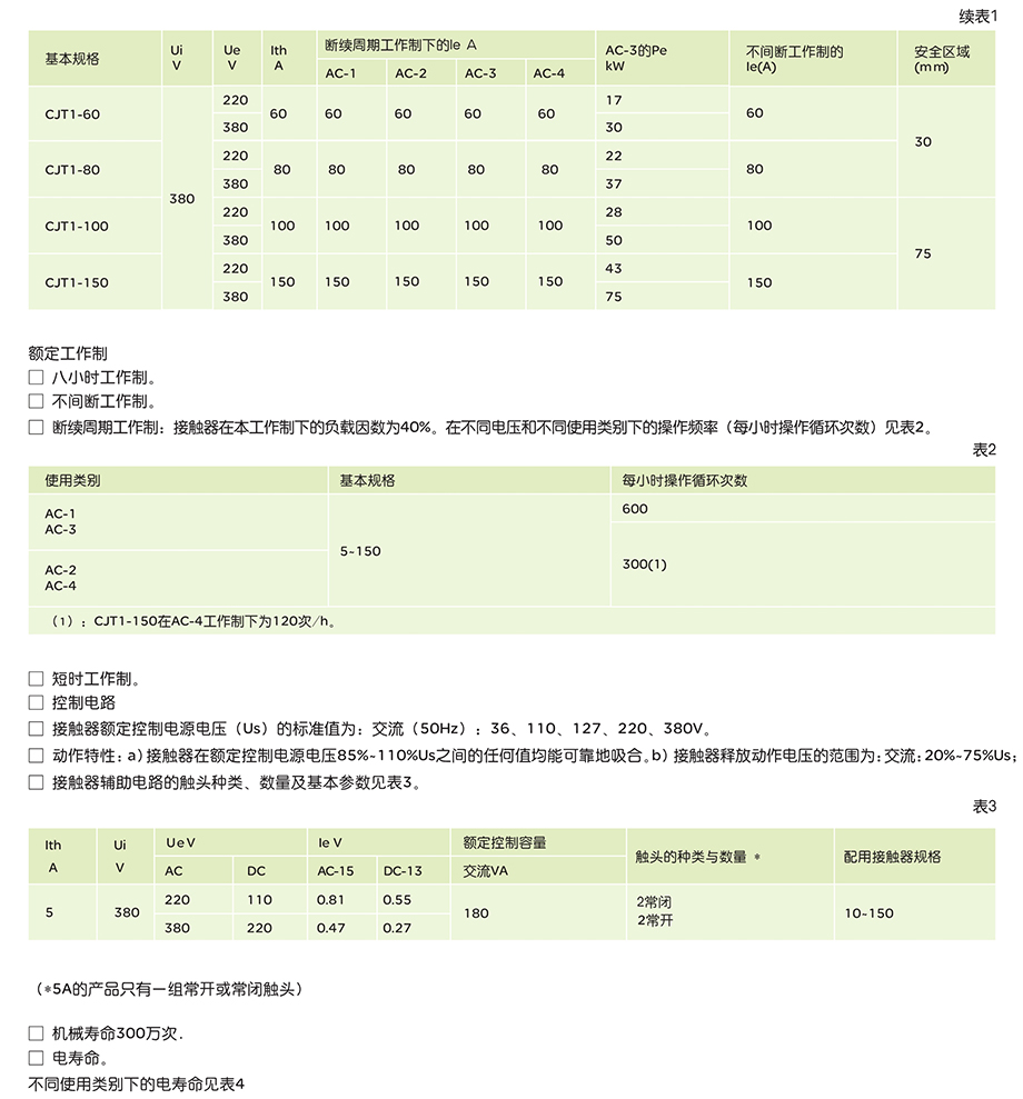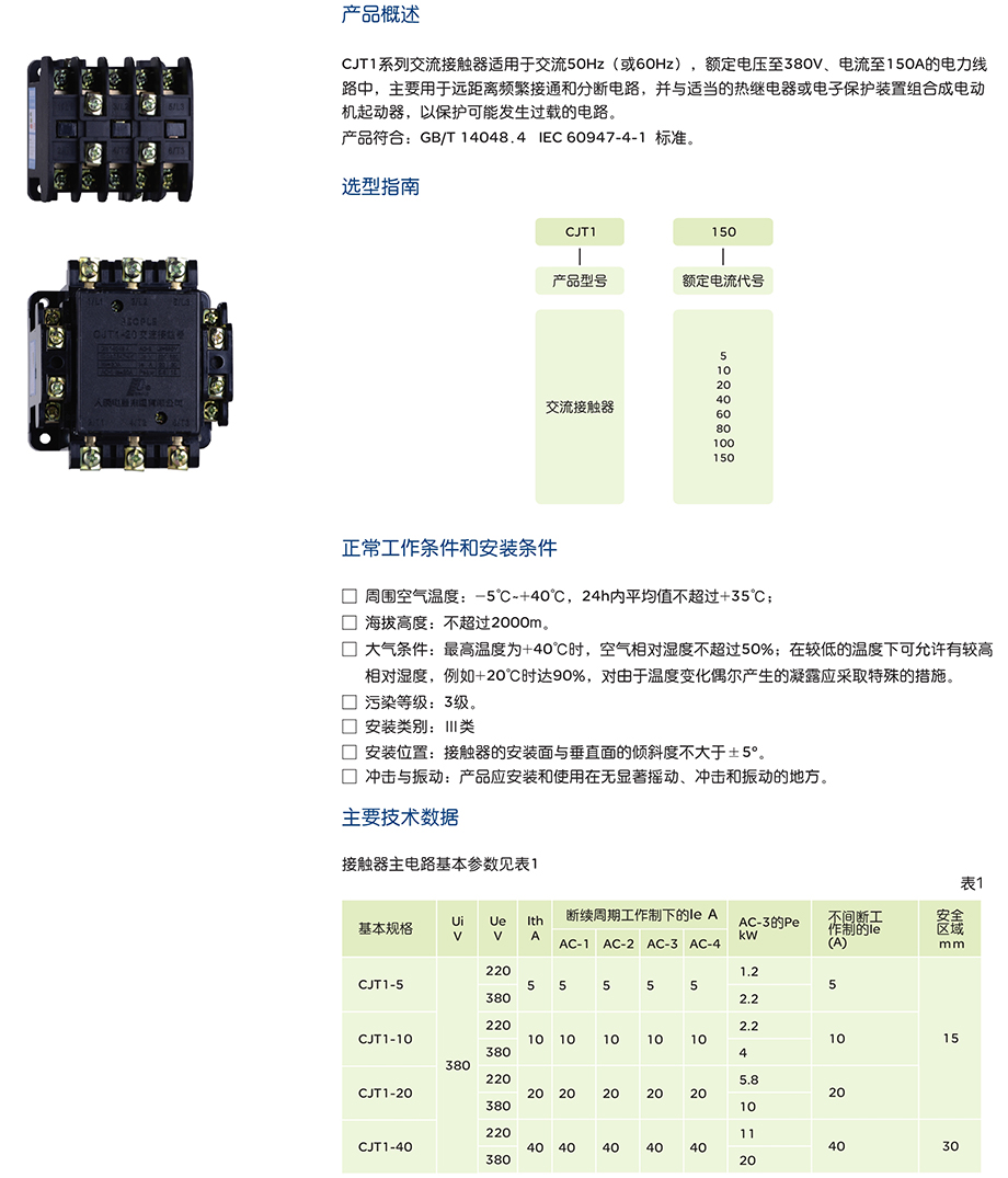 CJT1系列交流接触器适用于交流50Hz(或60Hz),额定电压至380V、电流至150A的电力线路中,主要用于远距离频繁接通和分断电路,并与适当的热继电器或电子保护装置组合成电动机起动器,以保护可能发生过载的电路。